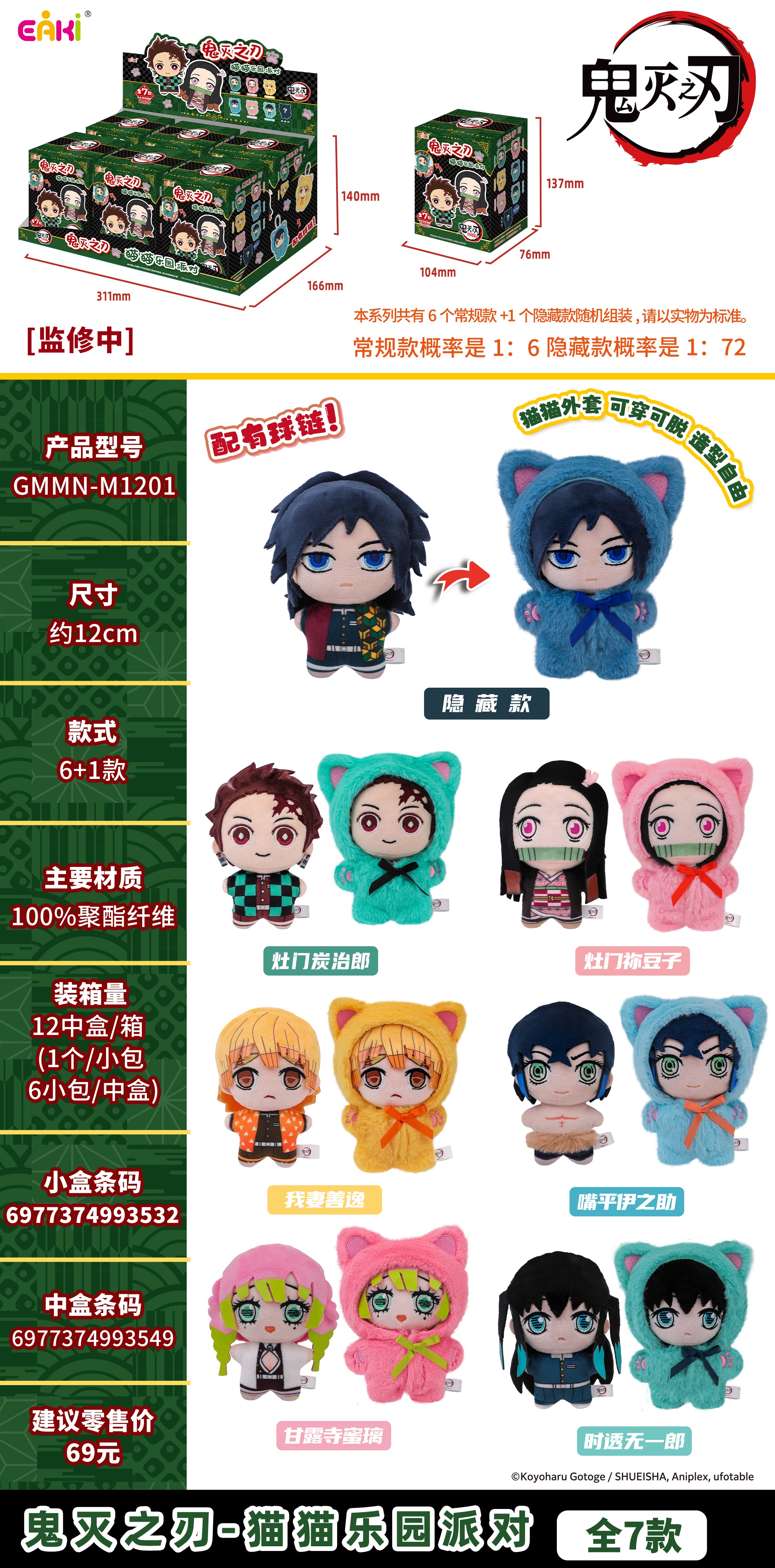 亿奇 鬼灭之刃 猫猫乐园派对 毛绒挂件 全7种 6只/盒 盲盒