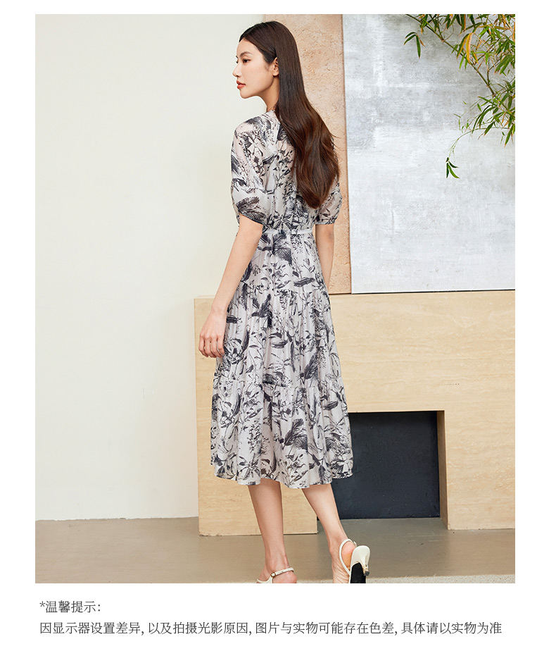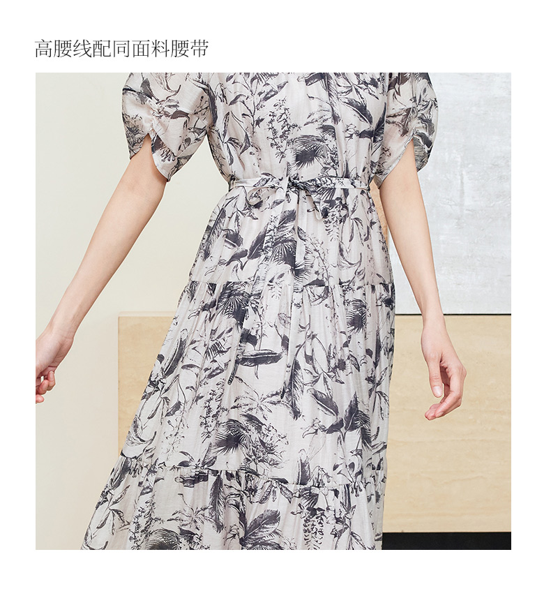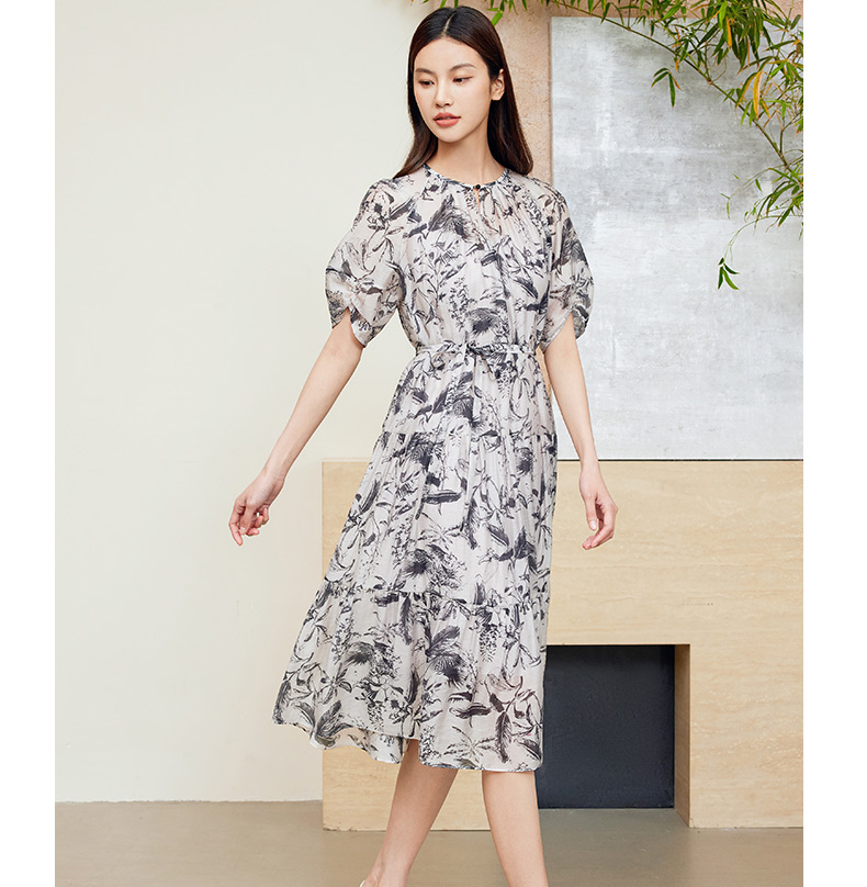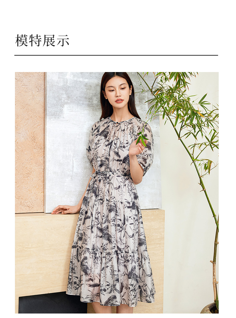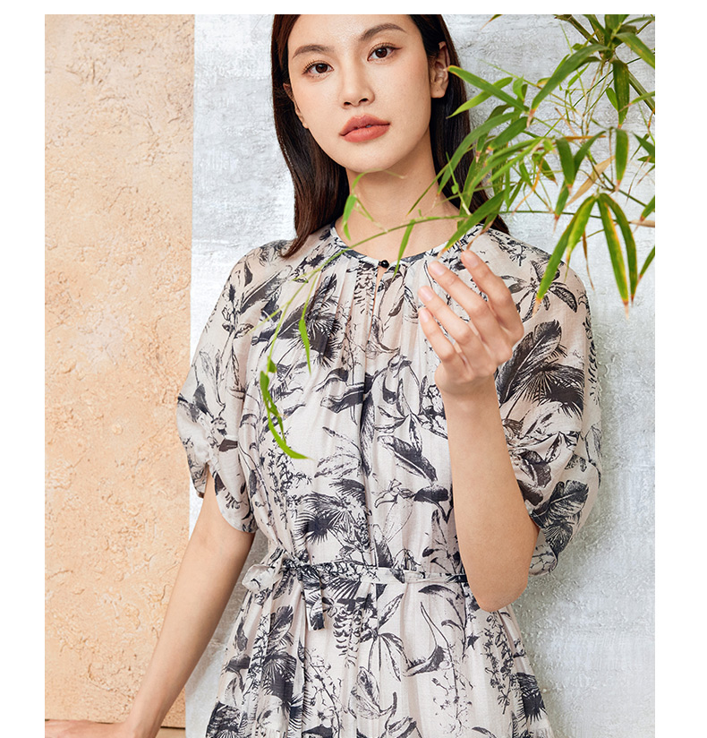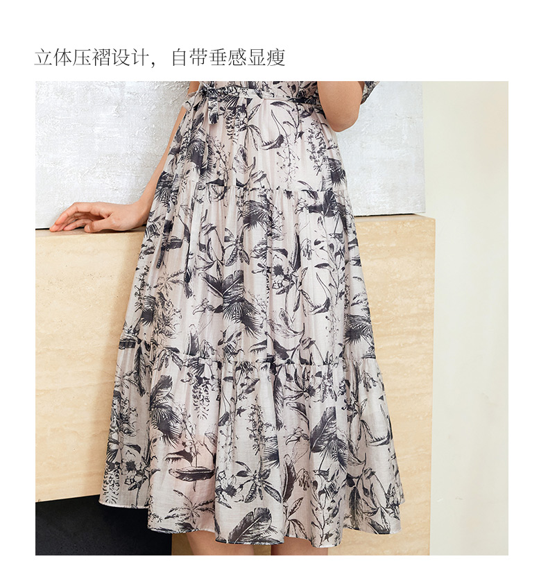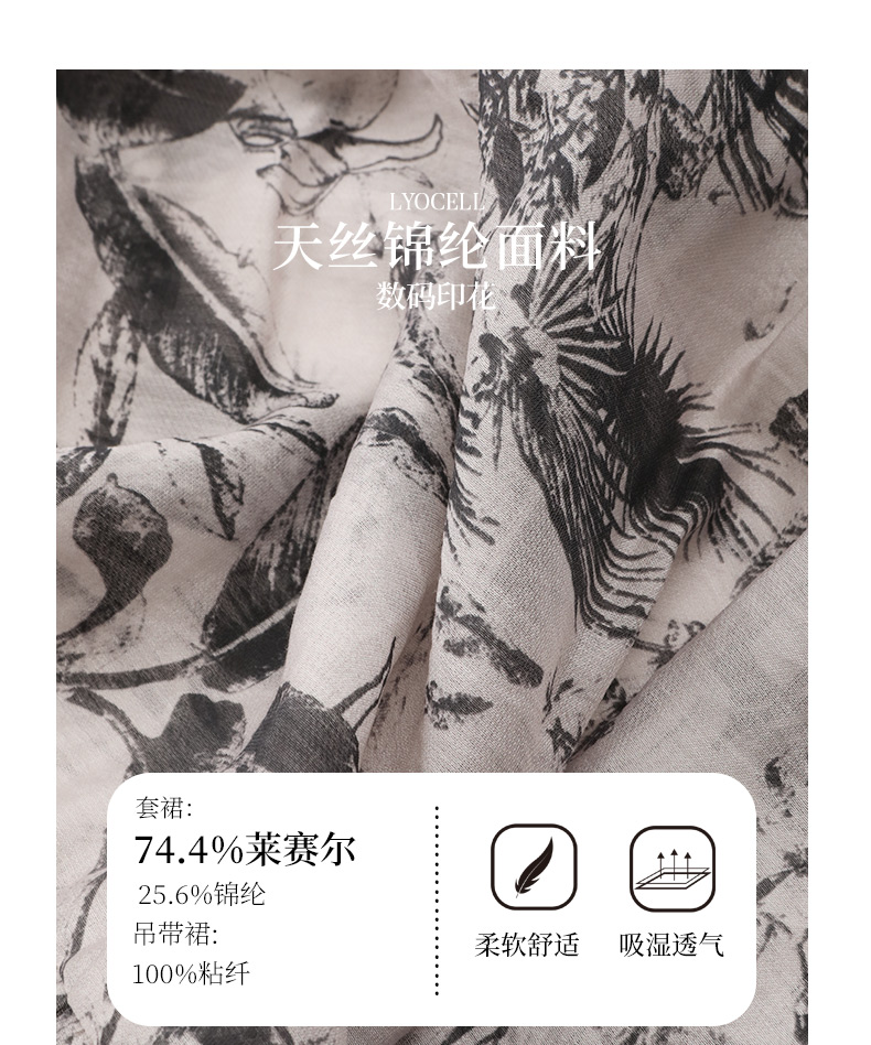 玳莎系带收腰宽松天丝连衣裙24夏款新品复古印花圆领两件套吊带裙 EB35105