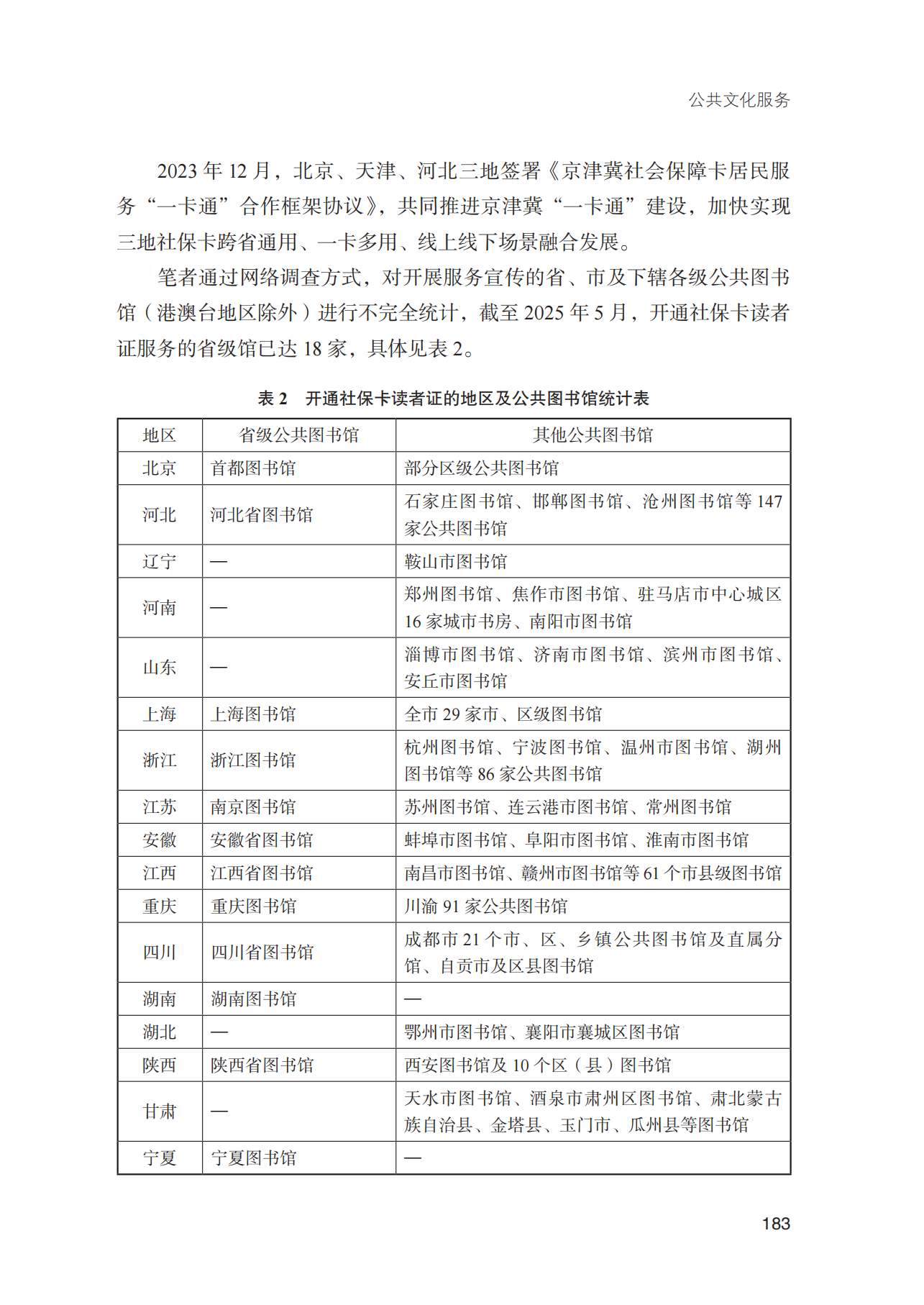 名家专栏003 建设中国特色世界一流公共图书馆 李国新015 图书馆;十五五规划的科学编制 :理论与实践对接 柯 平 刘倩雯 刘 悦029 公共图书馆;十五五创新发展的几个关键问题 初景利公共图书馆高质量发展039;数字藏品 十 阅读推广的创新模式研究以国家图书馆少儿图书为例 郝 瀚049 区域协调发展视域下公共图书馆面向特殊群体服务的困境与探索 胡 波059 区域协调视角下公共图书馆老年人数字素养教育的特色、困境与策略 文 琴 梁 晨 巩赫欣071 智慧图书馆背景下公共图书馆图书盘点工作发展路径探析以首都图书馆为例 李 光083 图书馆讲座工作对传统文化传承与创造性发展的探索与实践以国家图书馆;非遗讲座月为例 潘常青093;馆中馆模式下传承非遗的实践总结与提升策略基于北京城市图书馆非遗文献馆的案例分析 李 倩105 新质生产力赋能公共图书馆数字阅读推广研究 王雪屏115 新质生产力赋能图书馆文献视觉化阅读推广的问题整合与启示 贾 蔷 张 颖 王雪屏 李雅莲 吴彦然公共文化服务129 数字化转型中公共图书馆少年儿童阅读服务创新探究以北京城市图书馆少年儿童馆为例 刘雨琪139 数智时代公共图书馆开展阅读推广活动的实践与思考 李小北149 京味文化传承与发展的模式探索与实践以北京市西城区公共文化服务品牌为例 韩 芳 于燕君 崔月强 刘 郑 邱燕红 陈 楠159 从;文化下乡到;文化扎根:县域公共图书馆助力社区文化书院服务效能的机制研究 于 宁169 数智时代公共图书馆儿童数智素养培育研究 史宇驰 张 且179 社会保障卡赋能公共图书馆读者服务实践探究 ?于 妍191 基于;图书馆 十 文创背景下首都图书馆的资源开发与利用研究 杨婵馨 徐 玥 卞佳佳馆藏资源建设203 数字资源二次开发背景下馆藏期刊阅读新模式实践探索以潍坊市图书馆为例 姜云龙215 地方文献资源建设中灰色文献的采集与利用以首都图书馆为例 陈 飏文化传承227 图书馆古籍修复纸库资源价值与发展研究 王 岚239 铸牢中华民族共同体意识的理论与实践探索研究以地方志为例 杜冬生文旅融合253 地方文化与阅读推广融合的创新实践研究以滨海新区图书馆汉沽馆区打造;盐渔文化 品牌为例 曹 维263 基于特色馆藏建设的区域红色资源活化利用以北京市西城区红色遗迹旧址为例 刘 郑 韩 芳 崔月强 郝 昆 陈 楠科技前沿277 基于 BERTopic 的数智时代图书馆协作发展机遇与挑战 王颖舟理论研究289 中国儿童阅读政策研究 舒 睿