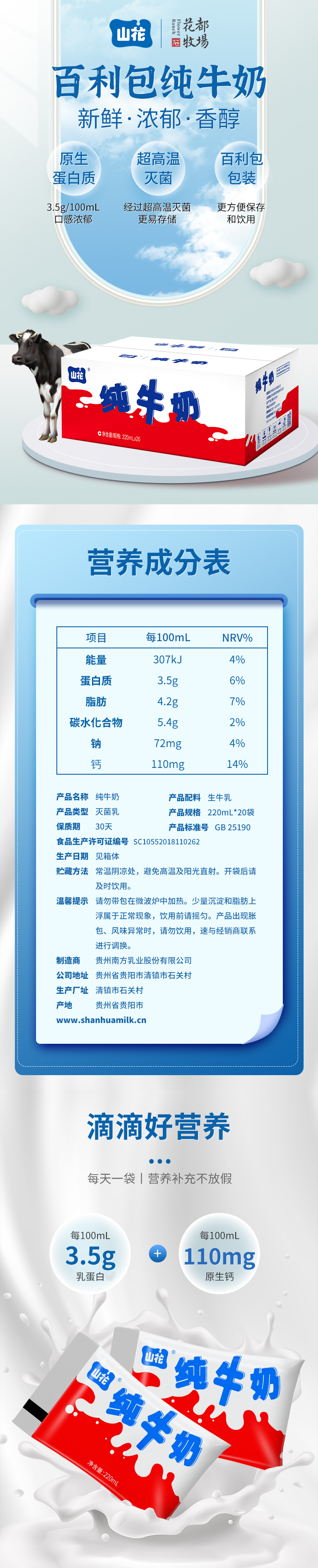 贵州特产山花红色袋装口感新鲜纯牛奶220ml*20袋整箱装贵州老字号