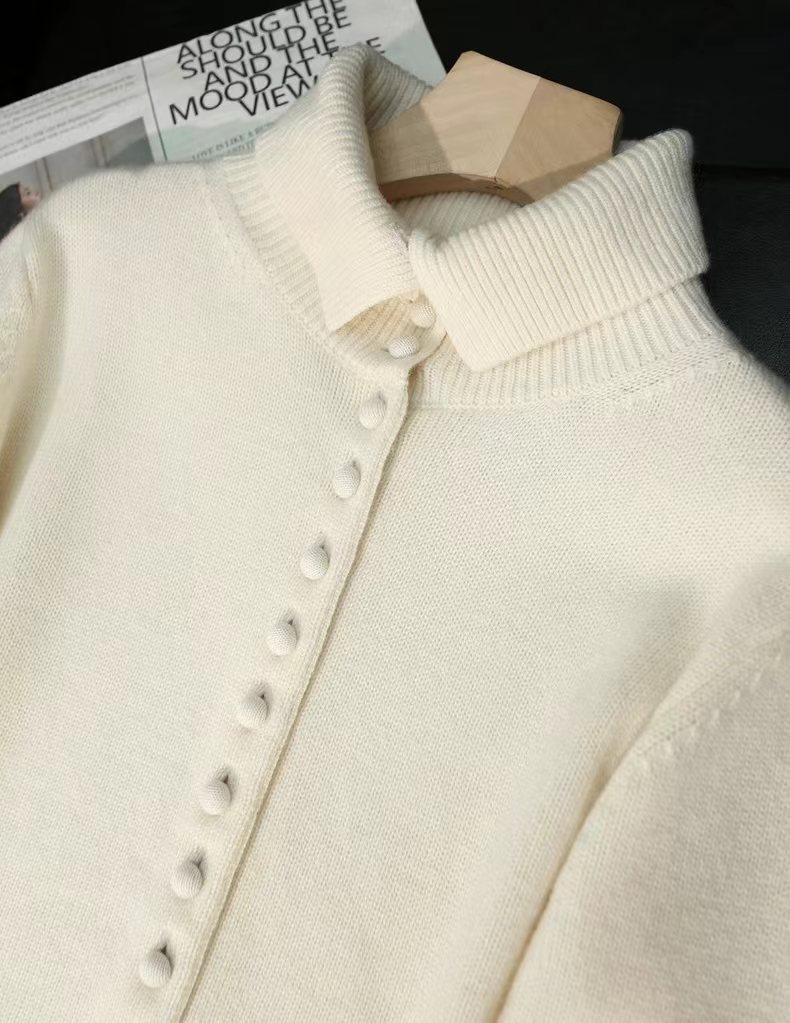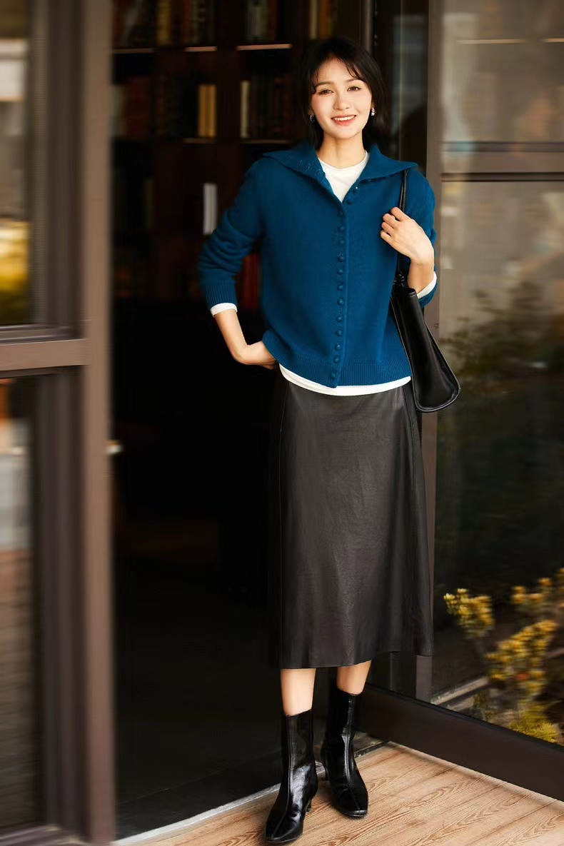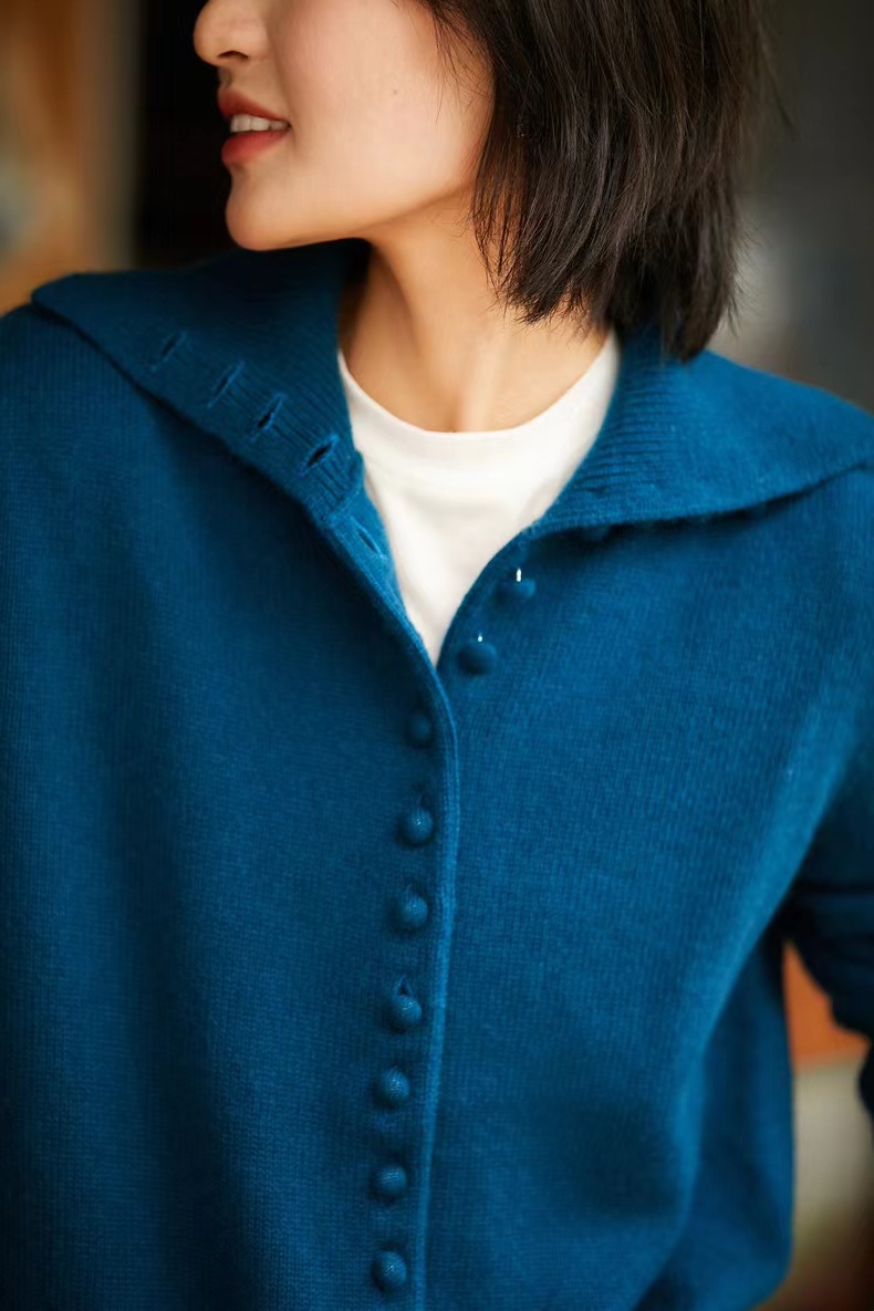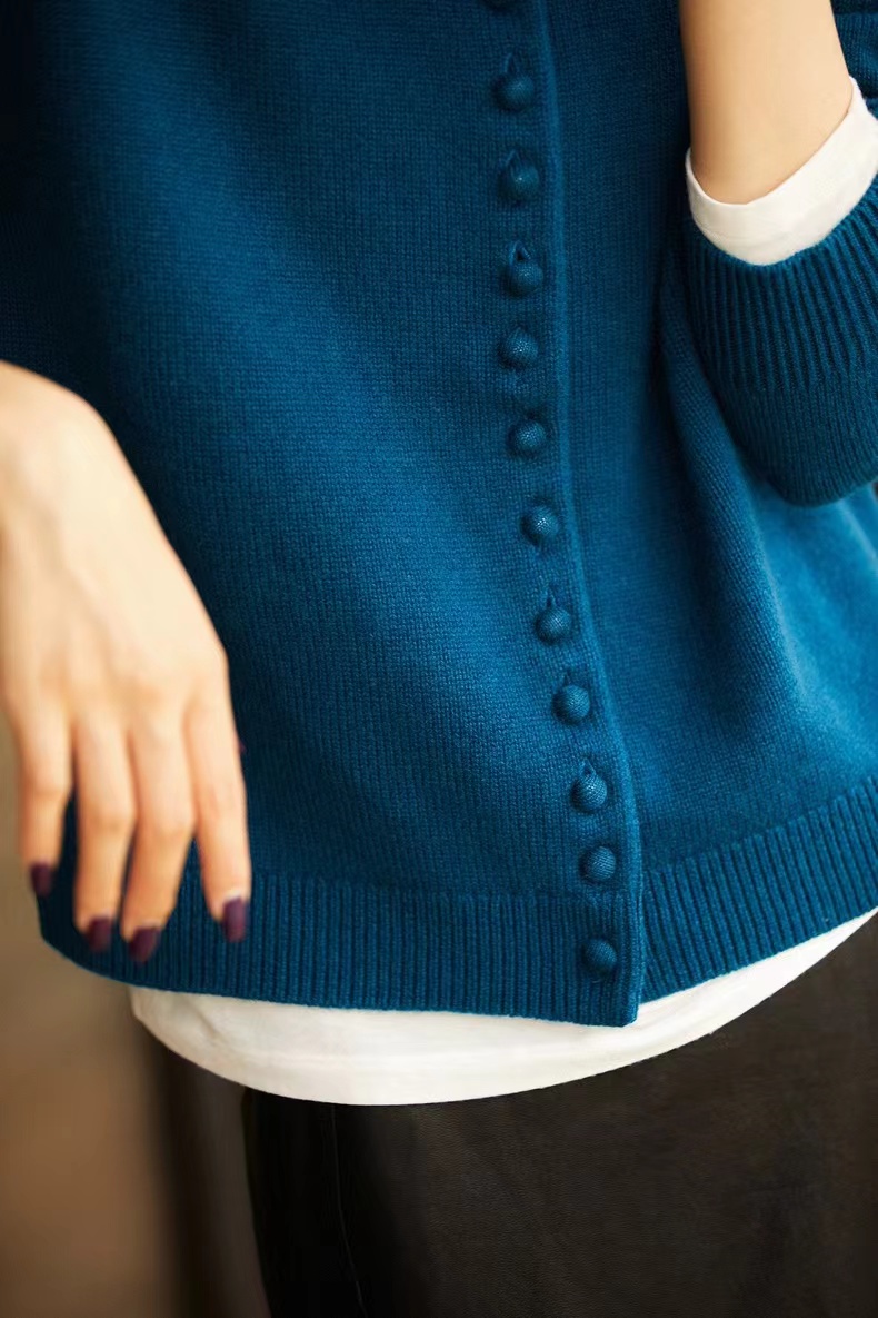 孔雀蓝~冬季新款松软羊毛可立领可翻领纽扣针织开衫毛衣 松软包扣立领针织毛衣开衫!柔软蓬松细腻,舒适包裹在柔软的针织中,天生松'弛慵懒 可休闲随性,也可以轻正式!整体采用偏短款剪裁,利落明快,与袖长形成落差对比,拉高腰线显高显瘦。表面坑条螺纹肌理增加横向弹力,穿着轻松无束缚感。袖口和下摆做了罗纹收口更显利落,而且罗纹织法的稳定性会更好,这样穿着和清洗的时候也不用担心变形问题。纽扣选用与织物相同的纱线手工包裹制成,整体色调与质感保持一致。门襟处纽扣一路延伸至颈部,可根据穿着需求灵活调整领型,既可全扣呈现为包覆性良好的立领造型,增强防风与收束感,亦可敞开翻折,转化为翻领状态,更添松弛气息与造型层次,两种领型切换自如,兼顾实用性与风格变化,为日常穿搭提供更多可能性。无论做打底叠穿还是单穿,都能烘托简约时尚感。