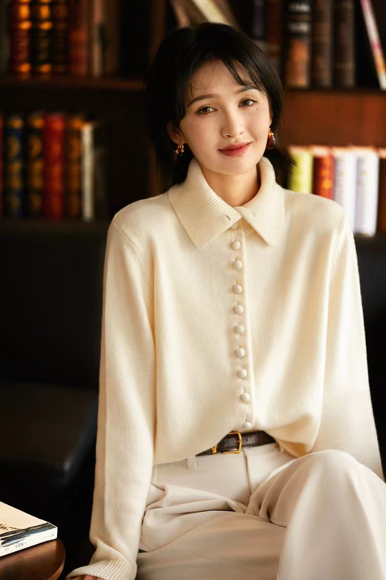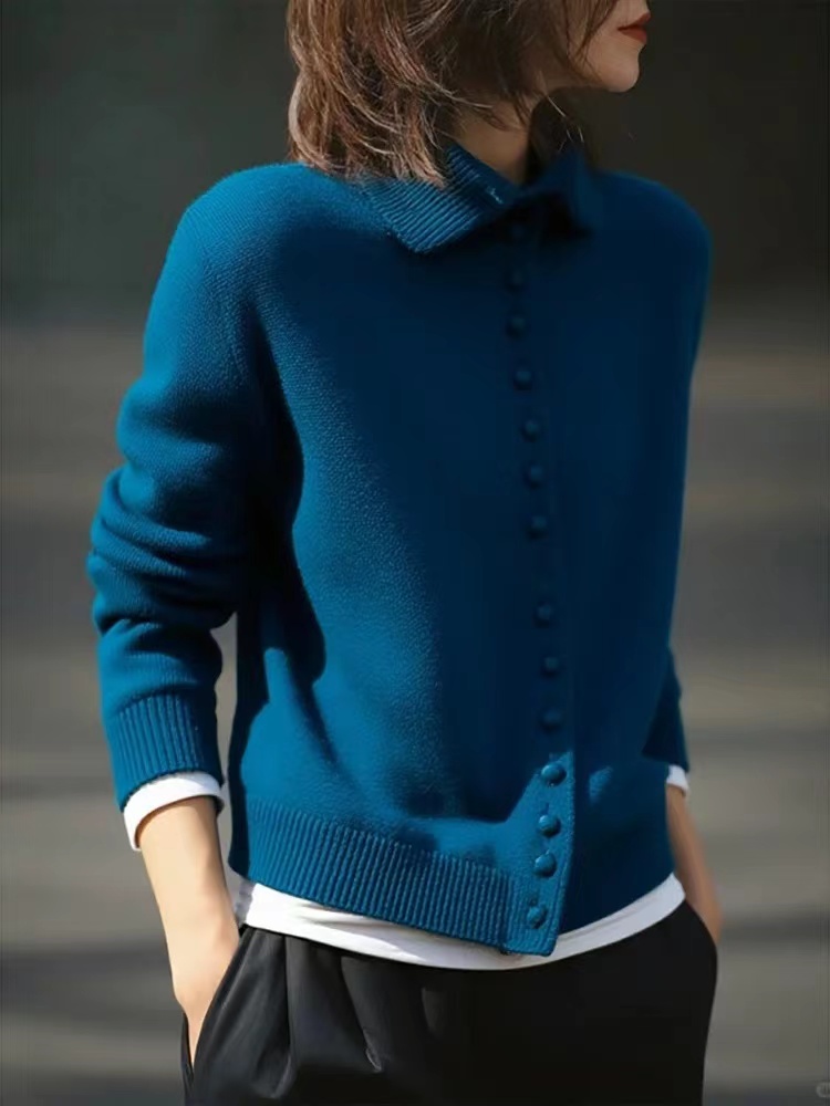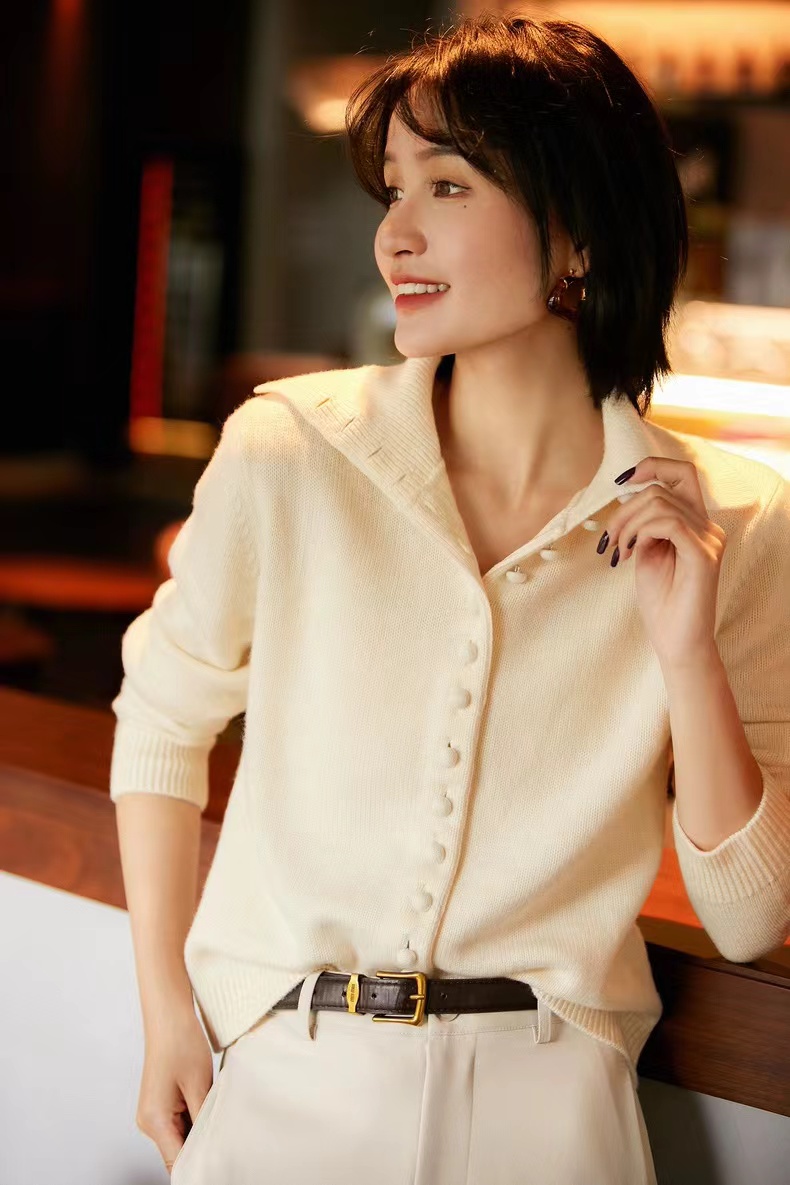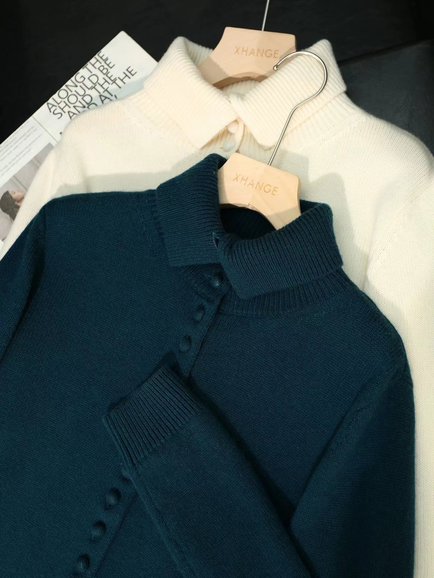 孔雀蓝~冬季新款松软羊毛可立领可翻领纽扣针织开衫毛衣 松软包扣立领针织毛衣开衫!柔软蓬松细腻,舒适包裹在柔软的针织中,天生松'弛慵懒 可休闲随性,也可以轻正式!整体采用偏短款剪裁,利落明快,与袖长形成落差对比,拉高腰线显高显瘦。表面坑条螺纹肌理增加横向弹力,穿着轻松无束缚感。袖口和下摆做了罗纹收口更显利落,而且罗纹织法的稳定性会更好,这样穿着和清洗的时候也不用担心变形问题。纽扣选用与织物相同的纱线手工包裹制成,整体色调与质感保持一致。门襟处纽扣一路延伸至颈部,可根据穿着需求灵活调整领型,既可全扣呈现为包覆性良好的立领造型,增强防风与收束感,亦可敞开翻折,转化为翻领状态,更添松弛气息与造型层次,两种领型切换自如,兼顾实用性与风格变化,为日常穿搭提供更多可能性。无论做打底叠穿还是单穿,都能烘托简约时尚感。