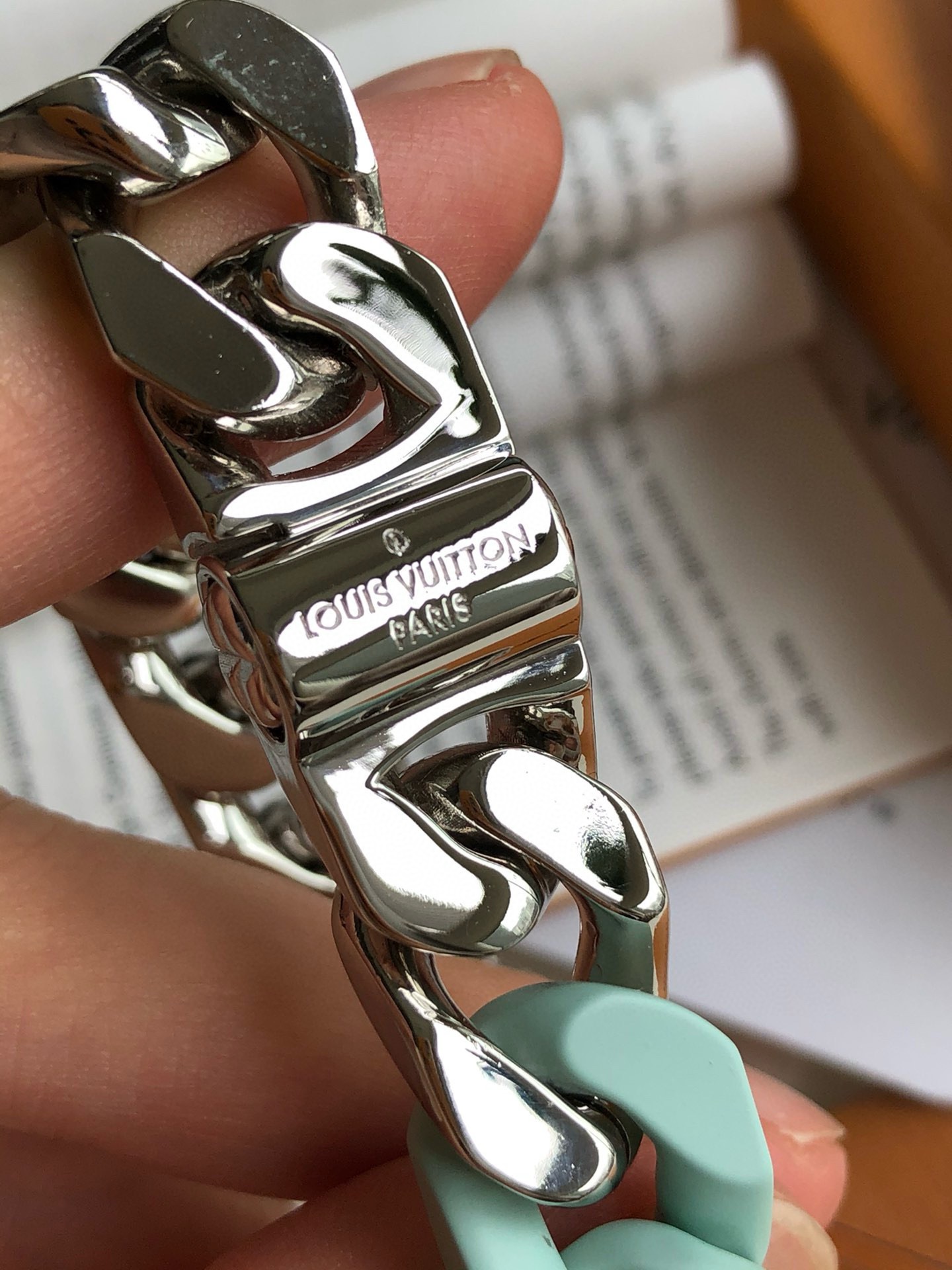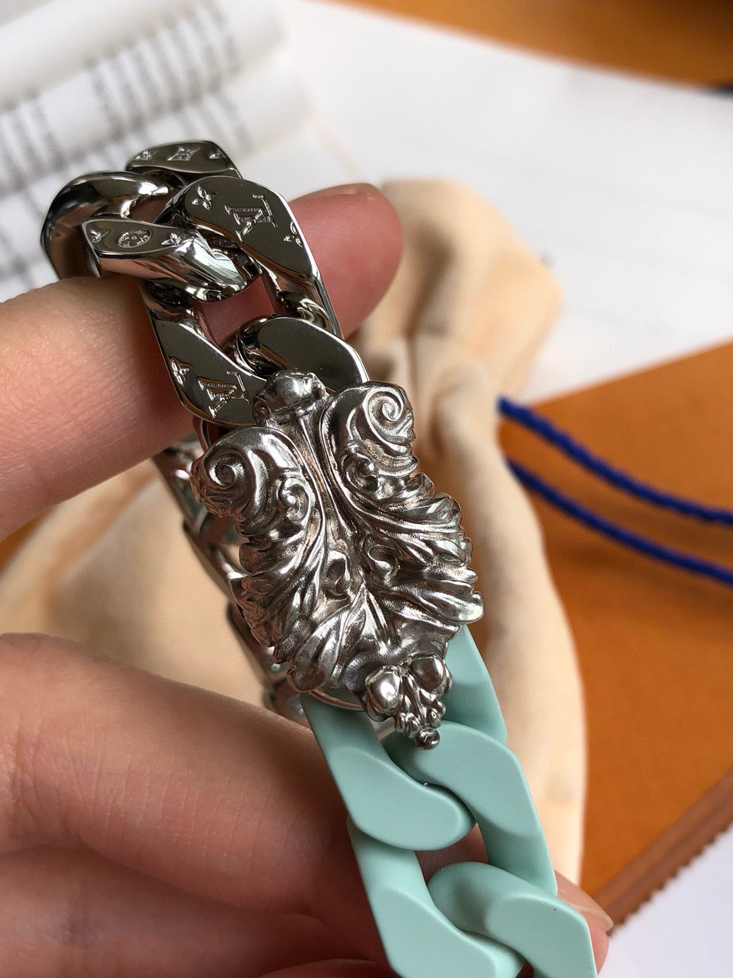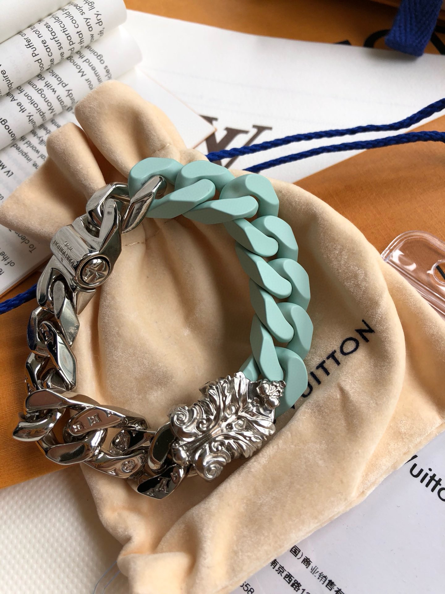 朱一龙同款SCULPTURE 薄荷绿手链!整个欧洲只有10多条!男士作为服饰搭配,轻松塑造率性的潮酷范。LV SCULPTURE 手链,编码:MP2630,官网同步在售¥11600人民币!LV Sculpture 项链重绎 2024 春夏系列设计,拼接 Monogram 铭纹链条与粉彩色调陶瓷元素,以宛若恢弘楼宇的结构致敬巴黎豪斯曼风格建筑。该系列另有同款手链可选。详细特征:金属件-镂刻 Monogram 图案-镂刻注册商标 R 标识-“路易威登”英文字样!