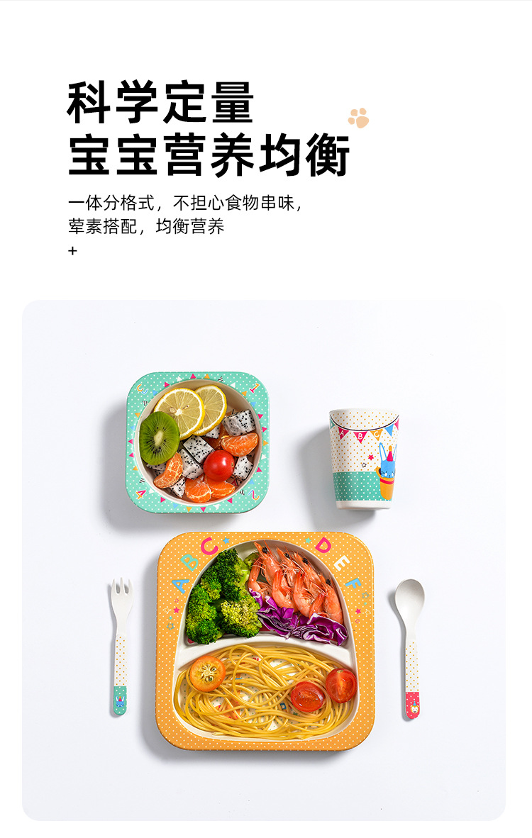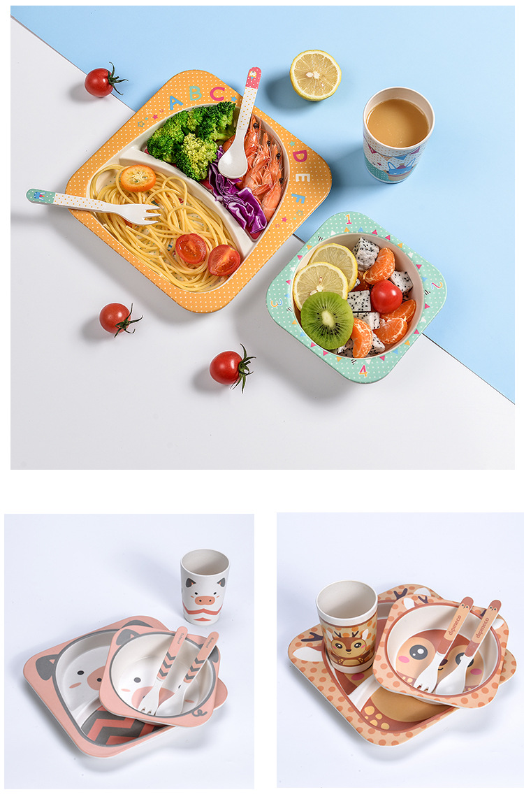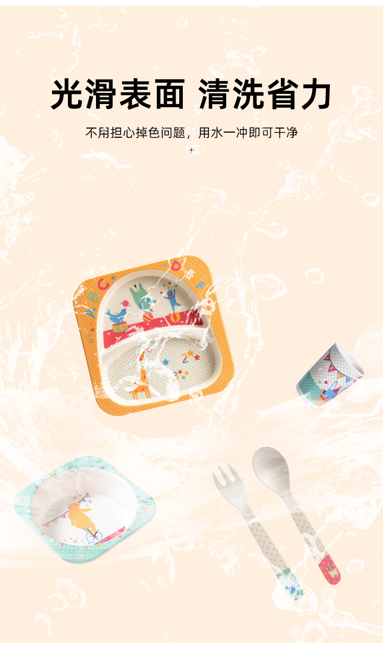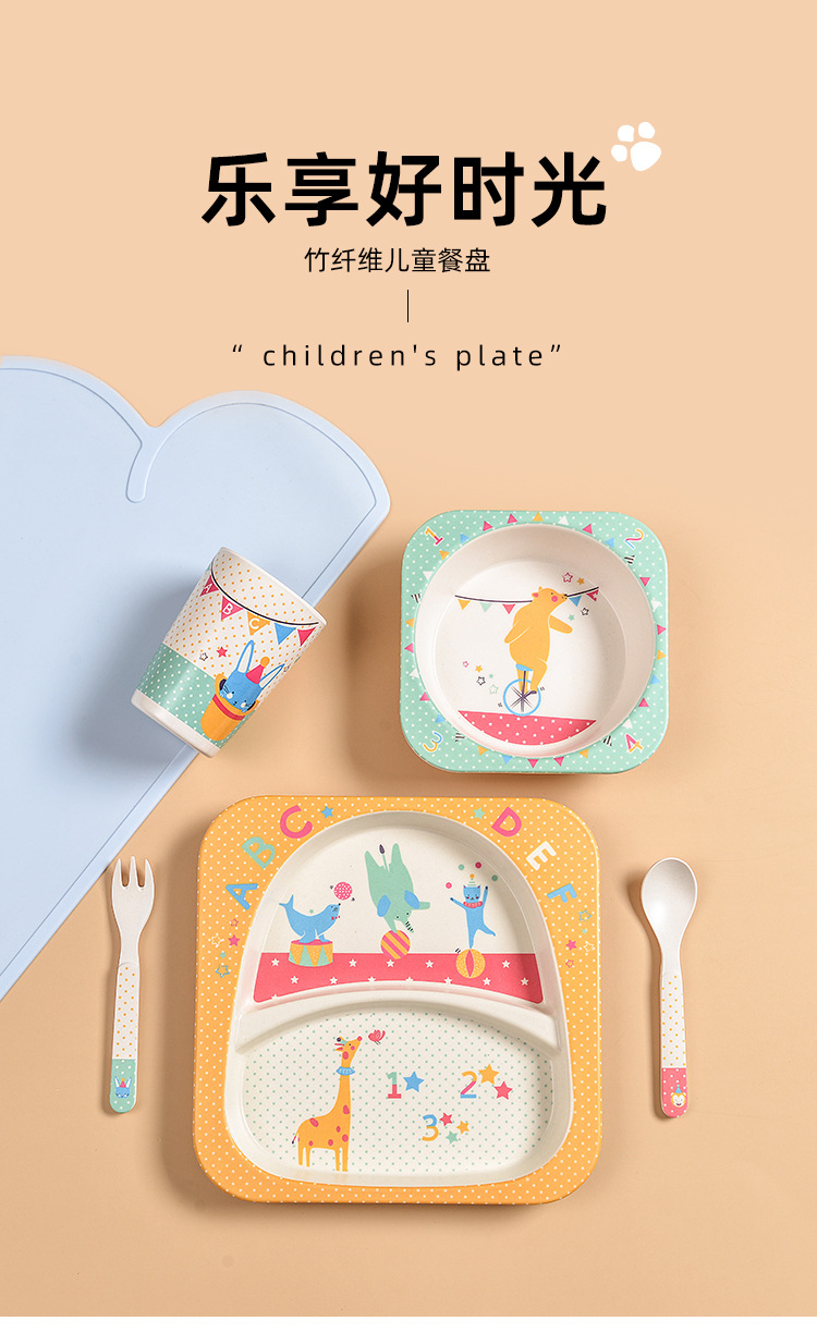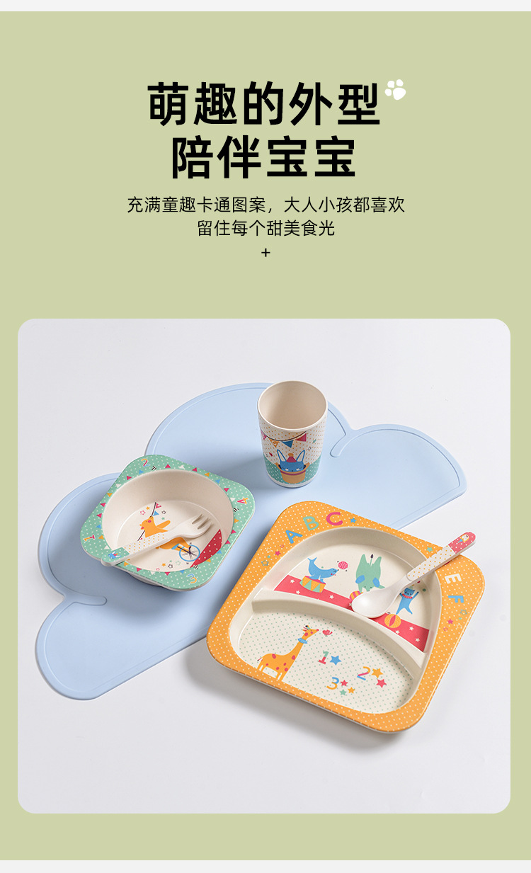 【儿童餐盘】竹纤维儿童餐具套装 创意卡通碗分格餐盘勺叉杯子五件套