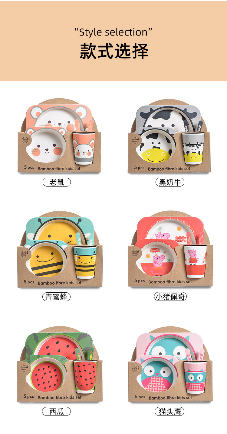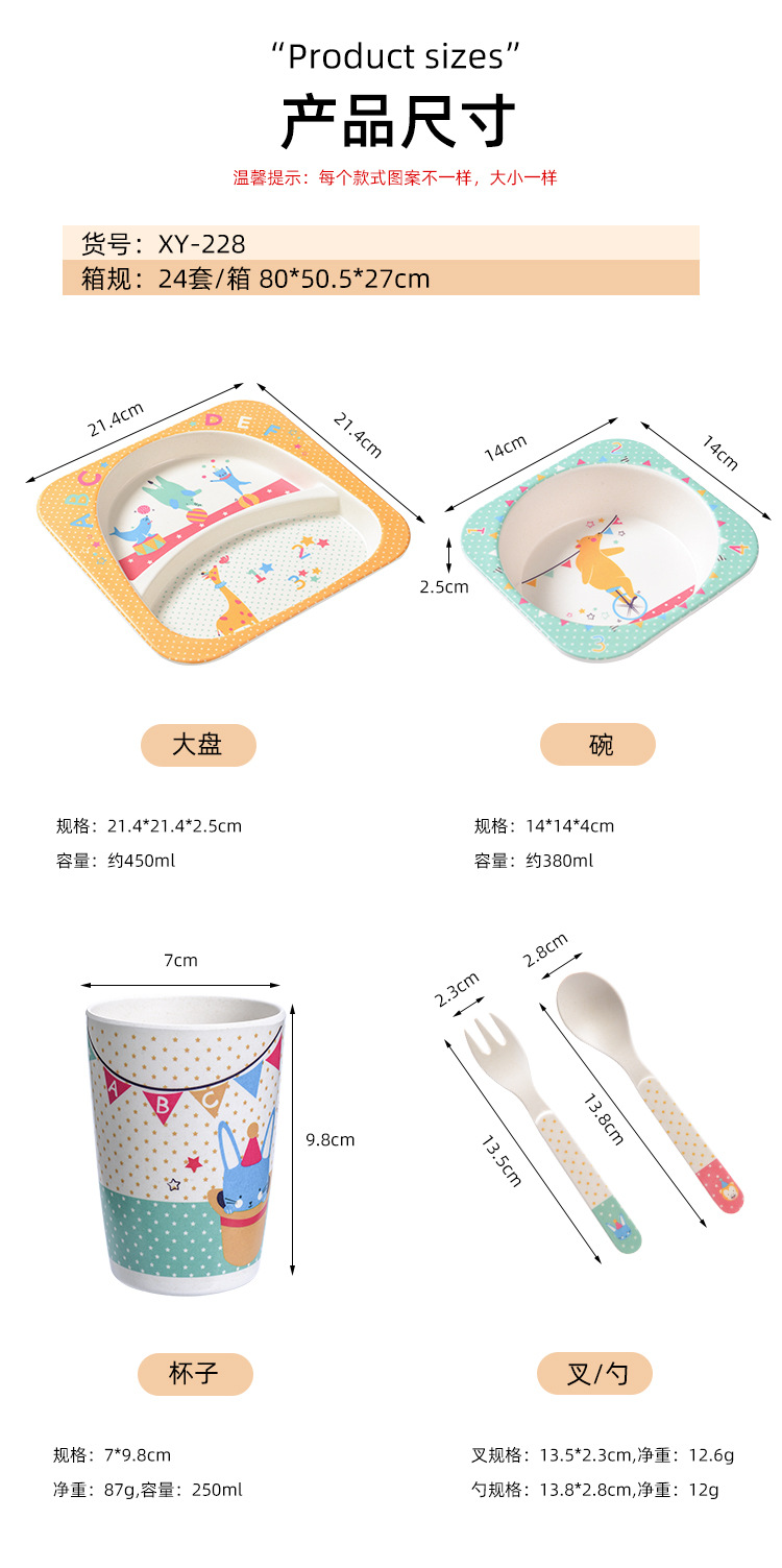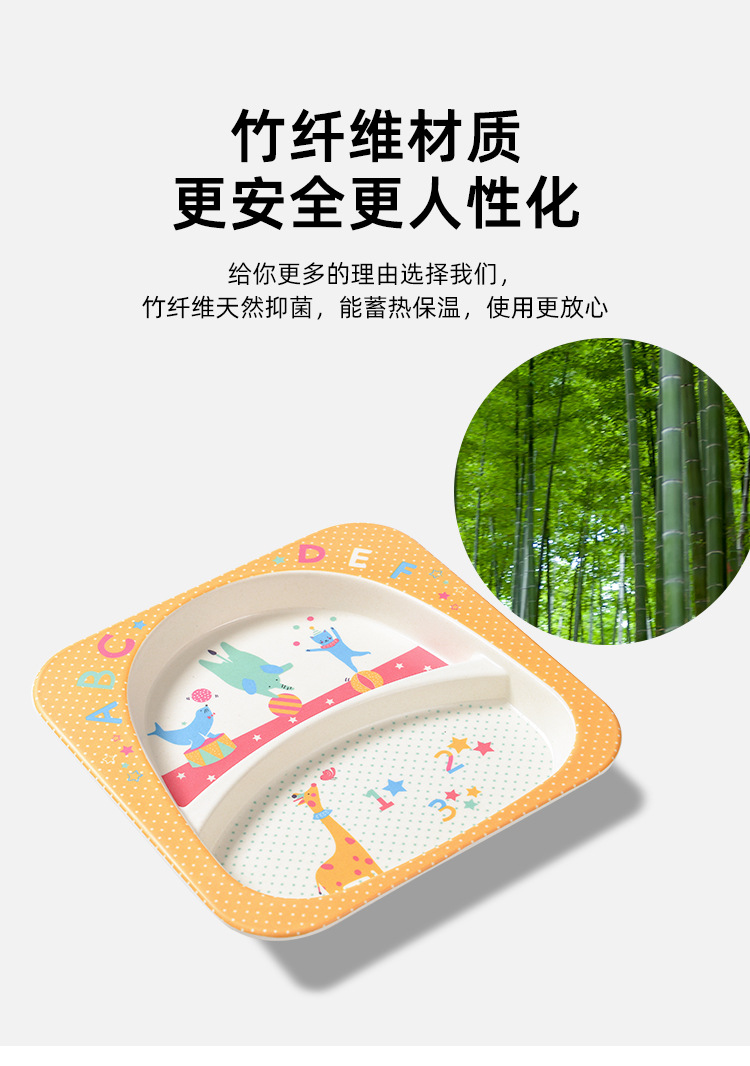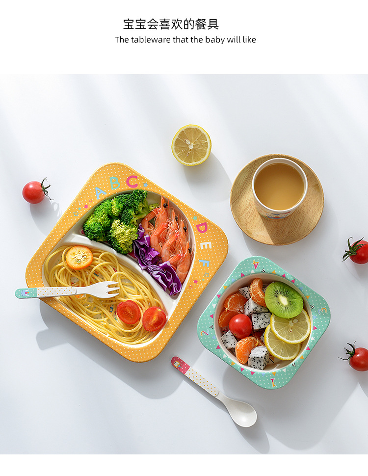 【儿童餐盘】竹纤维儿童餐具套装 创意卡通碗分格餐盘勺叉杯子五件套