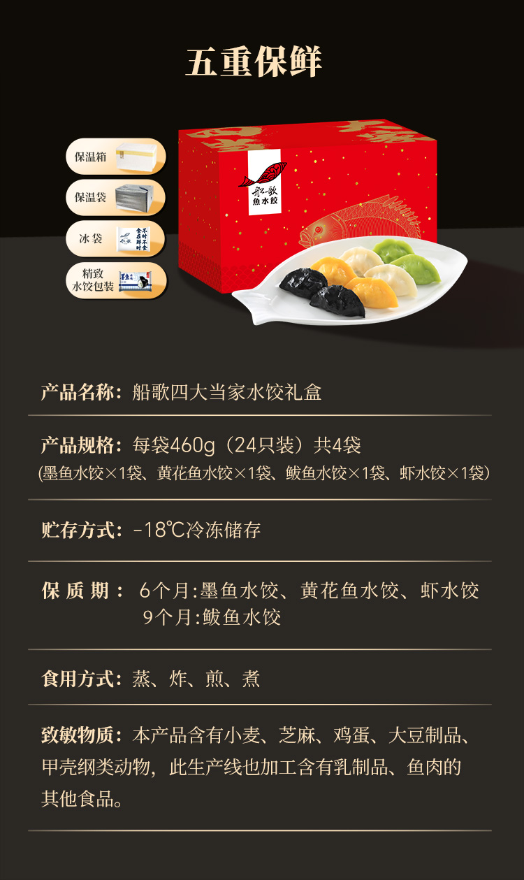 [家庭装礼盒]墨鱼\黄花鱼/鲅鱼/虾口味组合水饺礼盒-24颗每袋/460g*4【船歌鱼水饺】