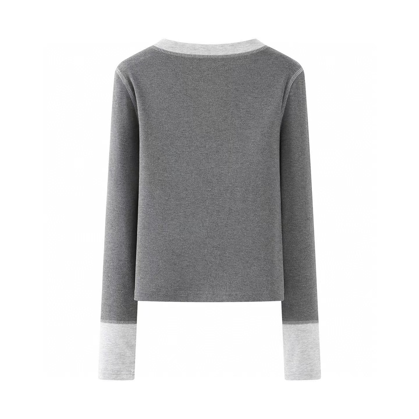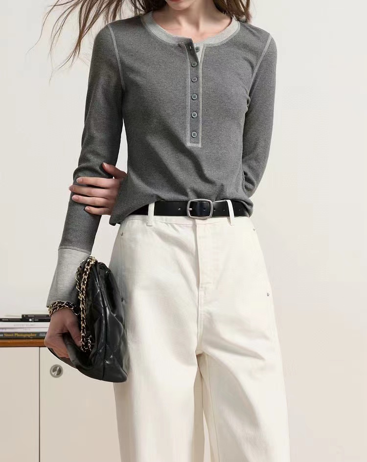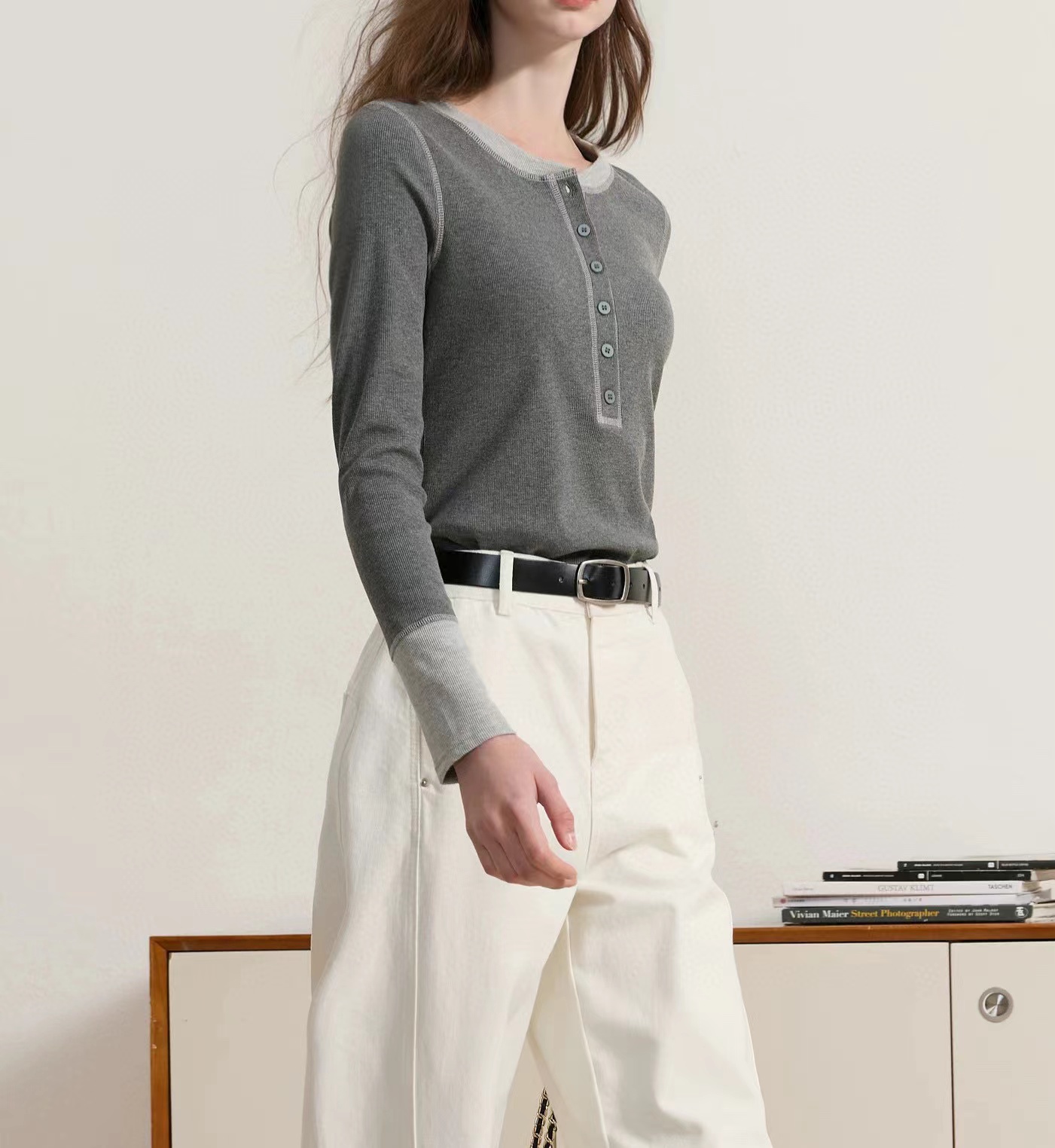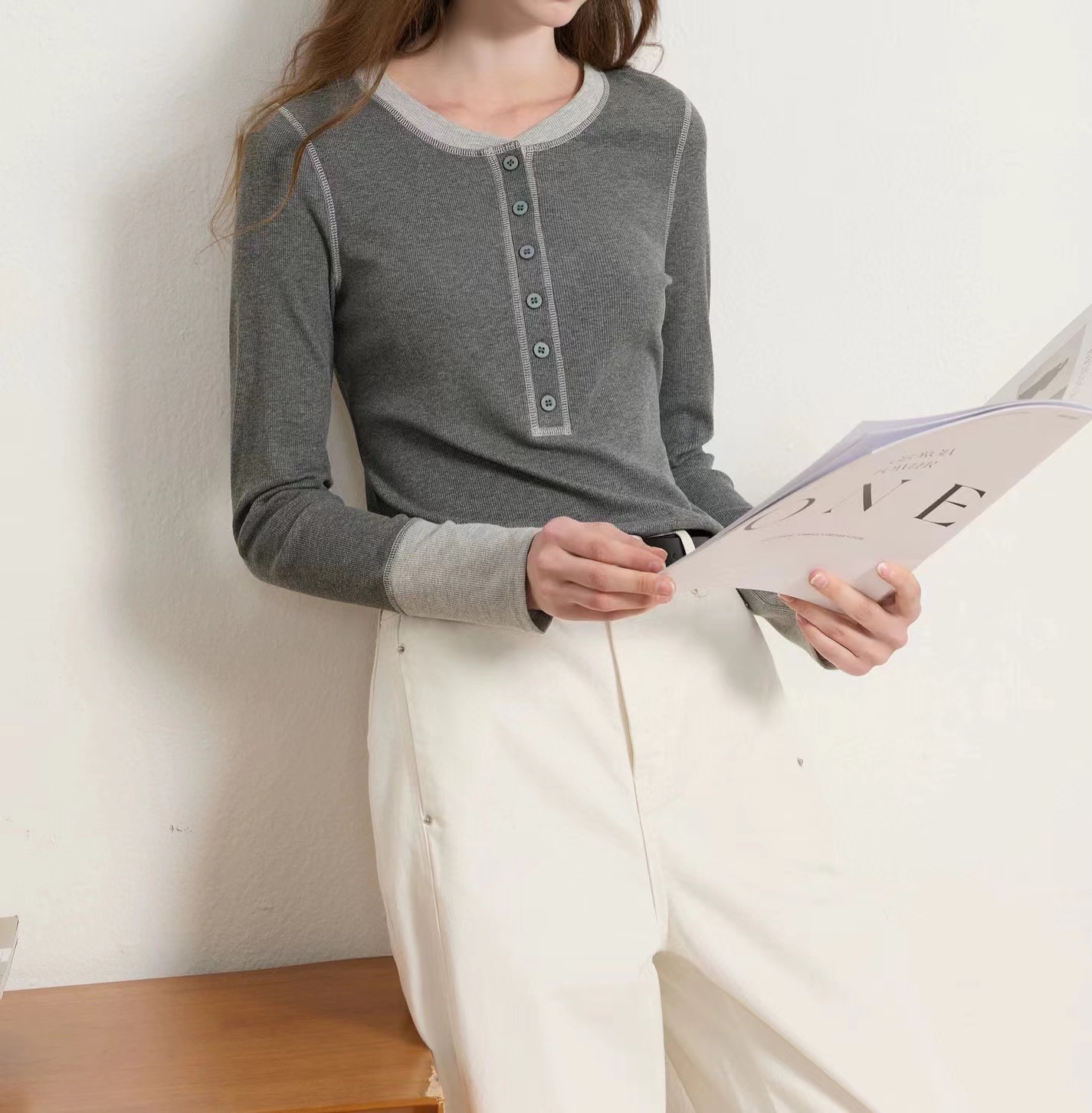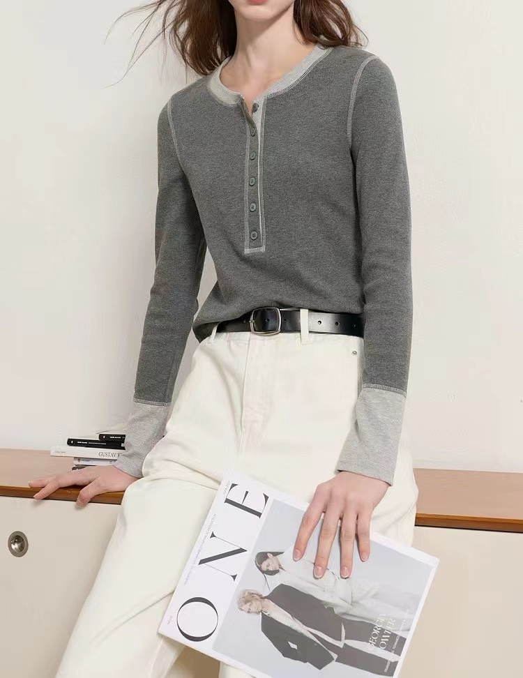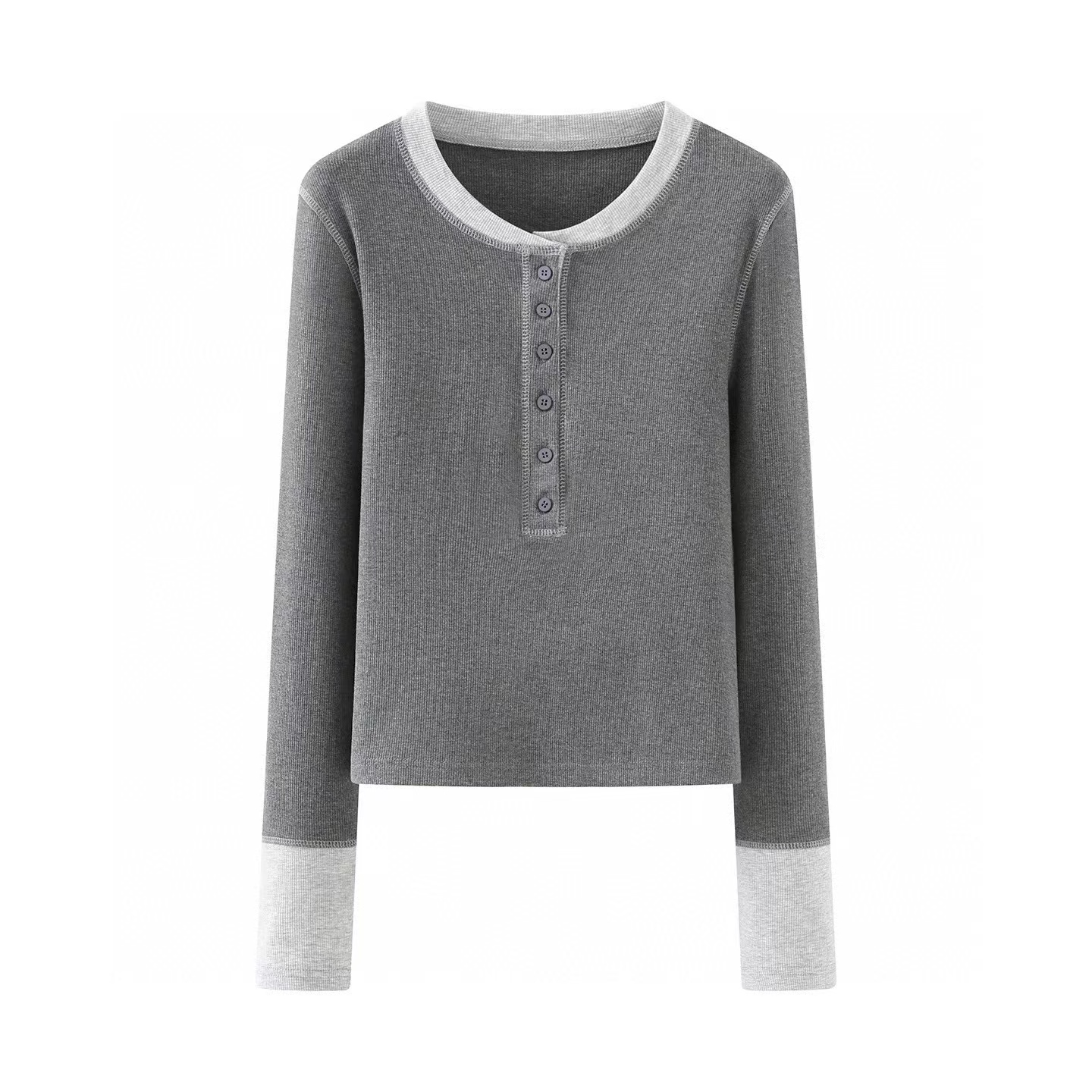 2026春季新款圆领长袖简约T恤套头上衣打底修身短款女,灰色撞色针织衫,软糯又显瘦的内搭王者,假两件设计太心机,这件针织打底我能穿一冬。亨利领针织衫,慵懒随性的日常氛围感拉满。撞色亨利领针织衫 | 软糯亲肤打底神器 高弹罗纹针织面料,贴身穿软糯不扎肤,保暖又透气。撞色圆领+亨利扣设计,打破纯色单调,假两件袖口层次感拉满。短款修身版型优化身材比例,单穿温柔,内搭大衣、西装都适配,秋冬衣橱的百搭刚需款~