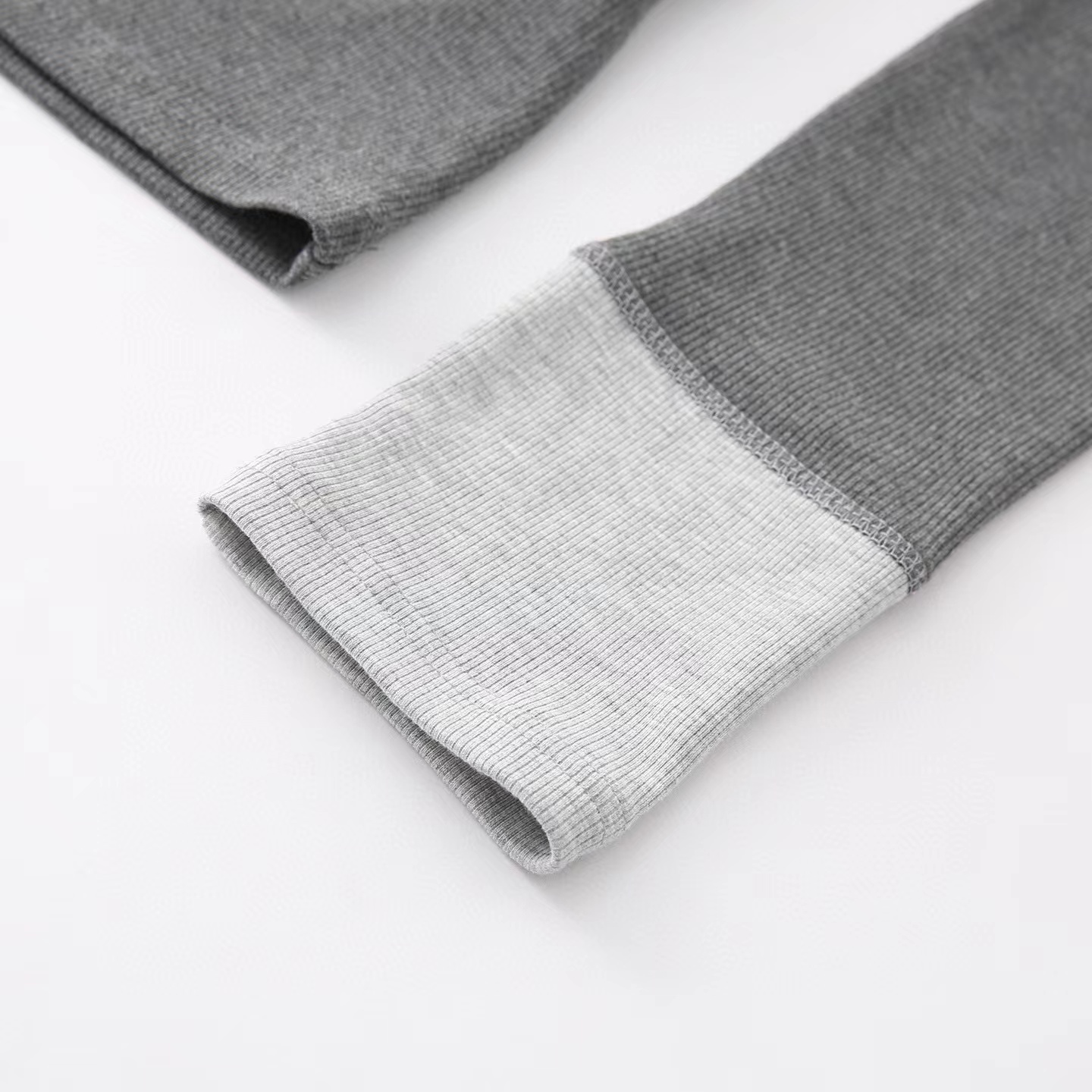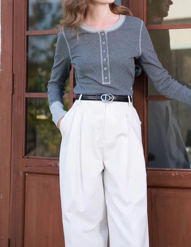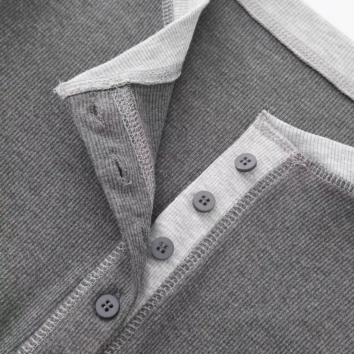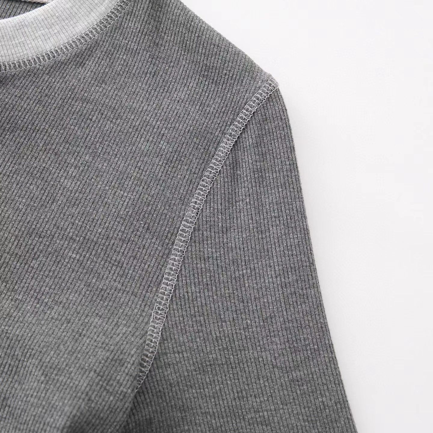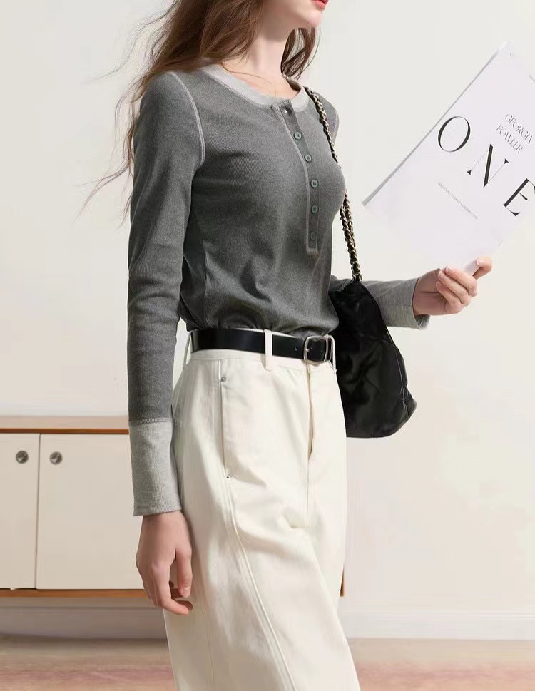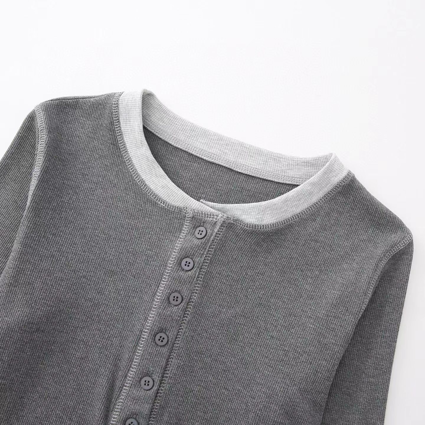 2026春季新款圆领长袖简约T恤套头上衣打底修身短款女,灰色撞色针织衫,软糯又显瘦的内搭王者,假两件设计太心机,这件针织打底我能穿一冬。亨利领针织衫,慵懒随性的日常氛围感拉满。撞色亨利领针织衫 | 软糯亲肤打底神器 高弹罗纹针织面料,贴身穿软糯不扎肤,保暖又透气。撞色圆领+亨利扣设计,打破纯色单调,假两件袖口层次感拉满。短款修身版型优化身材比例,单穿温柔,内搭大衣、西装都适配,秋冬衣橱的百搭刚需款~