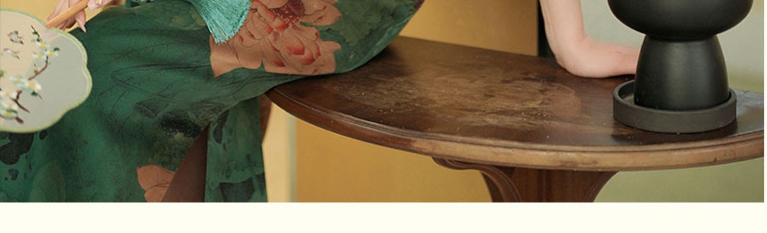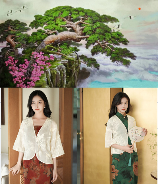 1.搭配吊带、旗袍。中式风的复古优雅,非常显气质。像模特搭配的是旗袍【妙玄】、【合欢】【厦荷】,一颦一笑尽显优雅气质。