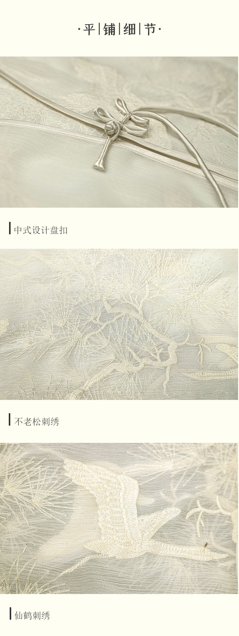 这款外披,我们以布为纸,以针为笔,在服饰上绣出一幅幅极具艺术感的松鹤意境,一抹雾凇傲然于衣身之间,仙鸟盘旋而至,典雅又灵动。汉玉白纯洁温柔,像云雾一般,上身自带东方的文雅气息。
