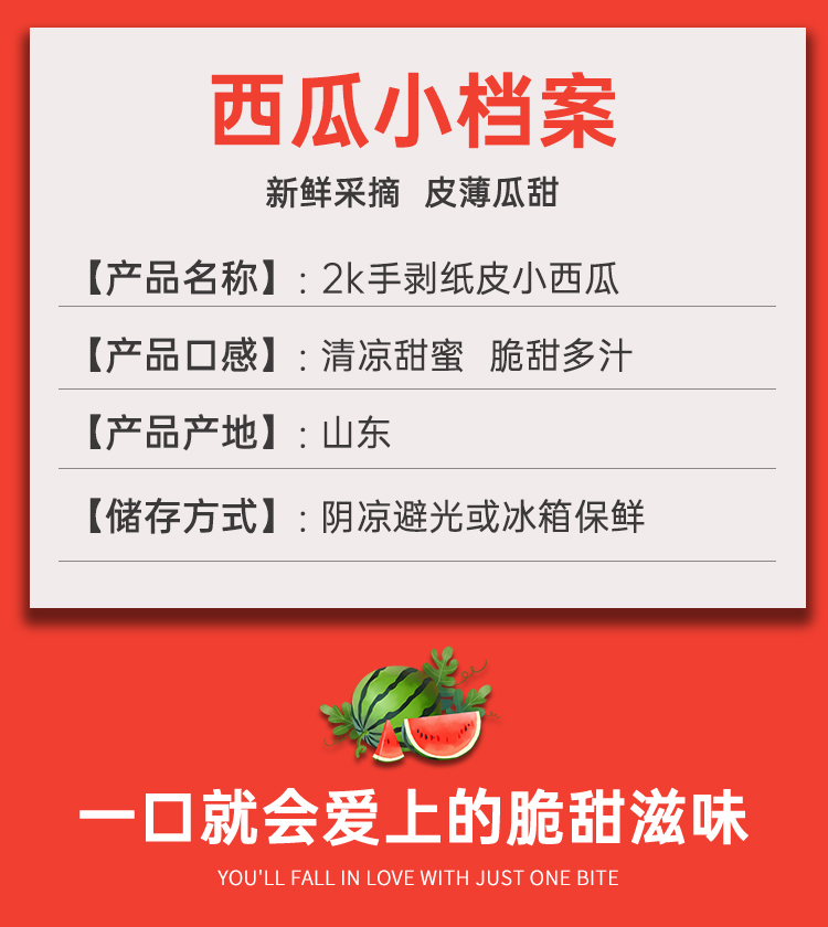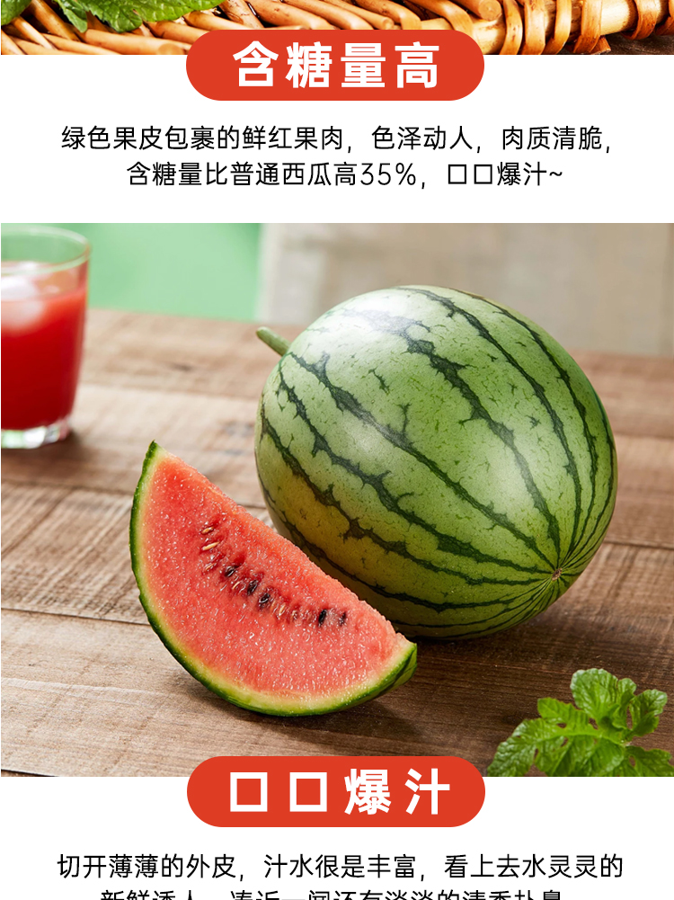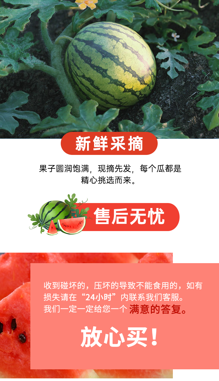 品名:2K手撕小西瓜规格1: 规格2: 注:2-3斤约1-2个,4-5斤2个 包装方式:网套+泡沫箱 快递:顺丰 运费模板:新疆、西藏、海南省、云南省、黑龙江省、甘肃省、青海省、贵州省、宁夏、港澳台不发货 发货时效:48-72h 发货地/产地:山东 保质期:收到冷藏保存2-5天 生产日期:现摘现发 销售售卖期:5月底 周六周天、节假日除外,早上十点之前的订单是48小时发货 ,到货时间约为2-5天,请您耐心等待 。 |
