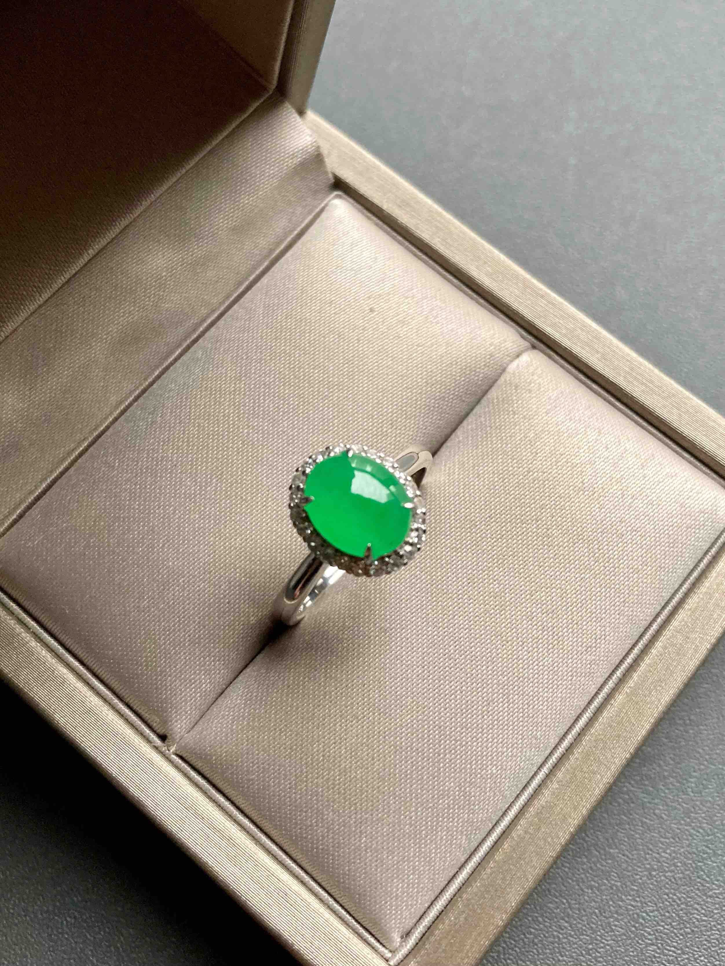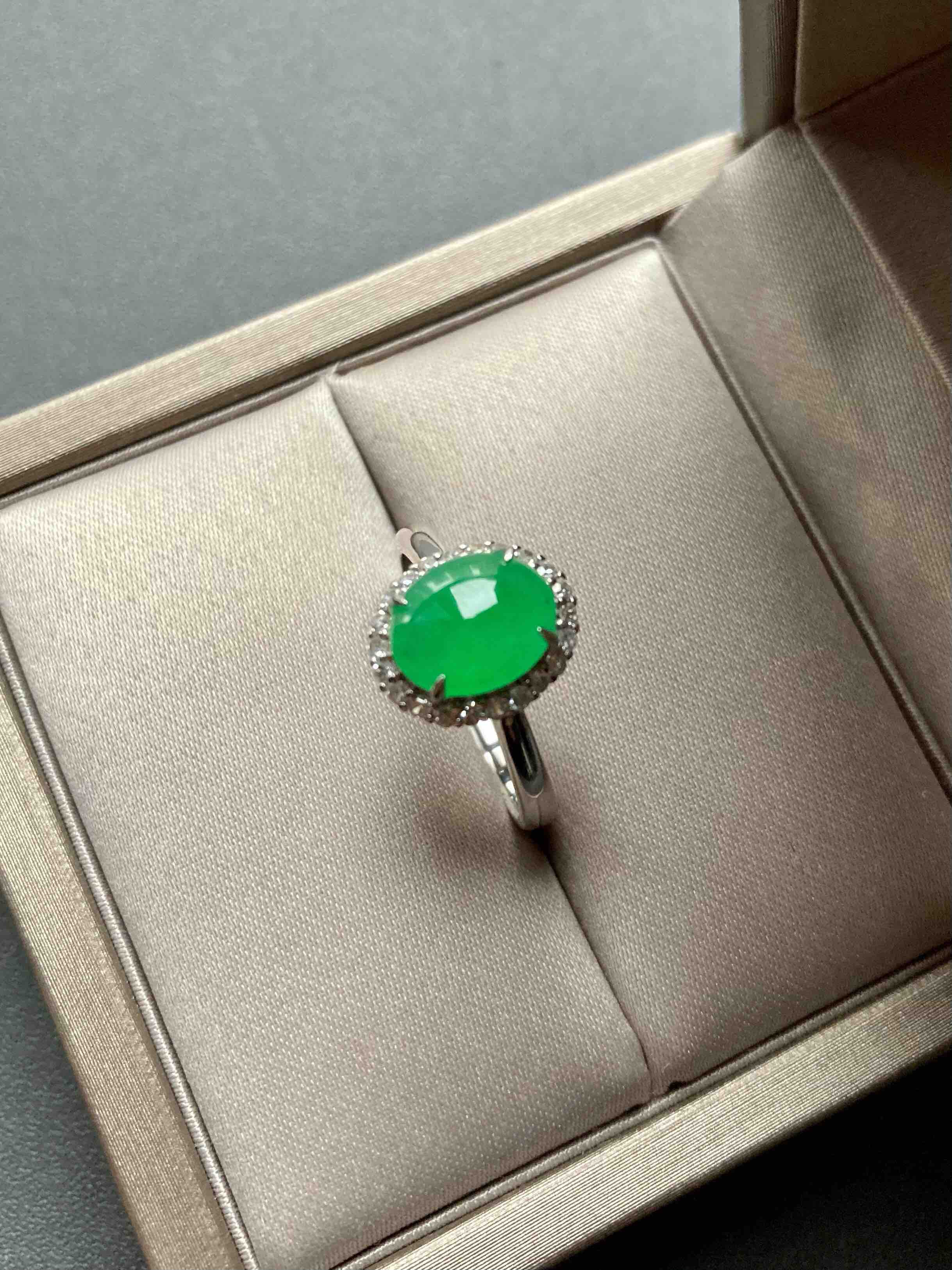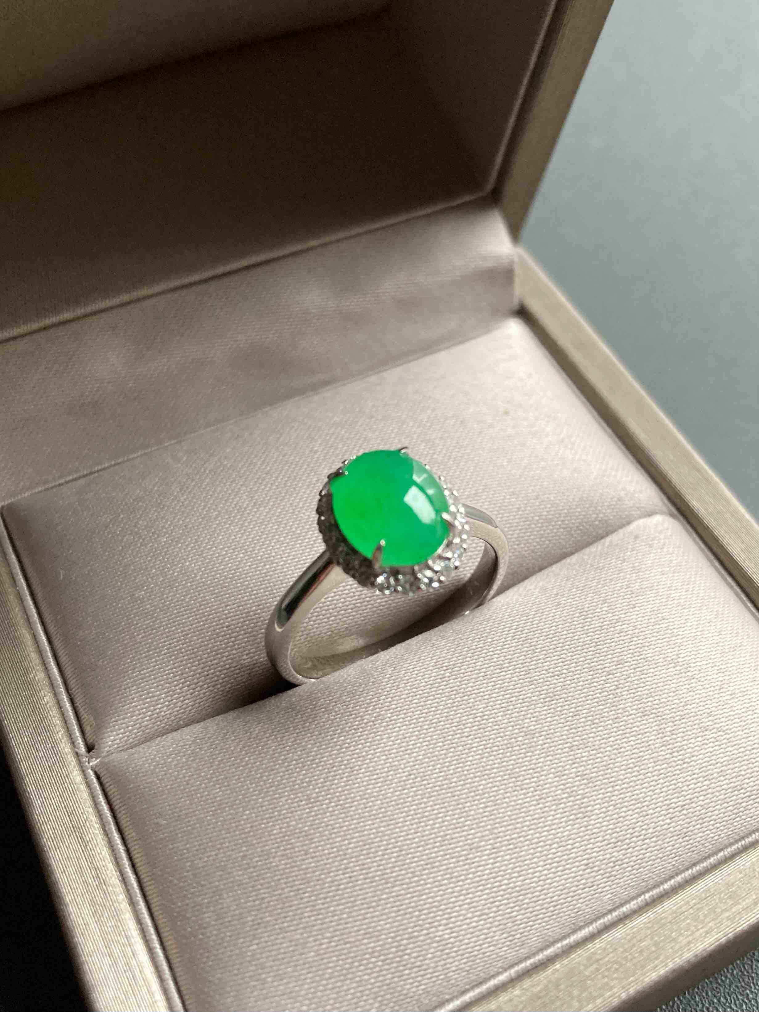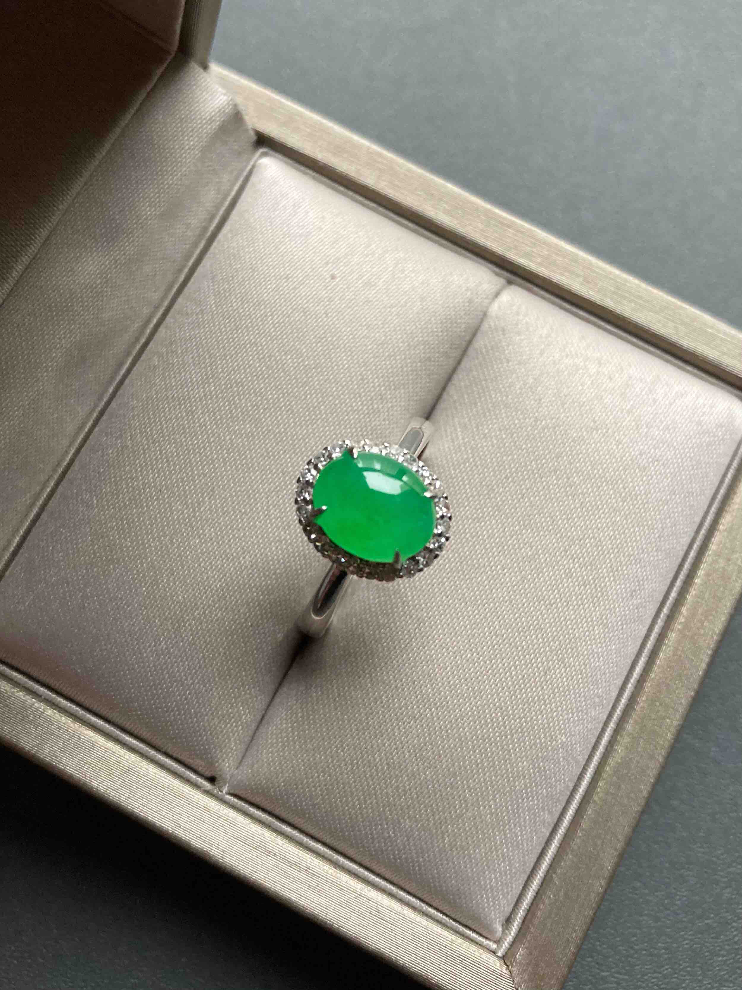 色标级,要戴就要戴这样的宝贝,冰种正阳绿翡翠蛋面戒指,蛋面8.7×7×3mm,圈号13,种水晶莹剔透,阳绿艳丽喜人,18k白金钻石镶嵌,是人人都能驾驭的款式,日常百搭,每天都可以戴,喜欢