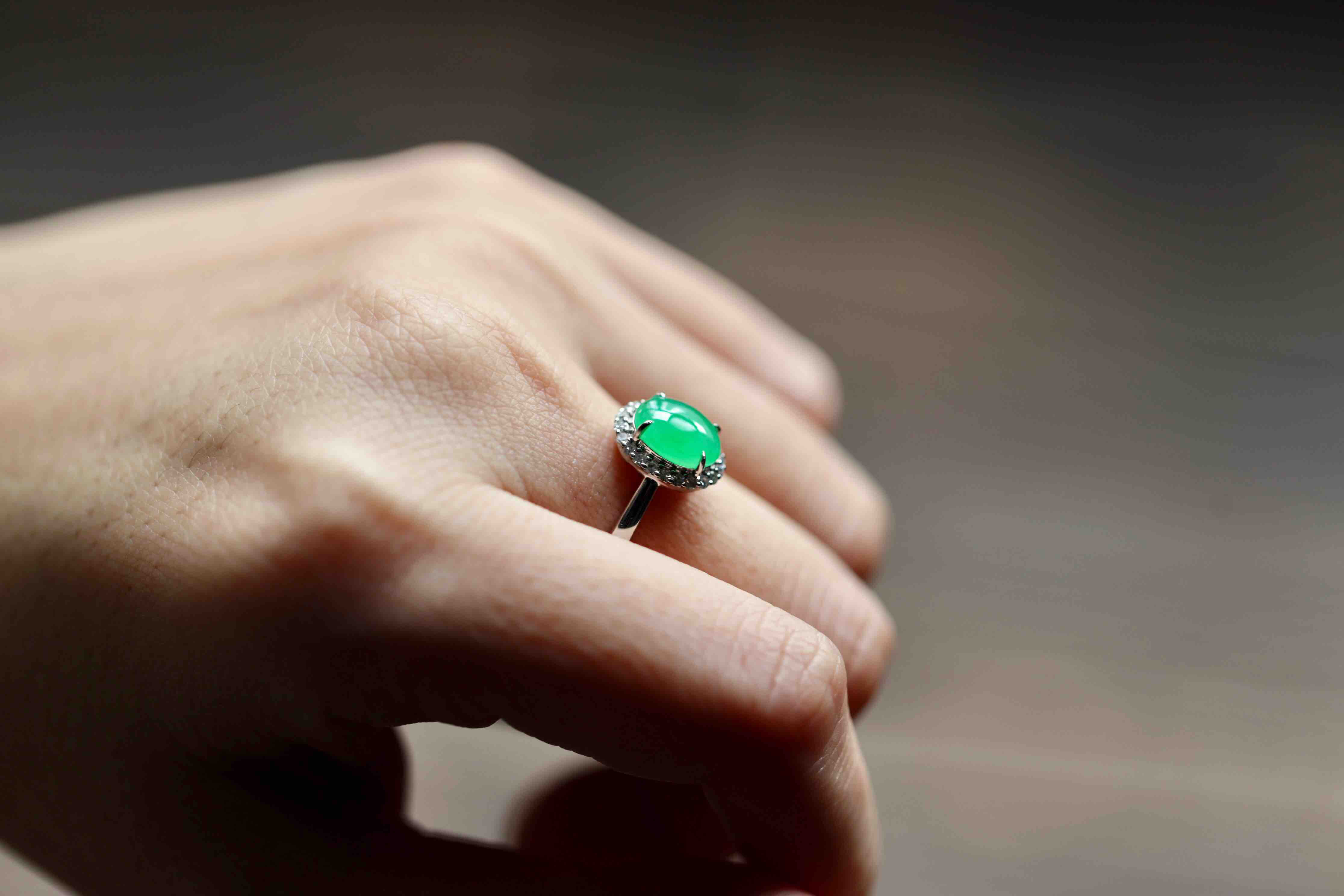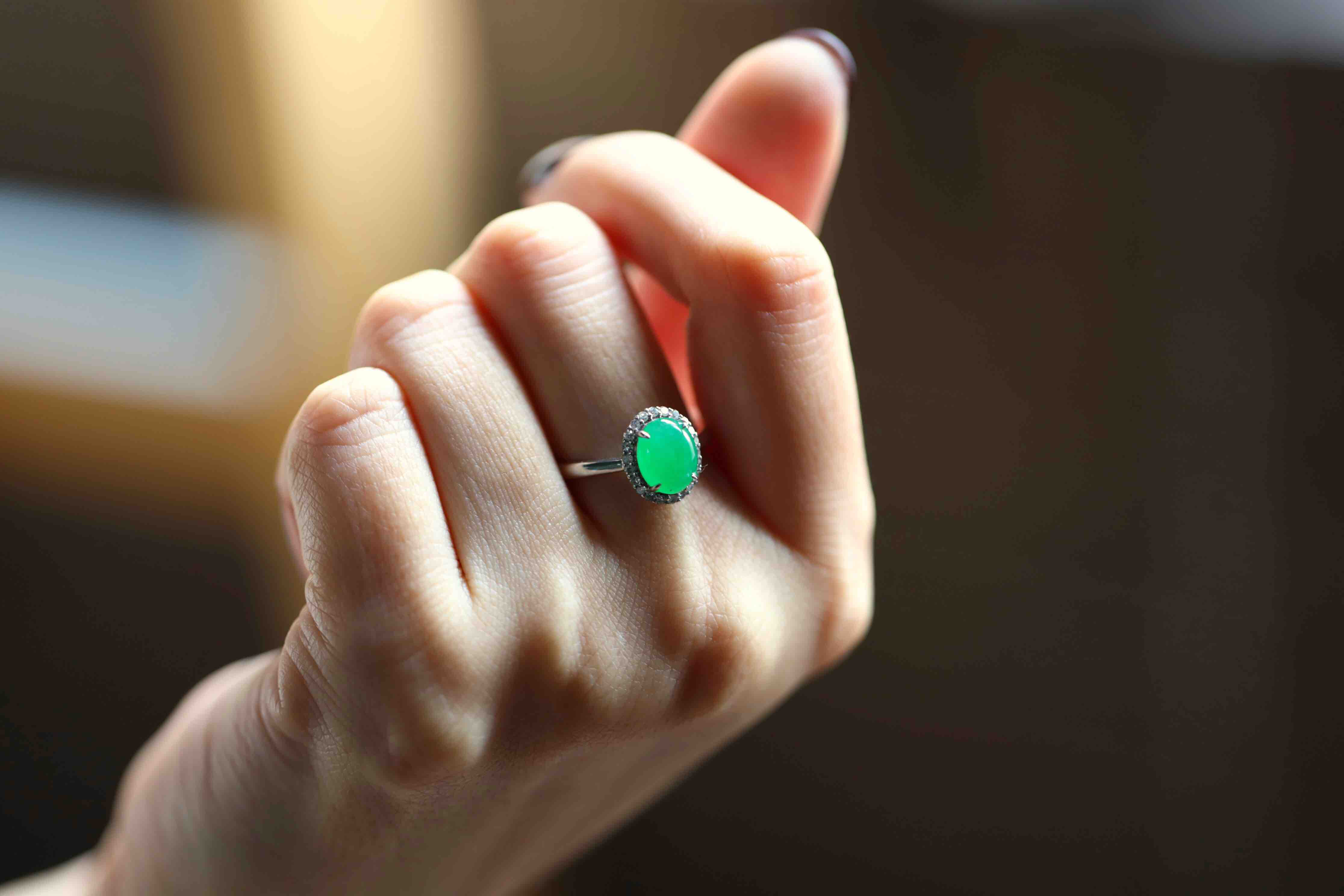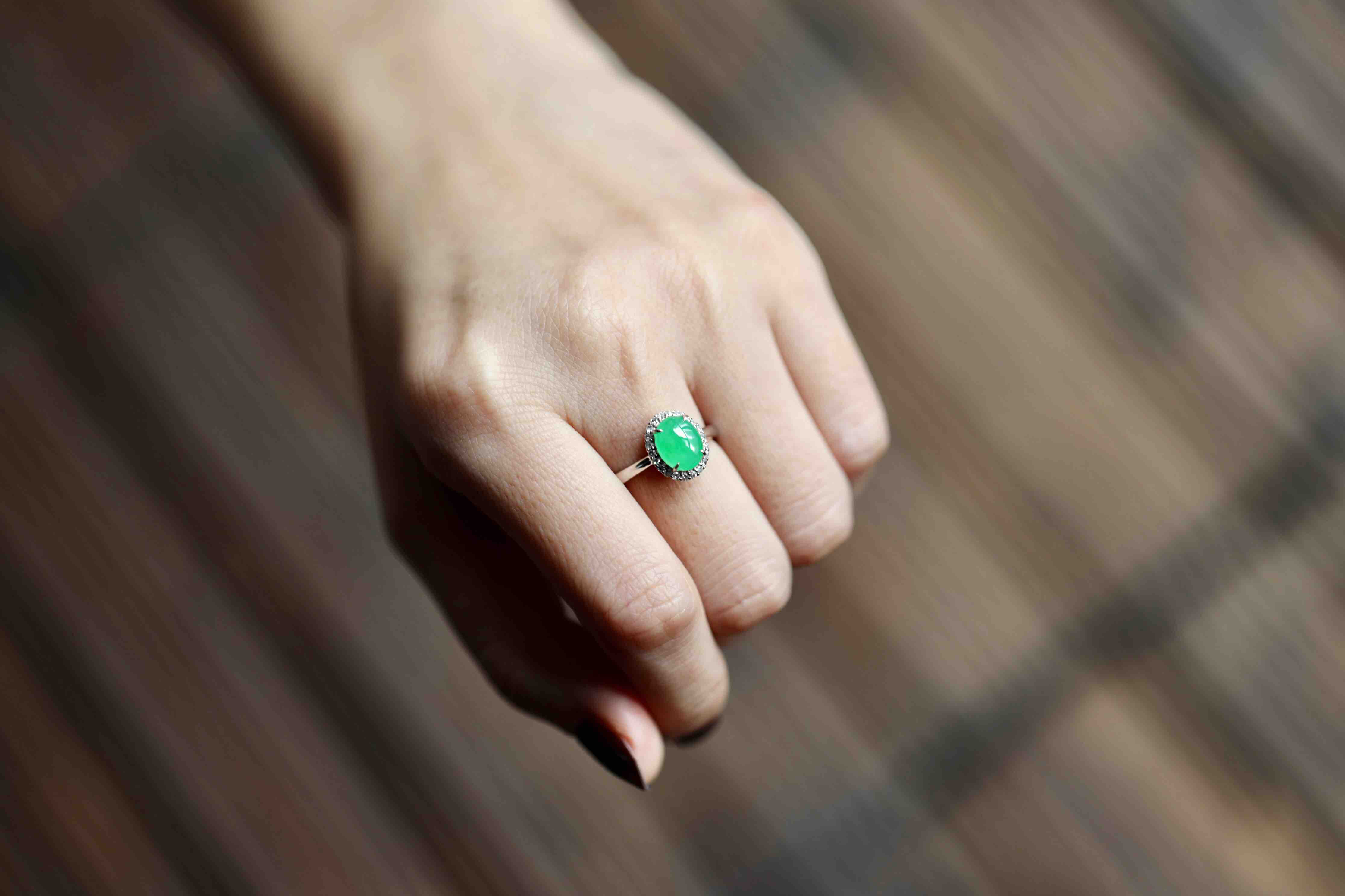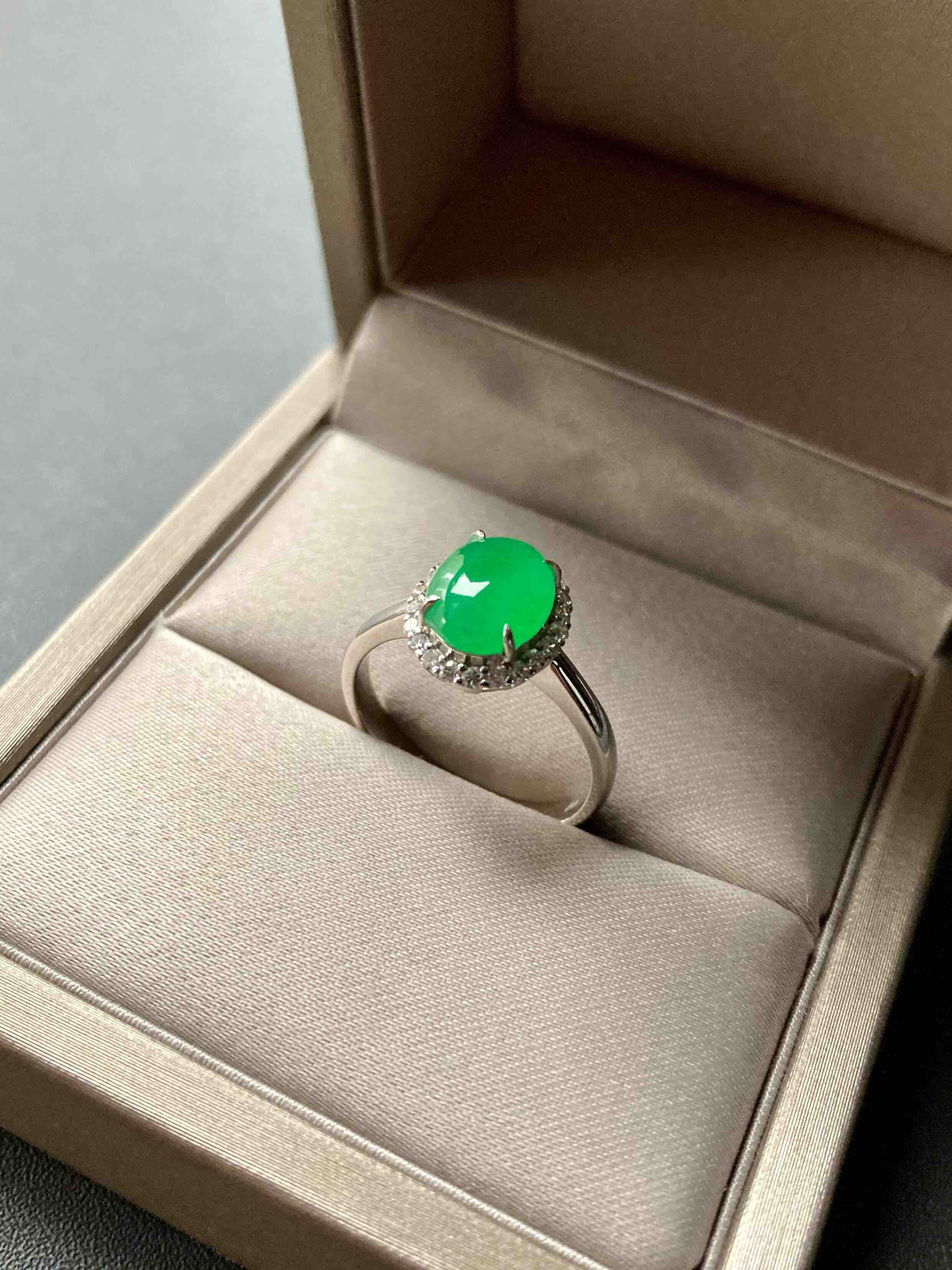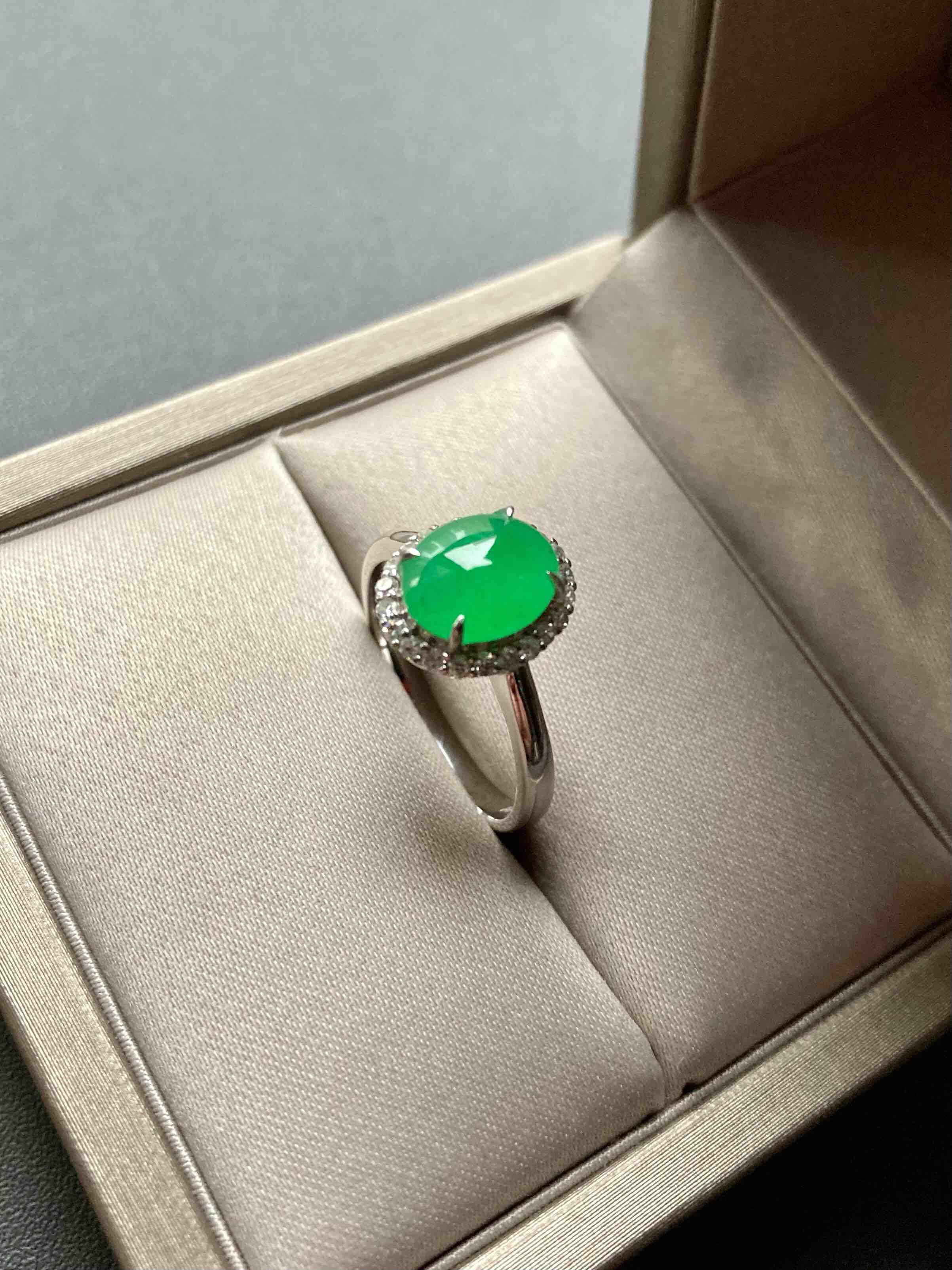 色标级,要戴就要戴这样的宝贝,冰种正阳绿翡翠蛋面戒指,蛋面8.7×7×3mm,圈号13,种水晶莹剔透,阳绿艳丽喜人,18k白金钻石镶嵌,是人人都能驾驭的款式,日常百搭,每天都可以戴,喜欢
