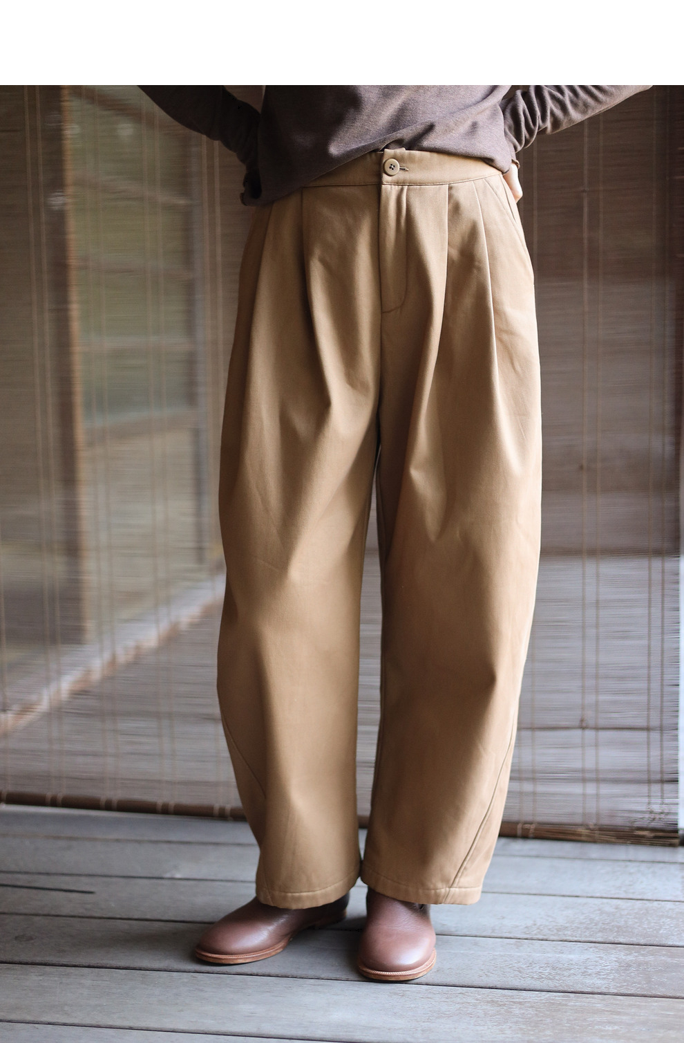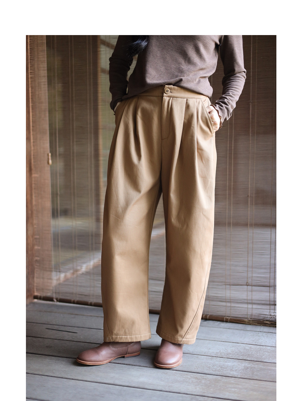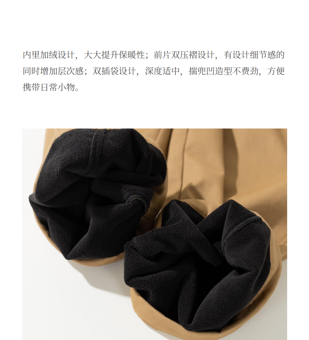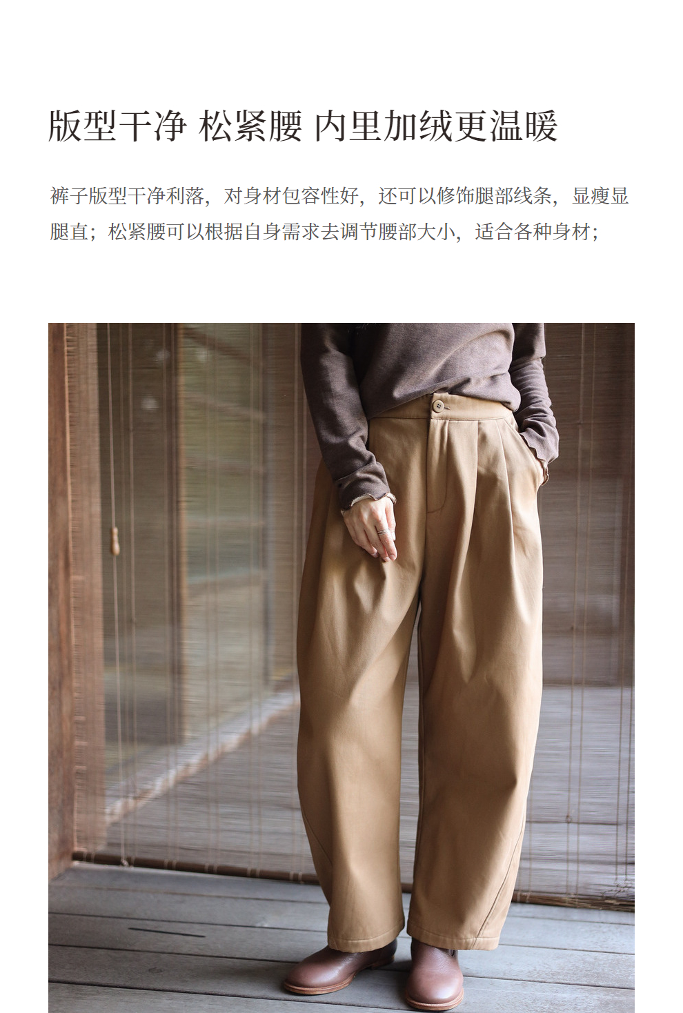 绽放830朵/卡其色设计感弯刀廓形加绒加厚双压褶插袋斜纹棉休闲裤