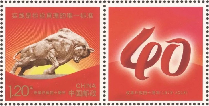 邮票主图选取代表改革开放精神,位于中国第一个经济特区深圳的标志性雕塑——拓荒牛为主要元素,衬以喷薄而出的太阳和飘动的红绸带,画面上方为“实践是检验真理的唯一标准”金字,通过这些元素,寓意在新时代中国特色社会主义思想指引下,全面深化改革,踏上新征程。