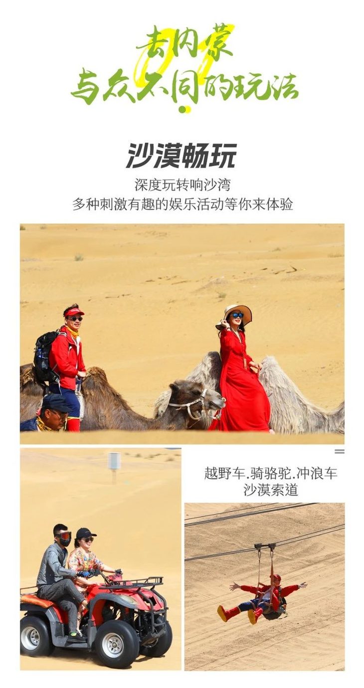 4、门票:黄花沟景区门票+小火车+小交通+单程索道、敕勒川景区门票+景区电瓶车、响沙湾景区门票+索道;