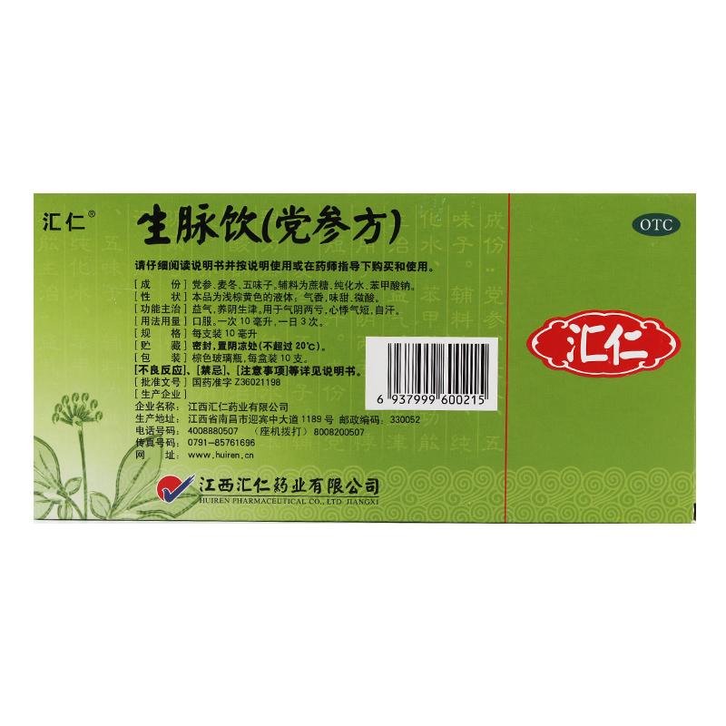 汇仁 生脉饮(党参方)10支 益气养阴生津气 虚心悸气短盗汗
