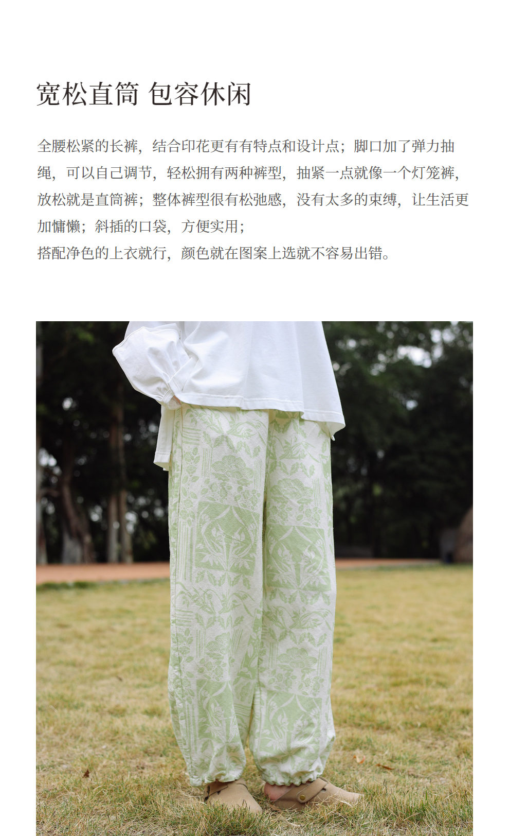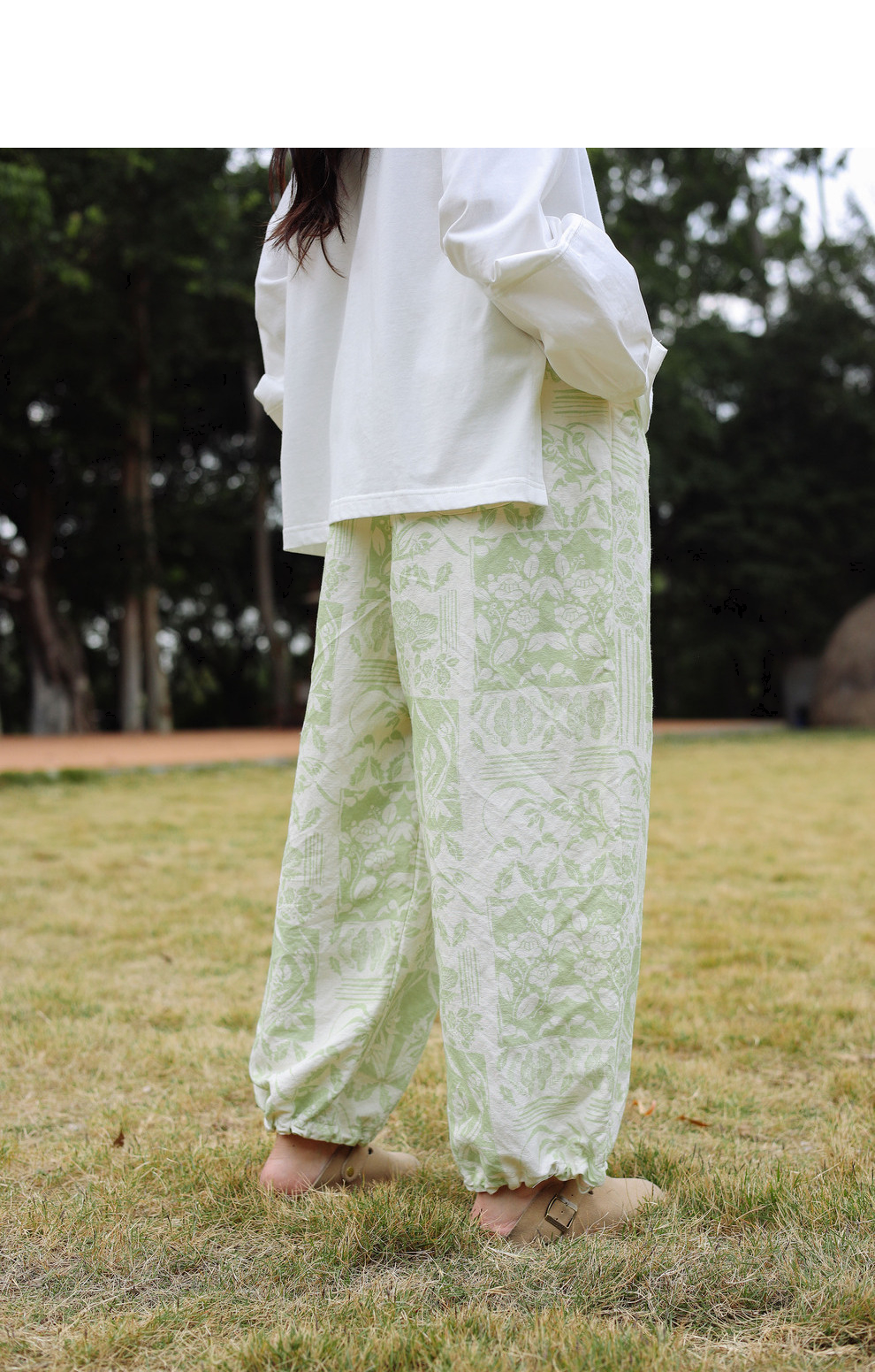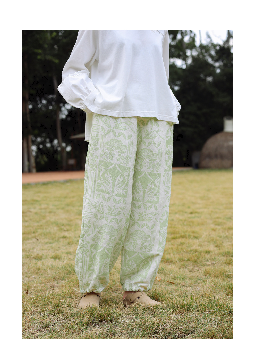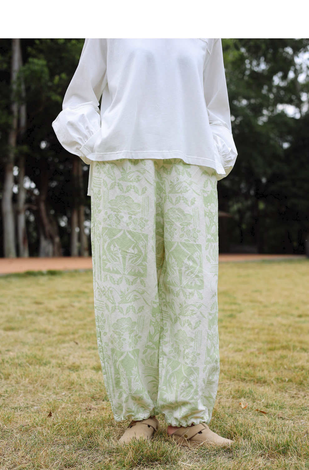 绽放059朵/二月春花亚麻印花清新减龄脚口弹力抽绳宽松休闲长裤女
