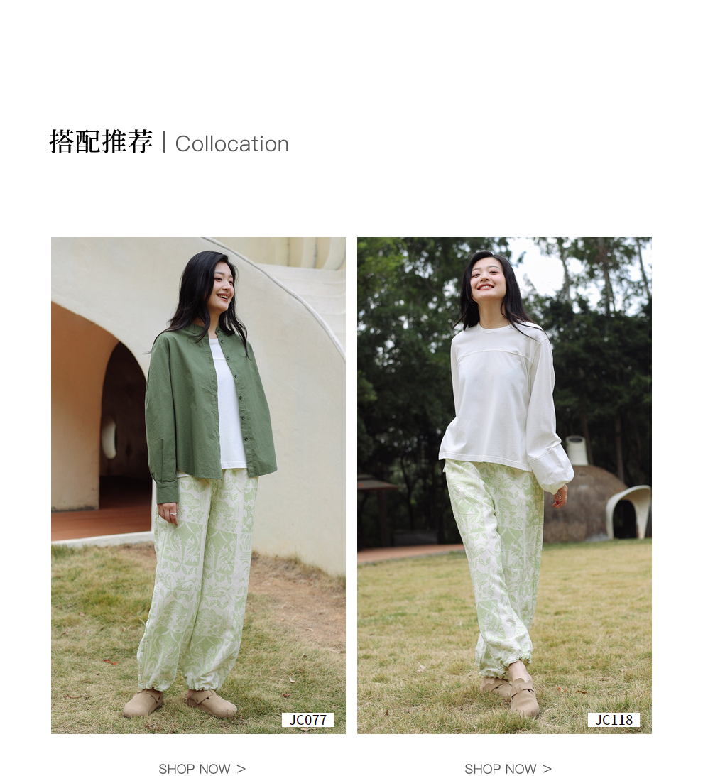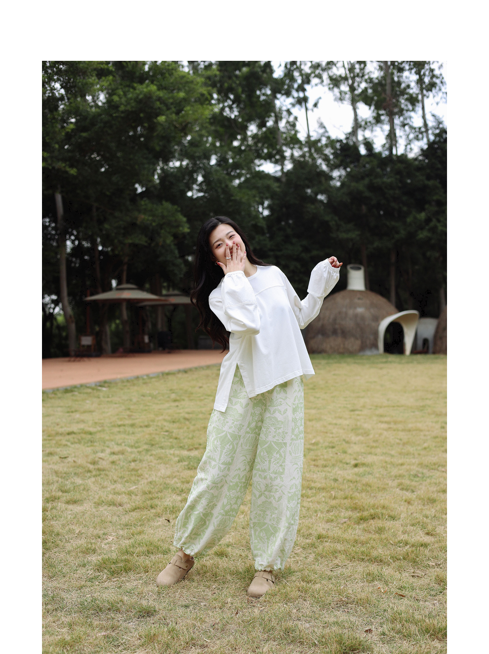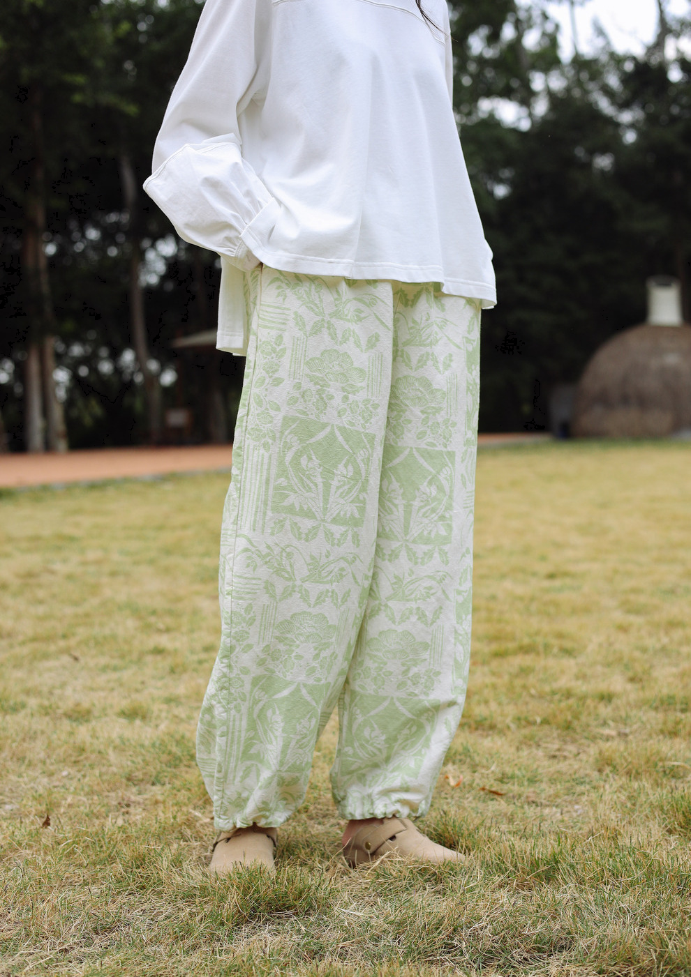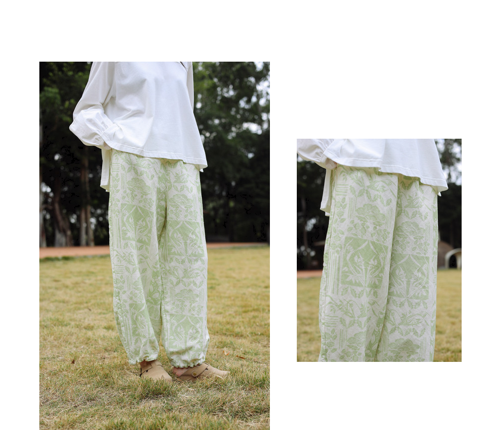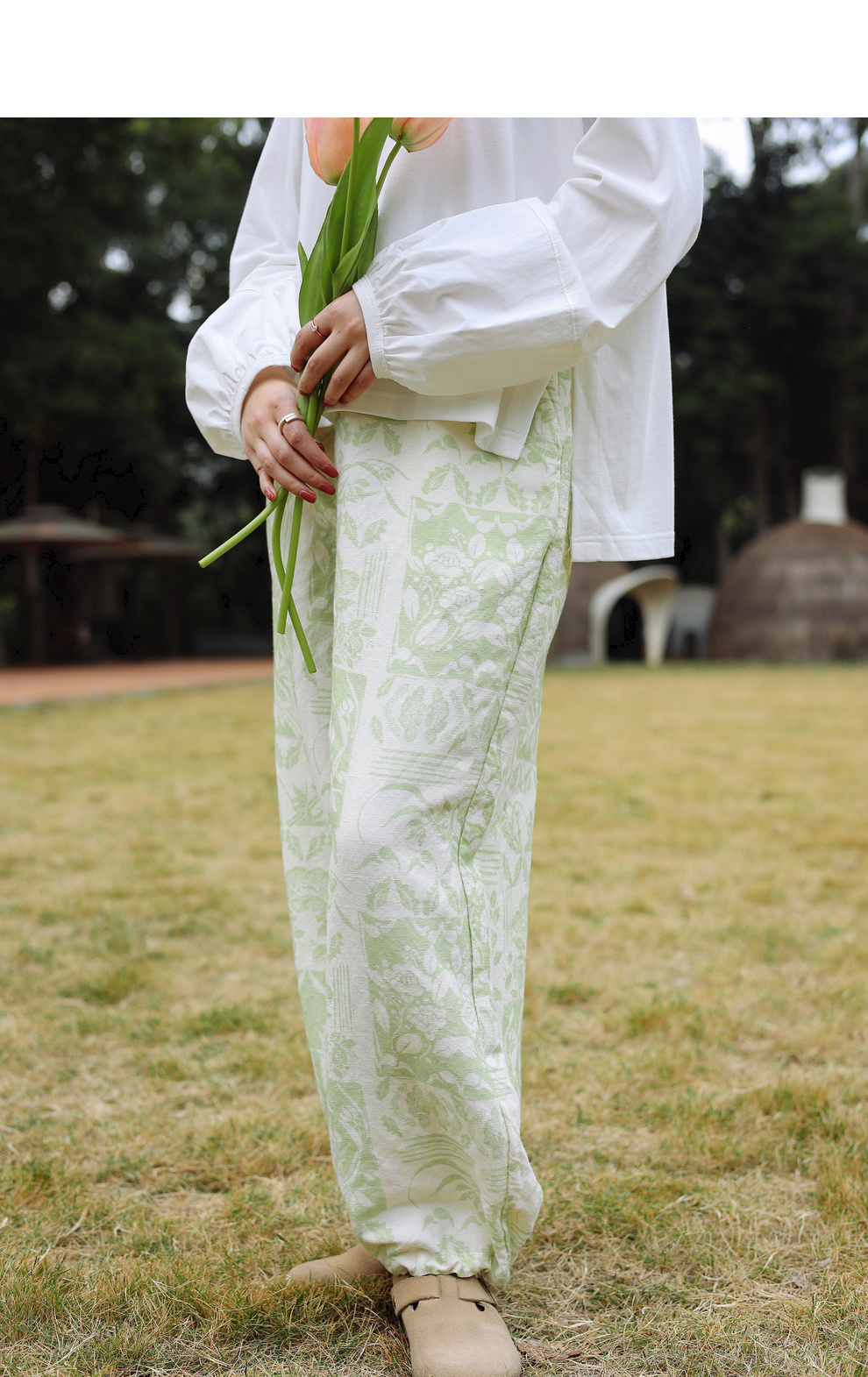 绽放059朵/二月春花亚麻印花清新减龄脚口弹力抽绳宽松休闲长裤女