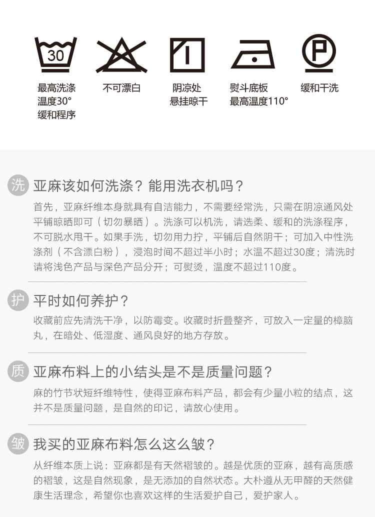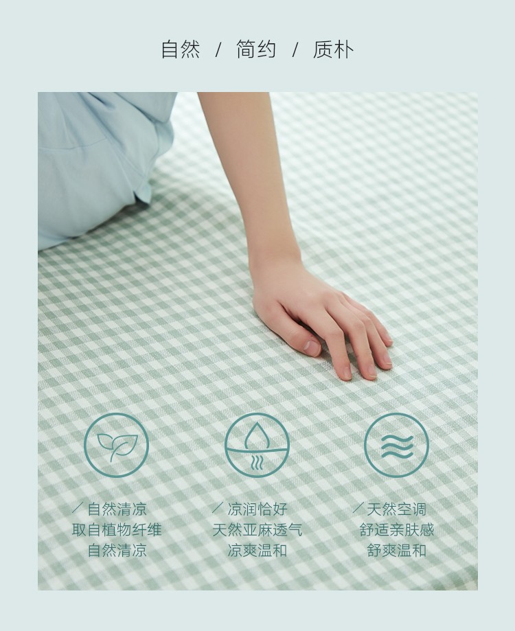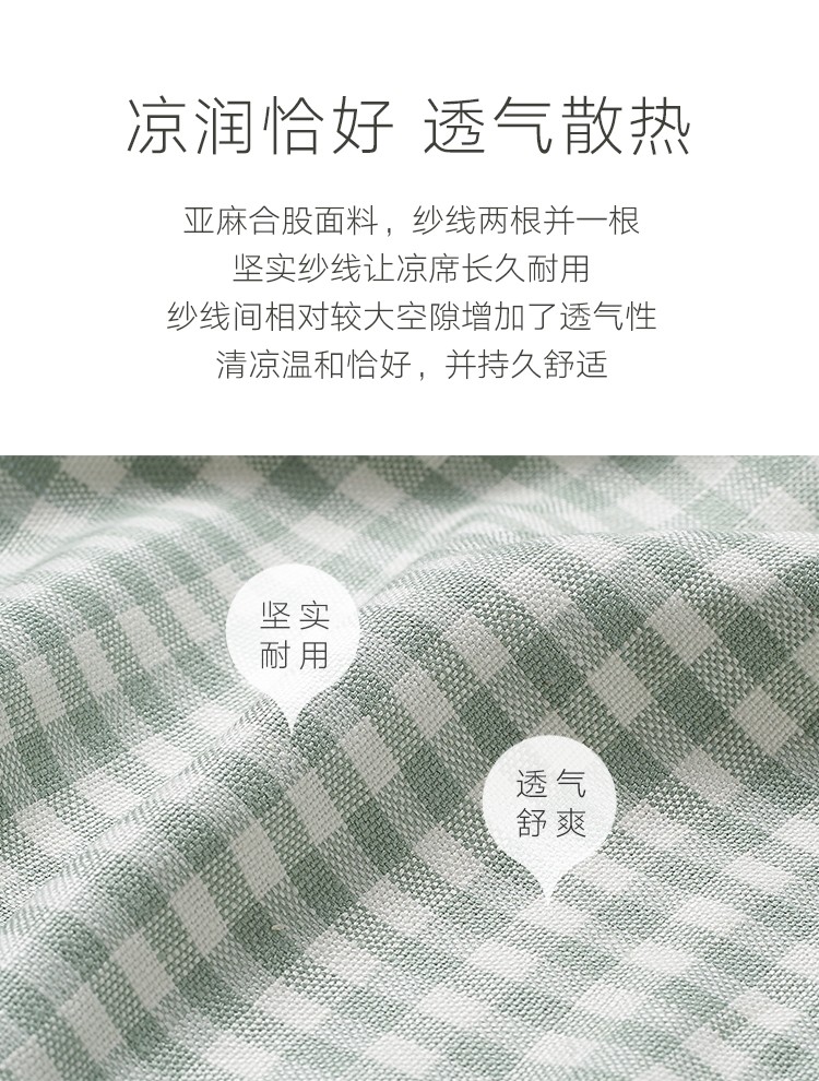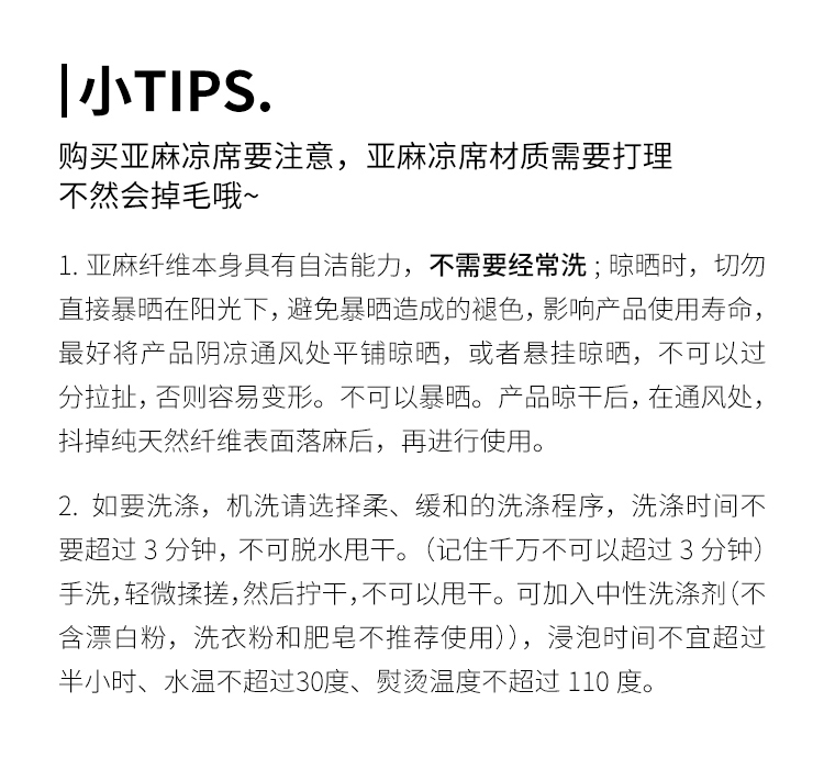 亚麻凉席需要注意的一个点就是,机洗容易掉毛,是亚麻材质本身的特性,不属于质量问题,建议根据详情页里的洗涤要求进行清洗。