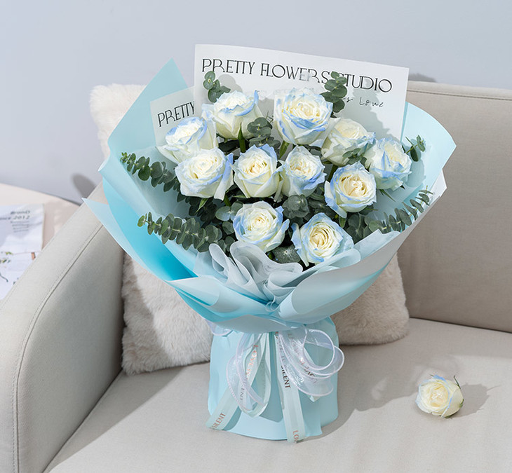 材料 11枝碎冰蓝玫瑰(坦尼克白玫瑰,使用密西根碎冰蓝边缘喷淡蓝色工艺处理),加10枝尤加利叶。