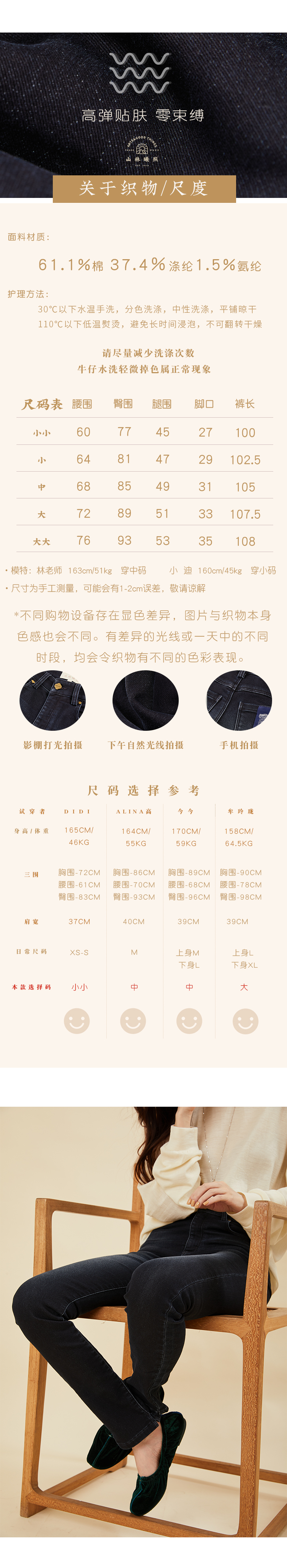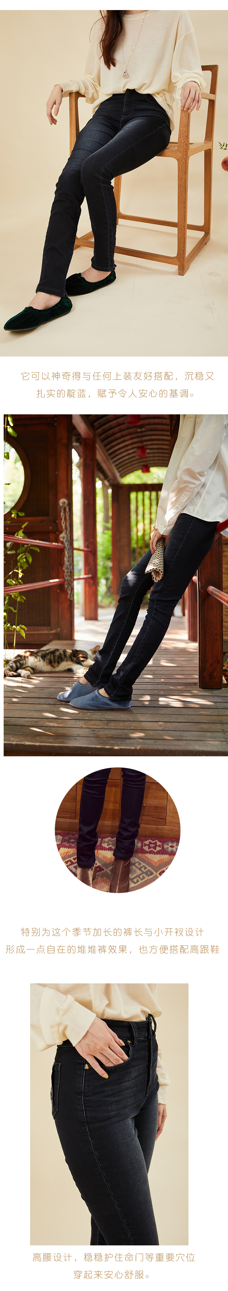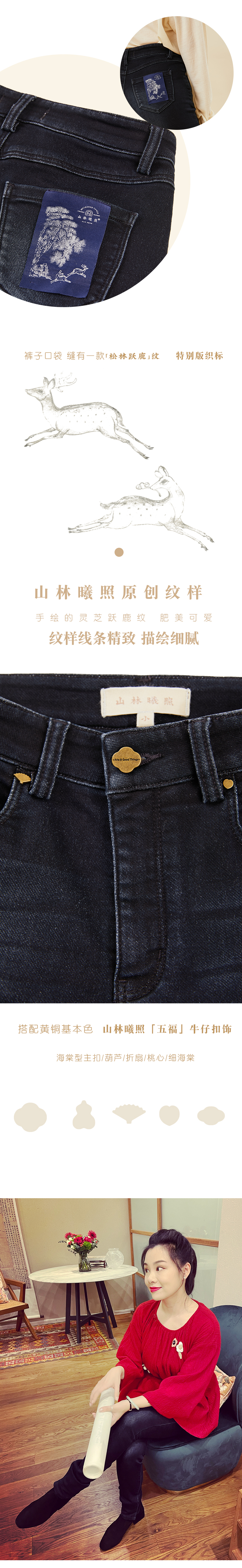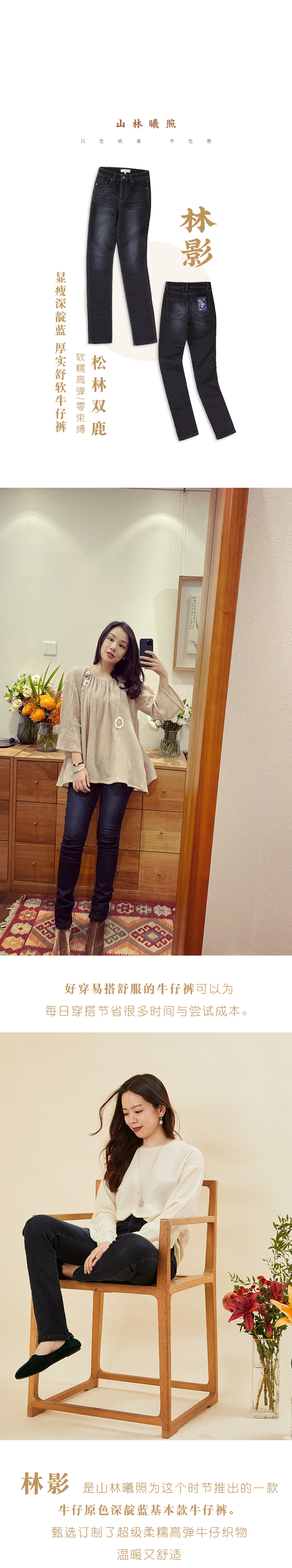山林曦照 林影 松林双鹿显瘦深靛蓝 厚实舒软高腰牛仔裤