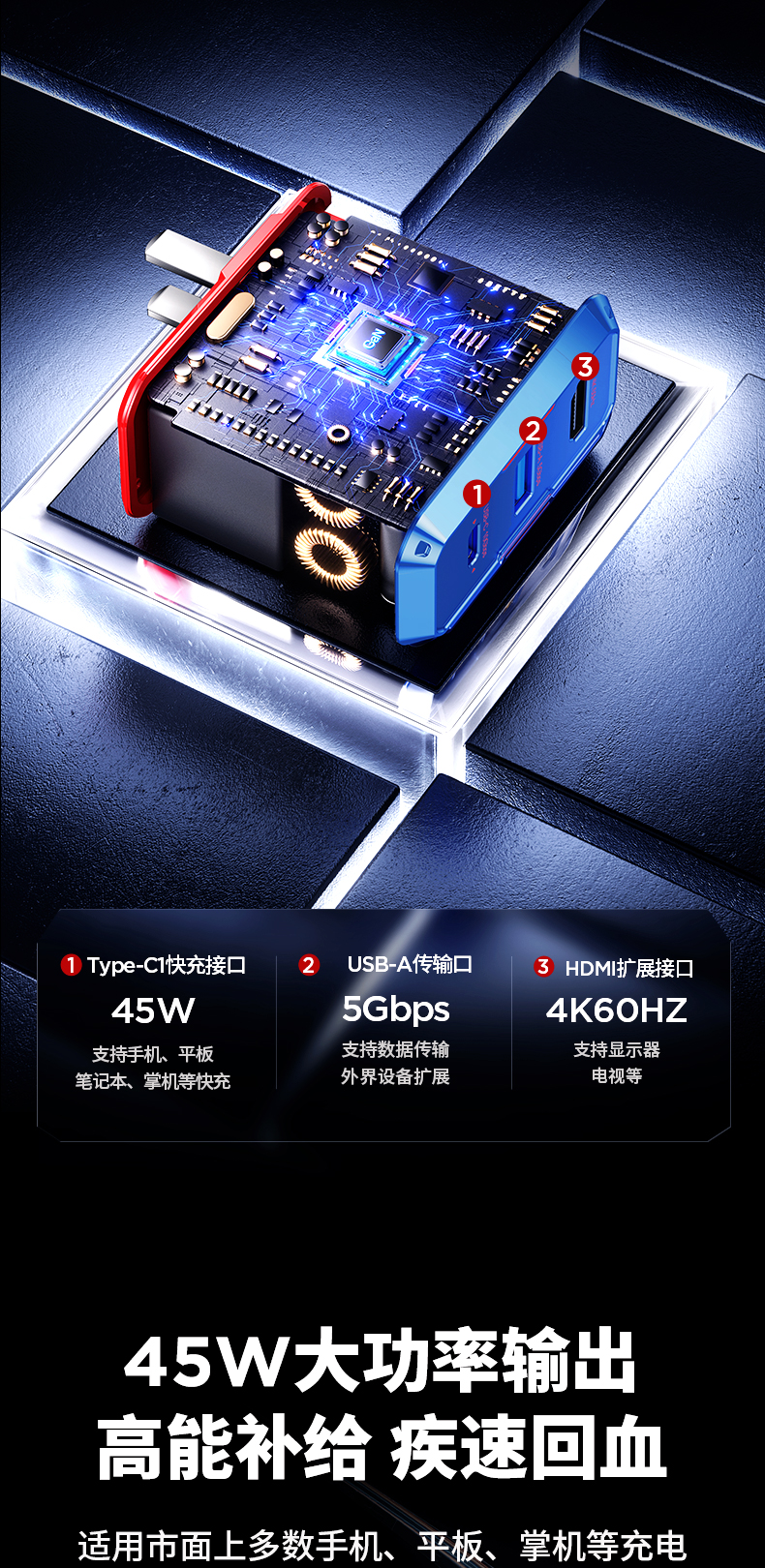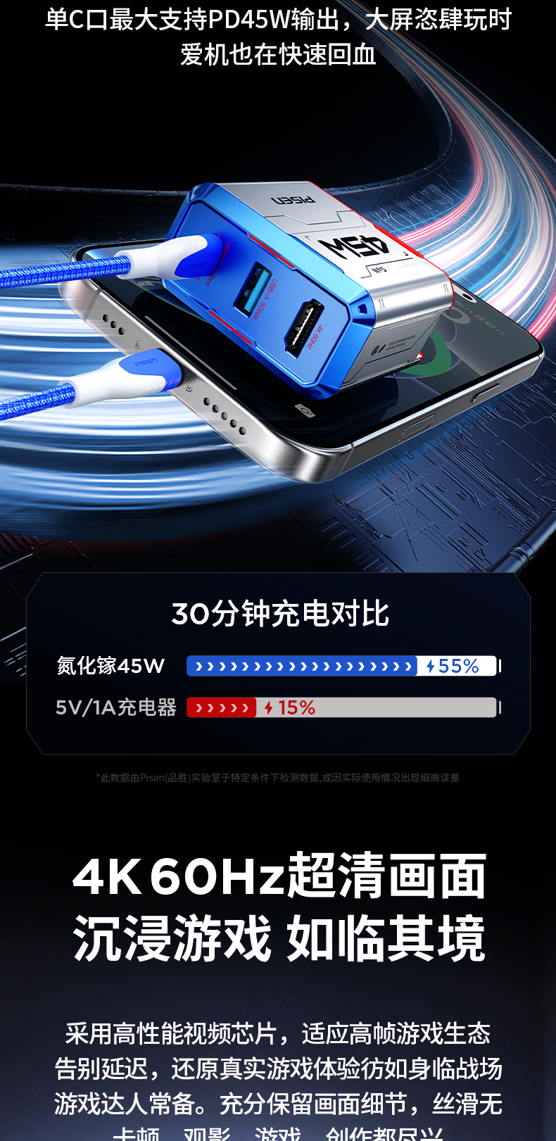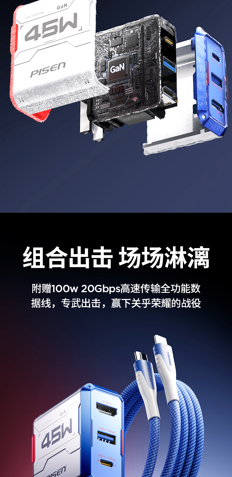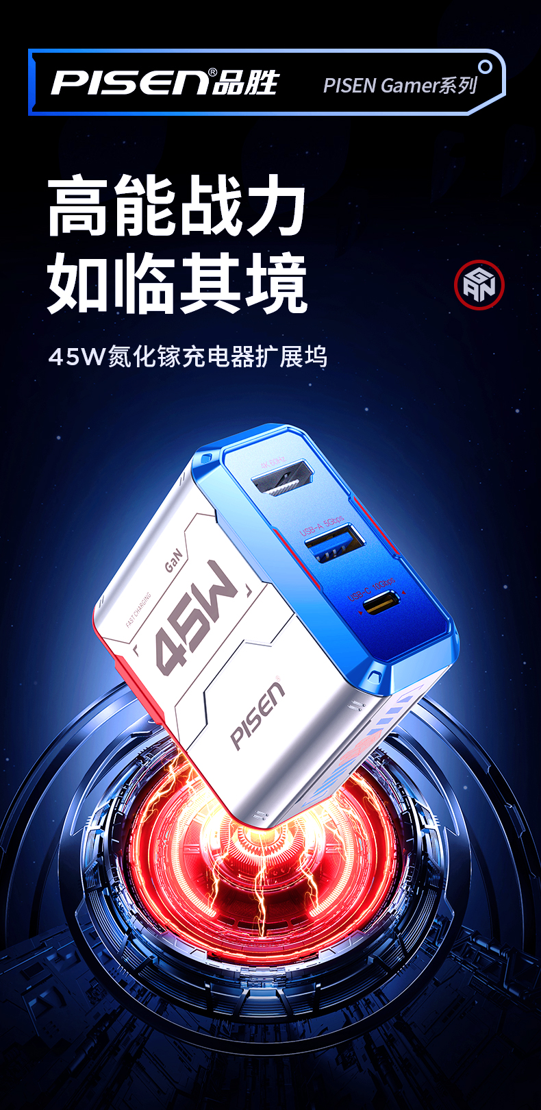 品胜 Gamer系列45W GaNHub氮化镓旅充拓展坞套装 快充数据线支持安卓/苹果设备