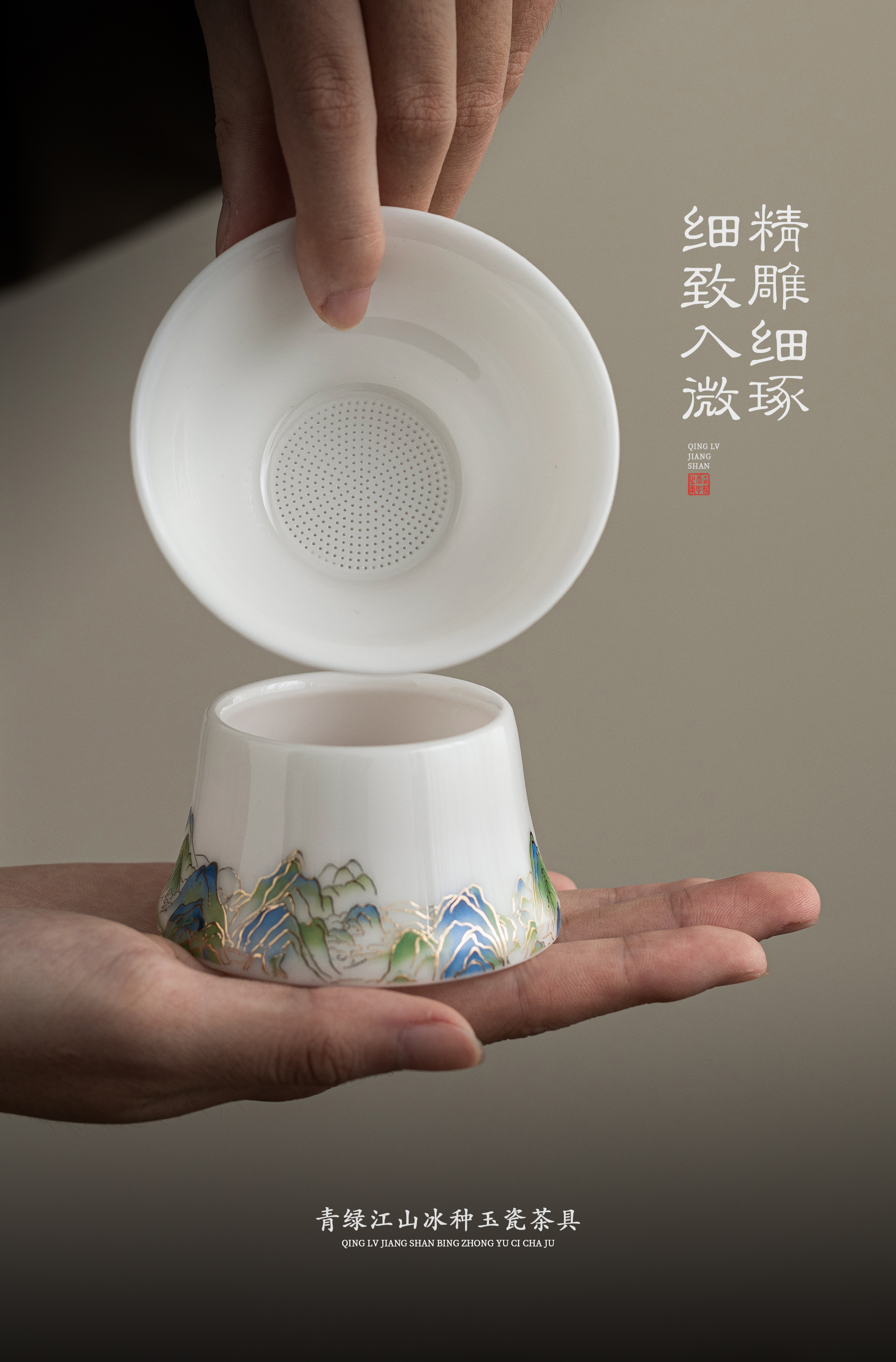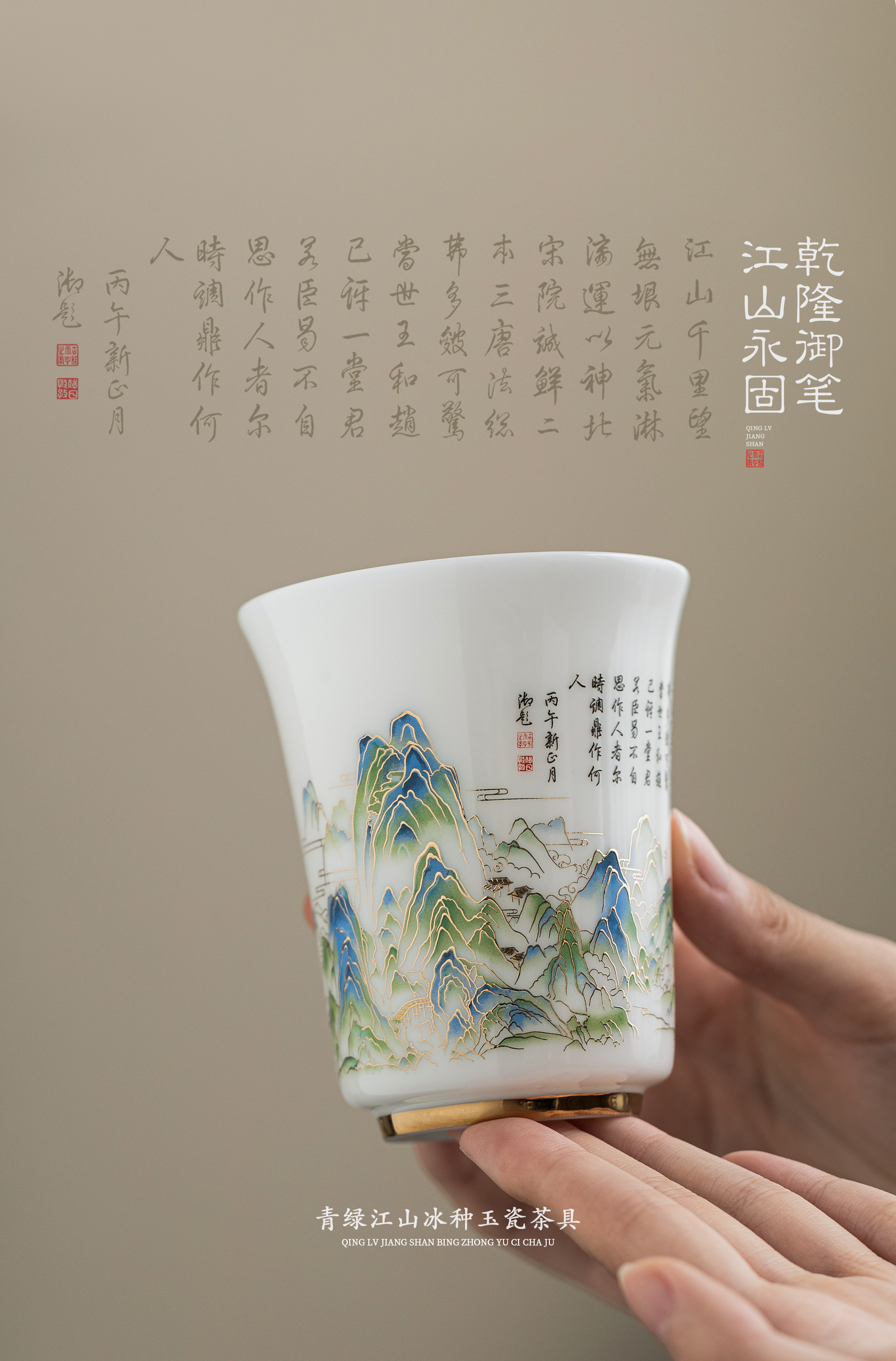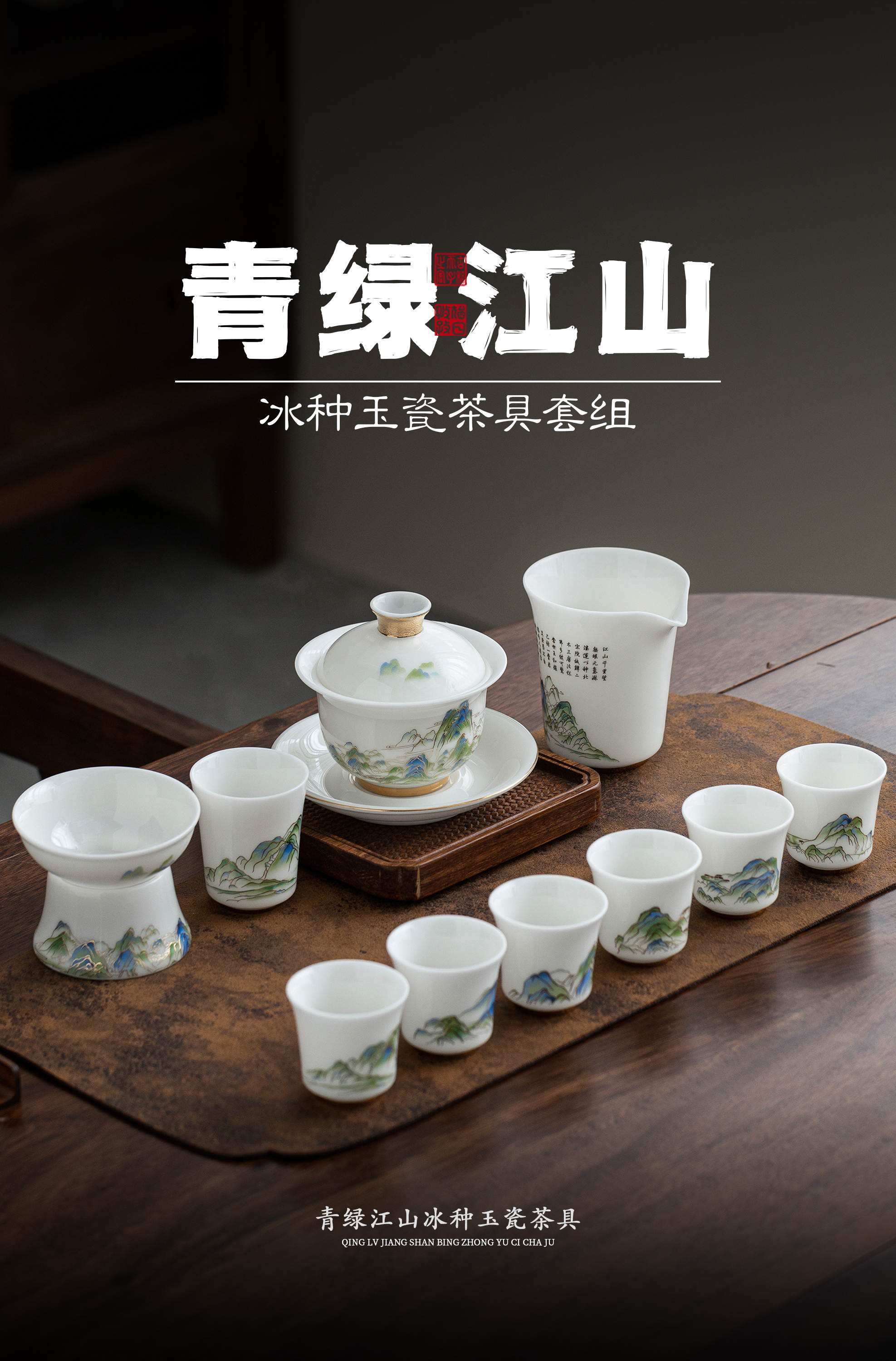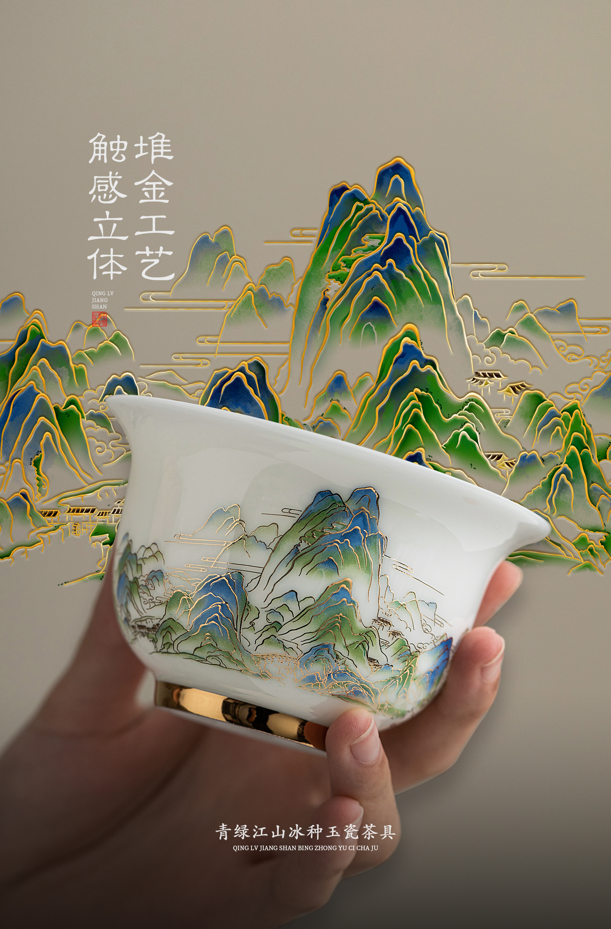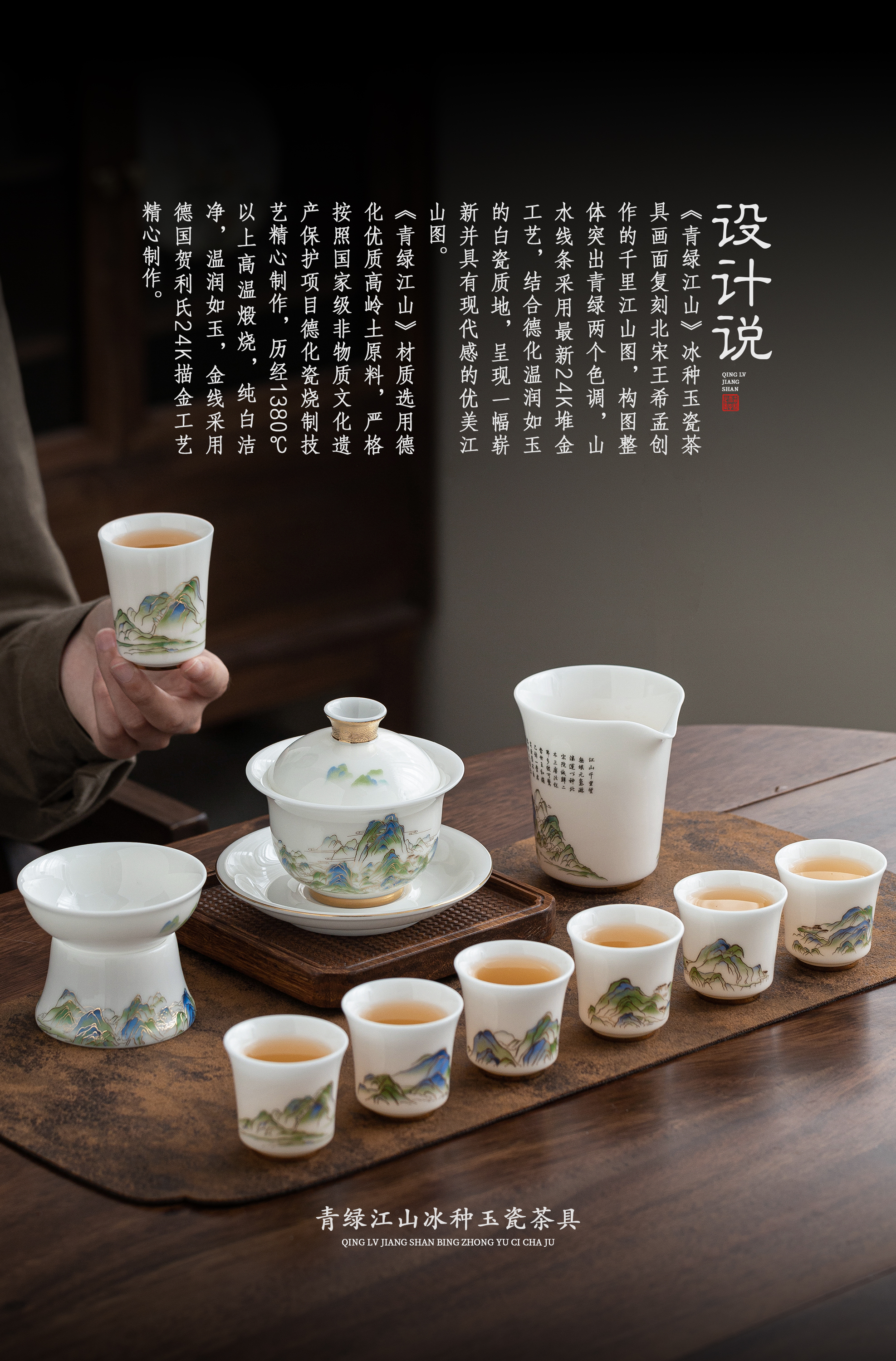 青绿江山.冰种玉瓷茶具套组,冰种玉瓷 温润如玉,堆金工艺 触感立体,精美包装 gao端好礼