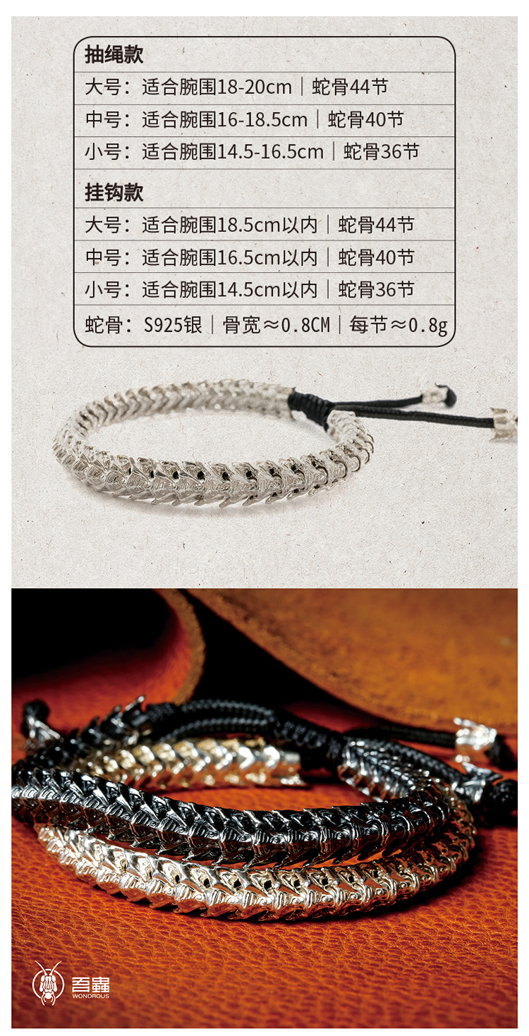 吾蟲-925银版 蛇骨手链 情侣个性复古百搭礼品做旧银饰【官方授权 48小时发货】