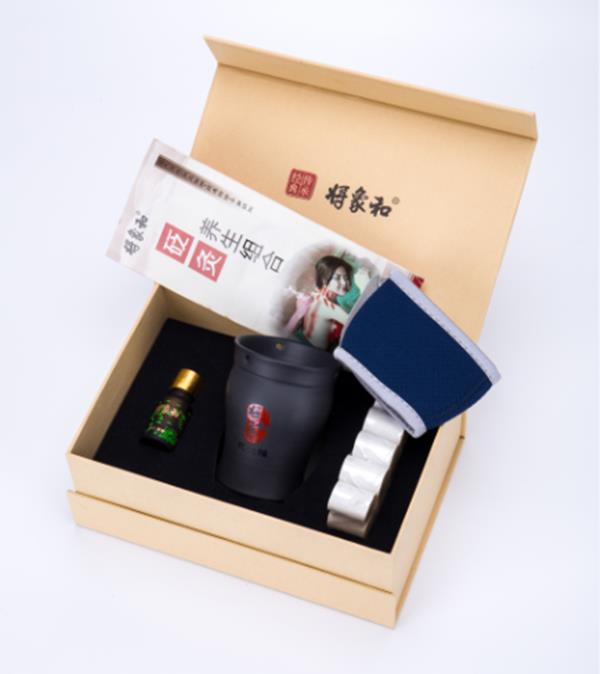 由“砭灸罐、蕲艾精油、专用艾柱、防护套”四部分组成。