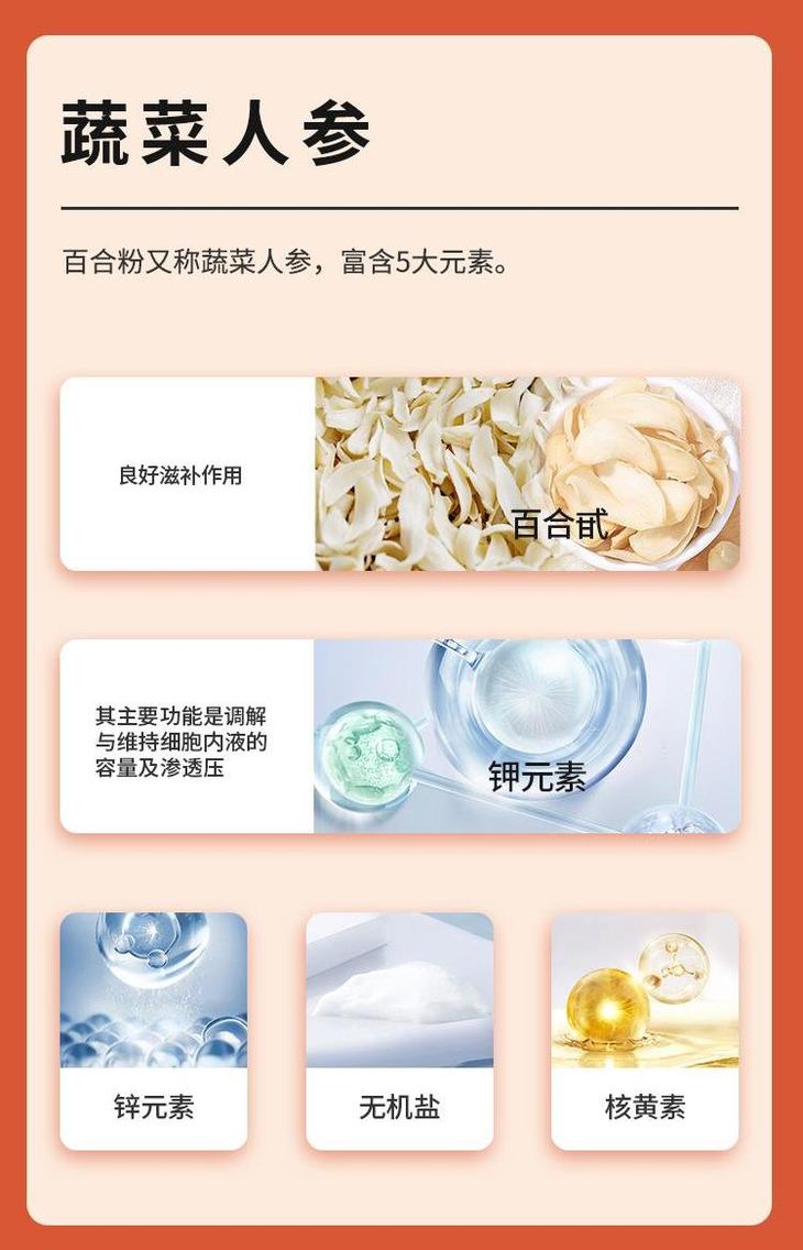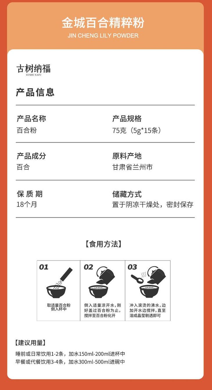 古树纳福精粹粉的百合,来自甘肃兰州古城金城,是百合四大产区之一,固有“金城百合甲天下〞之美誉。这里的百合生长在海拔1800-2600米高寒山谷,有充足的光照,适中的降水,寒冷湿润的气候,富含多种养分的土地,因此营养成分更高。配料表干干净净,天然0添加,纯纯的百合粉,10公斤新鲜百合仅能萃取1公斤精粹粉,每一克都是浓缩的精华。