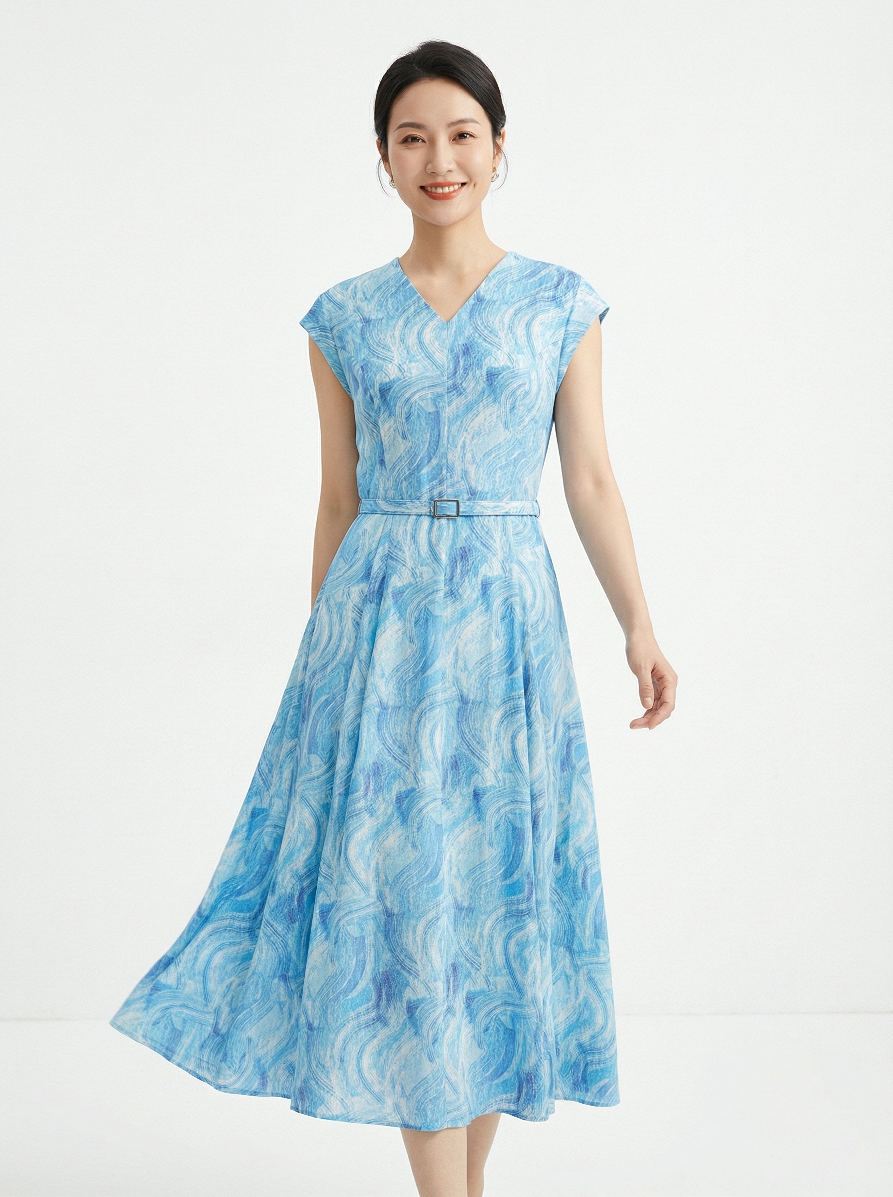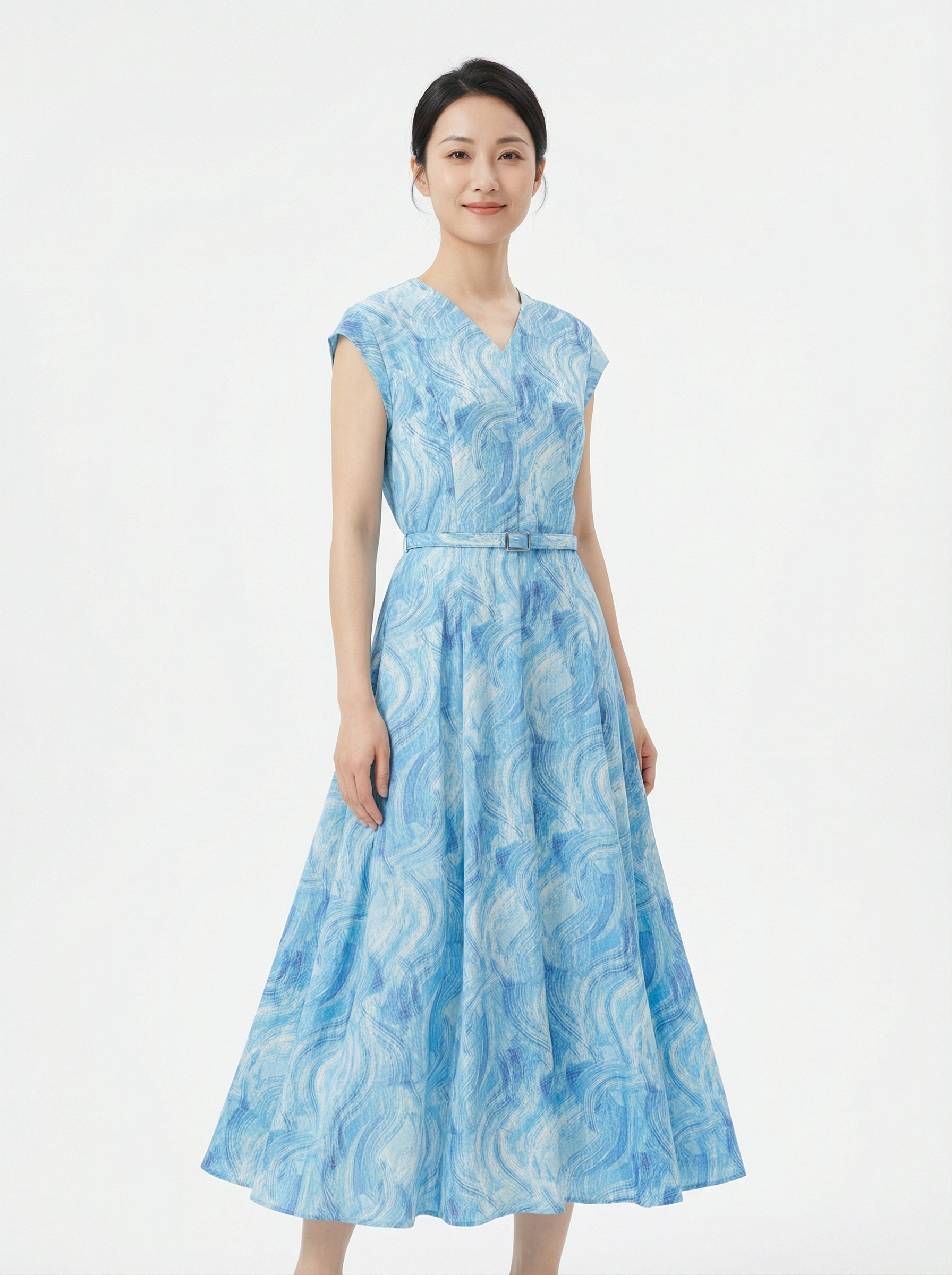 SC2S67_窃蓝色_连衣裙_夏季_V领盖肩短袖腰带收腰 A 字大摆中长款_高级女装_BERNIEELEN 伯妮斯茵