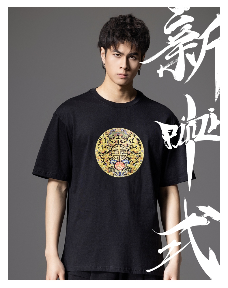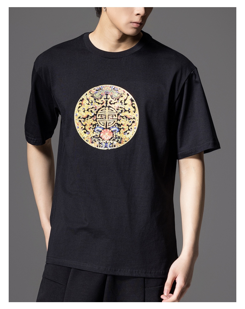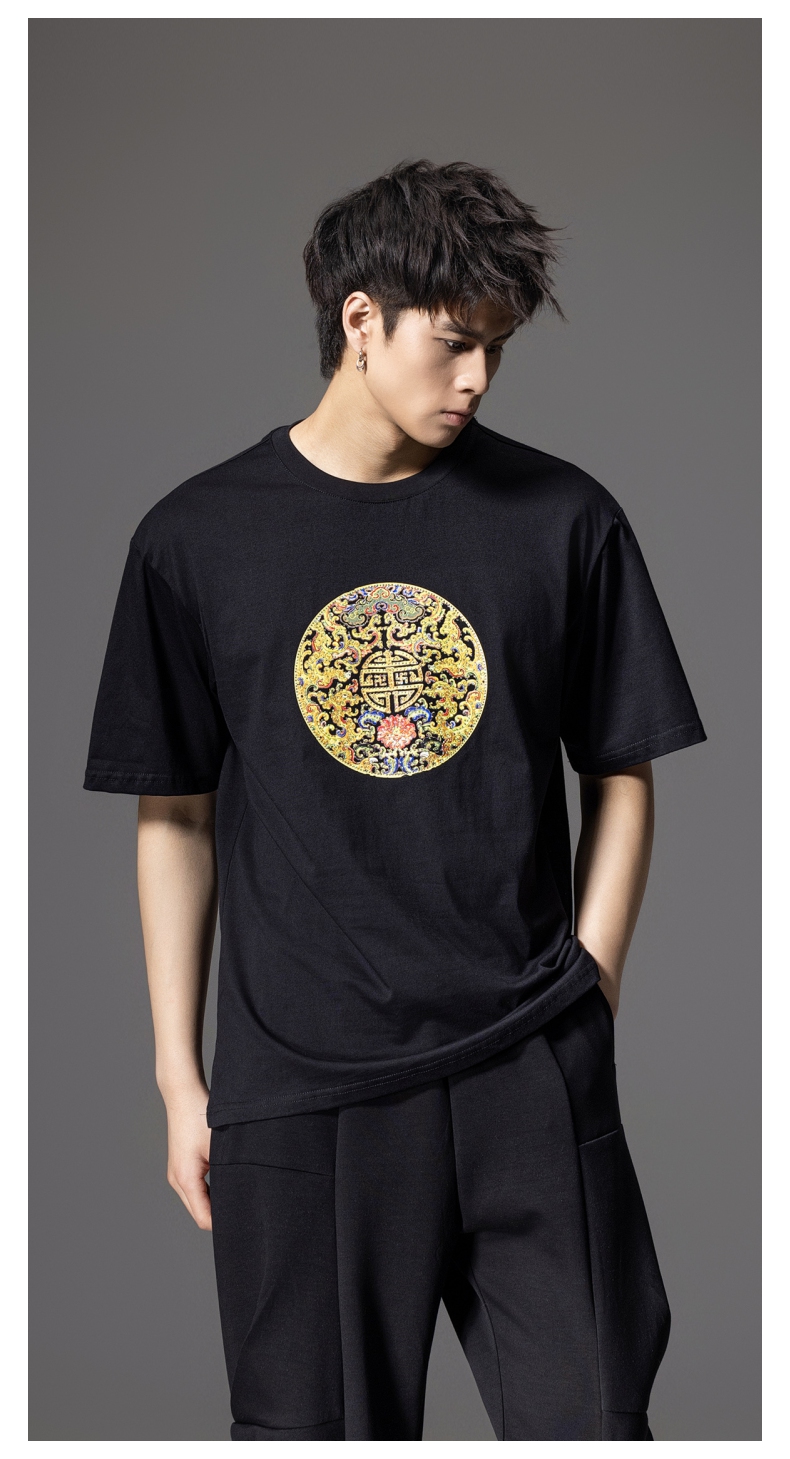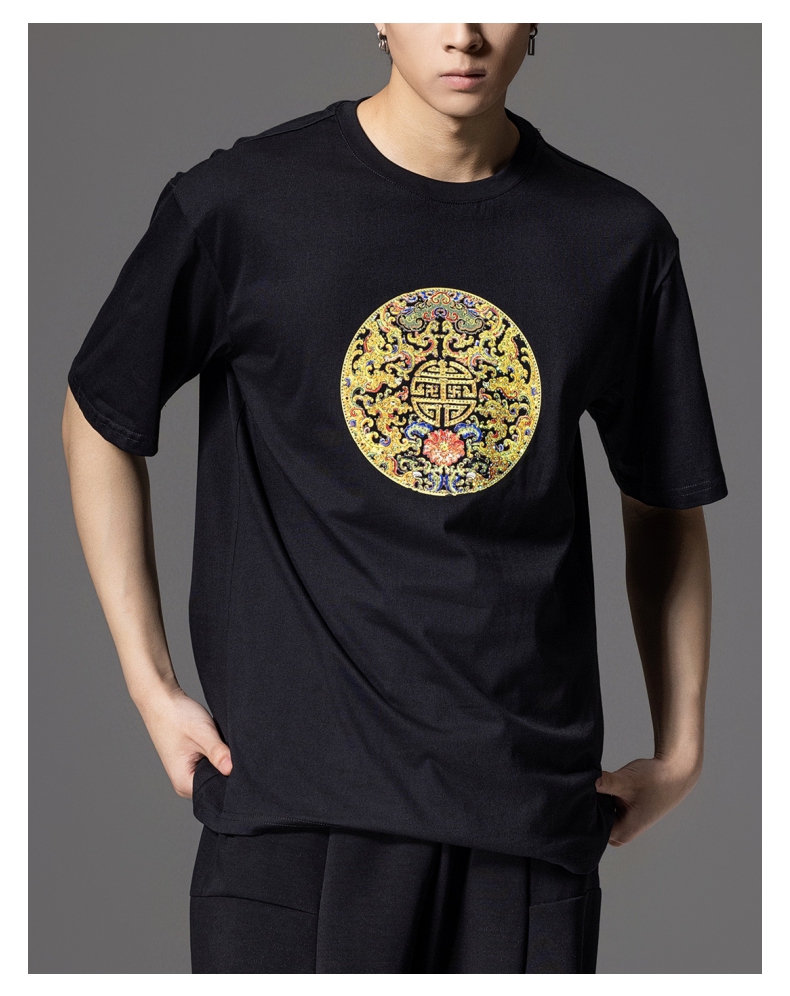 PINLI品立2024新中式夏季新款男烫钻印花圆领短袖T恤BG242111021