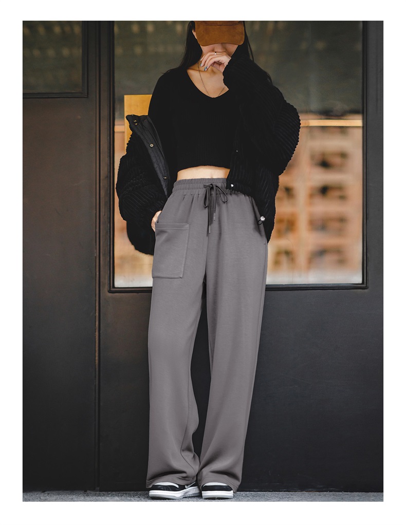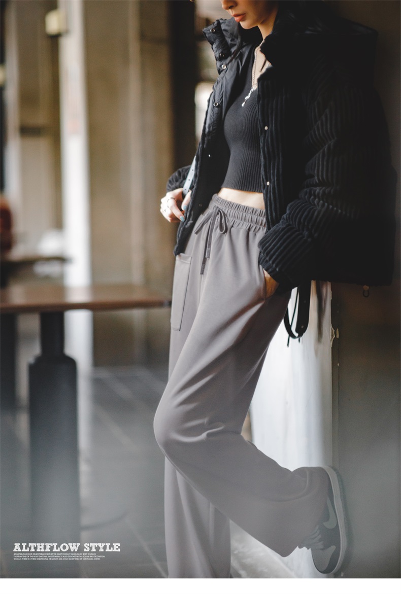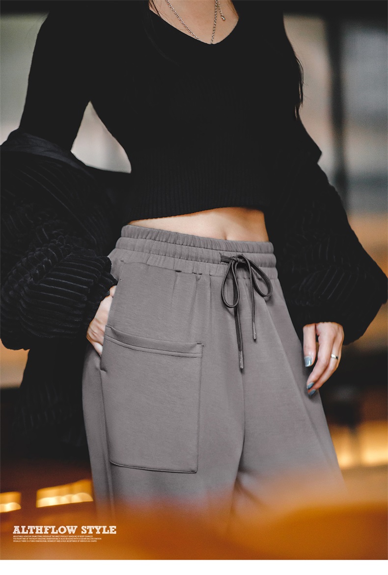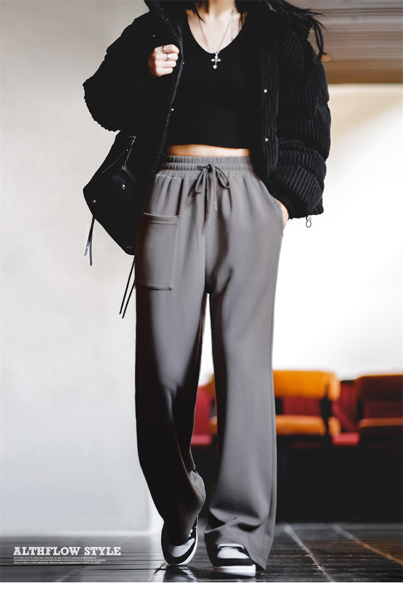 马登女装深灰色卫裤直筒垂感显瘦阔腿拖地腰绳弯刀裤加长版高个子