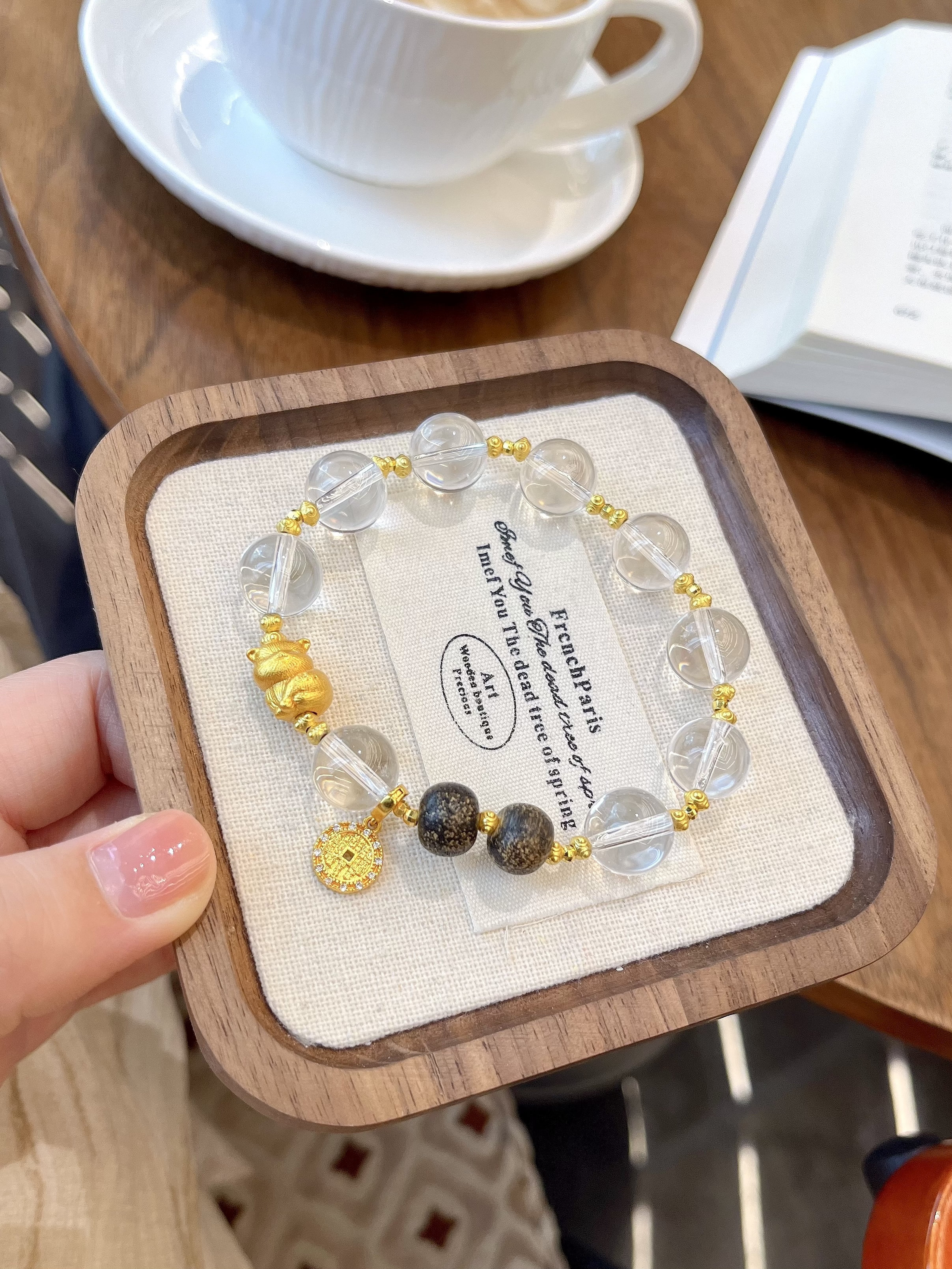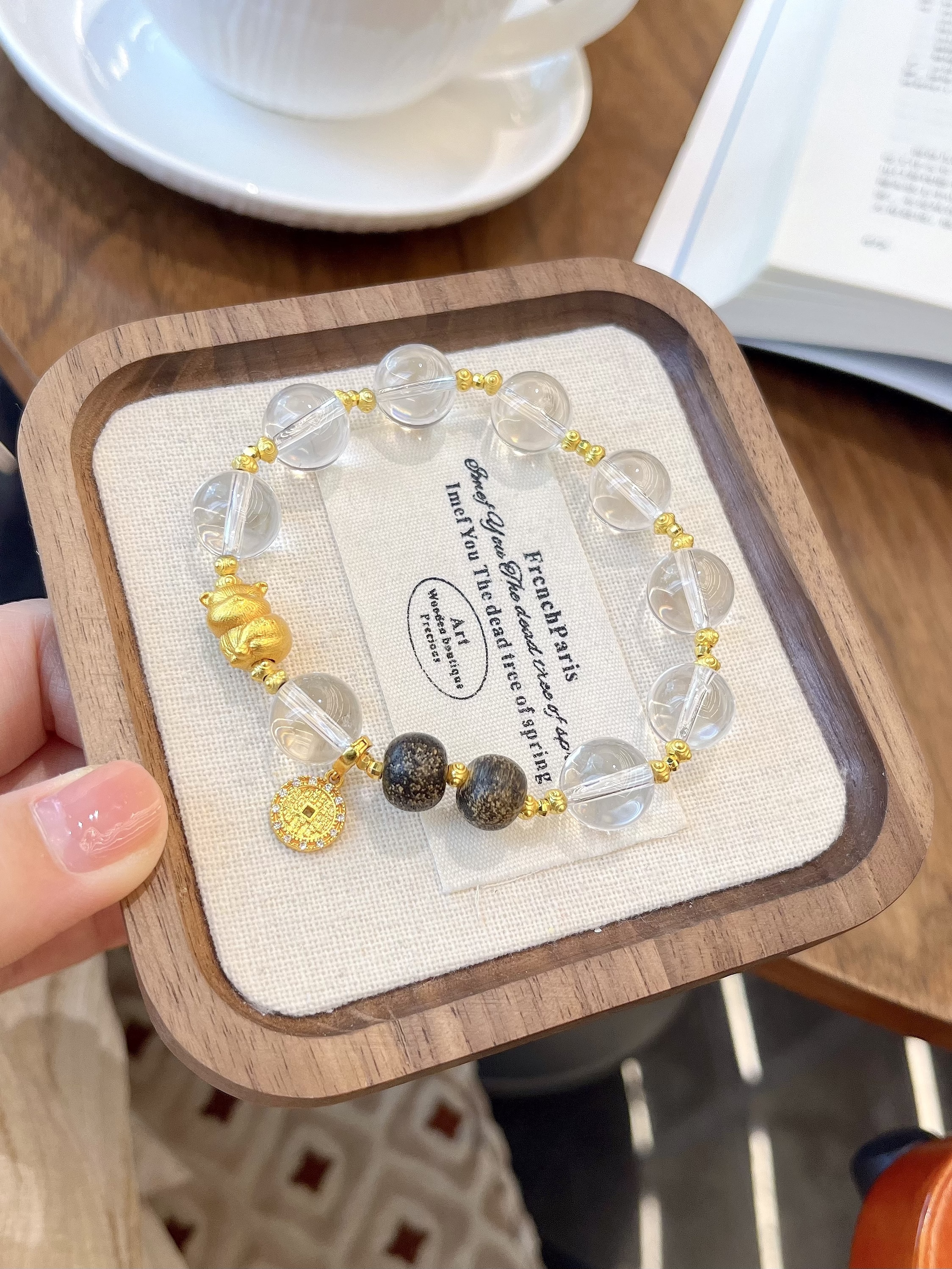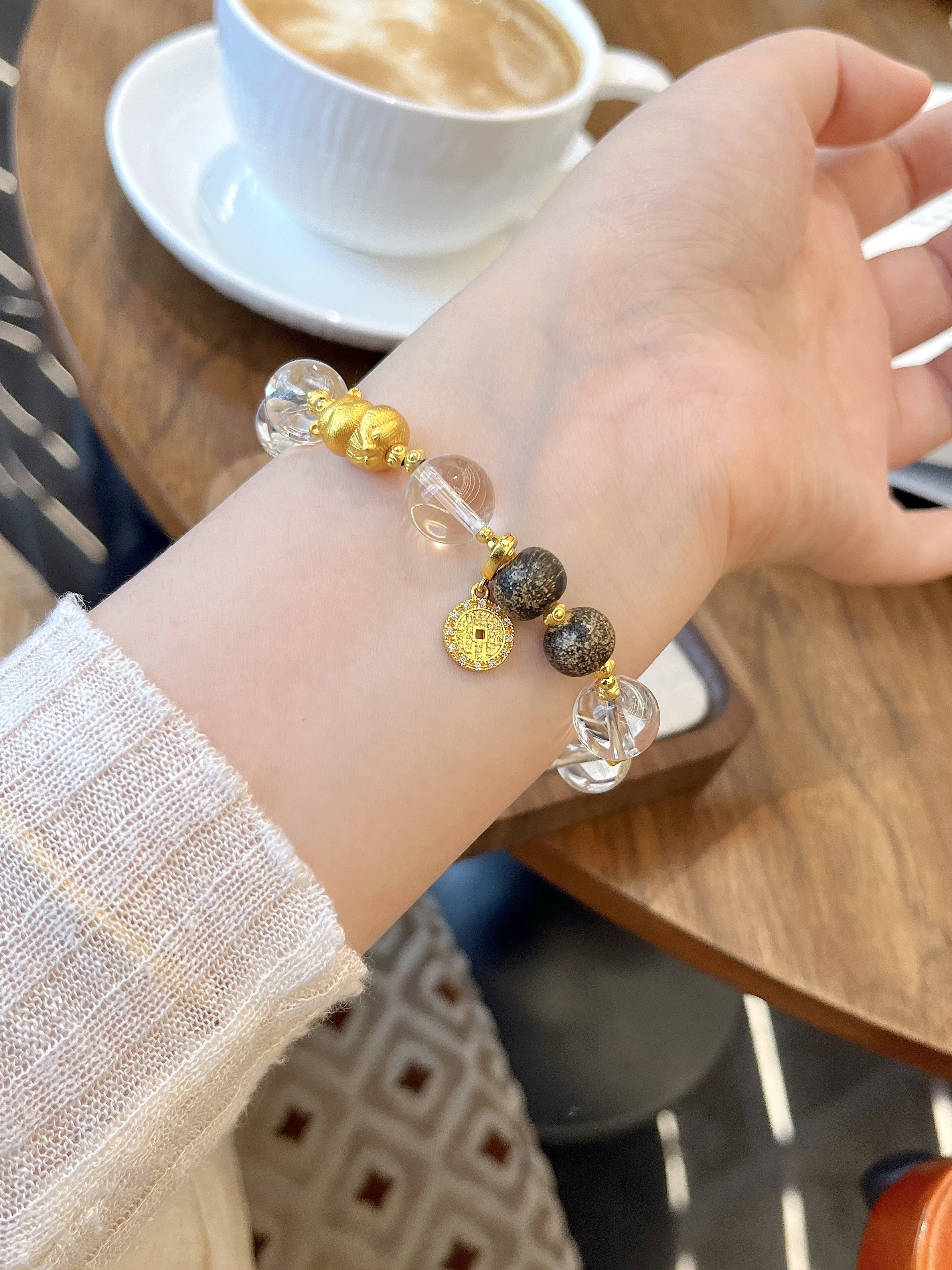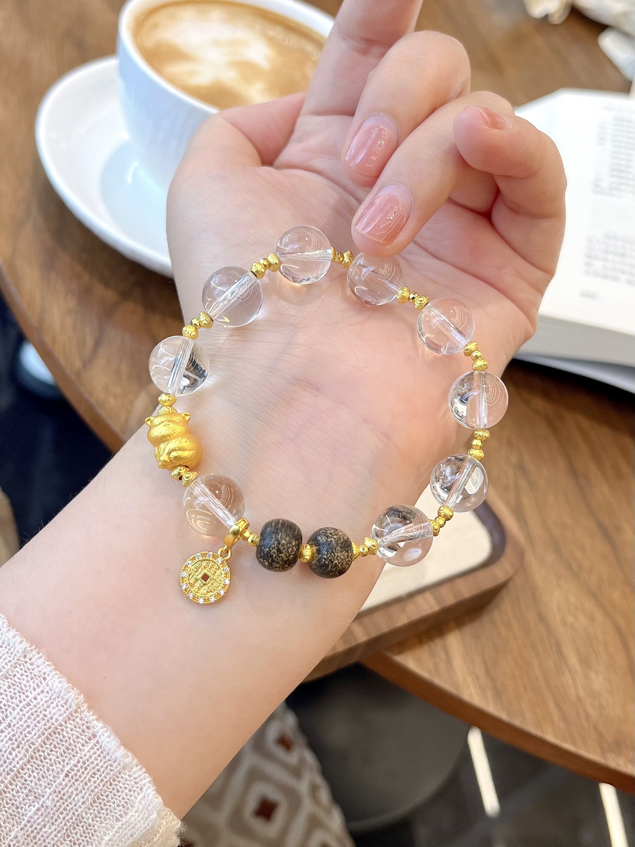 天然白水晶搭配沉香木,沙金小猫、招财钱币配件,水晶尺寸约12mm左右