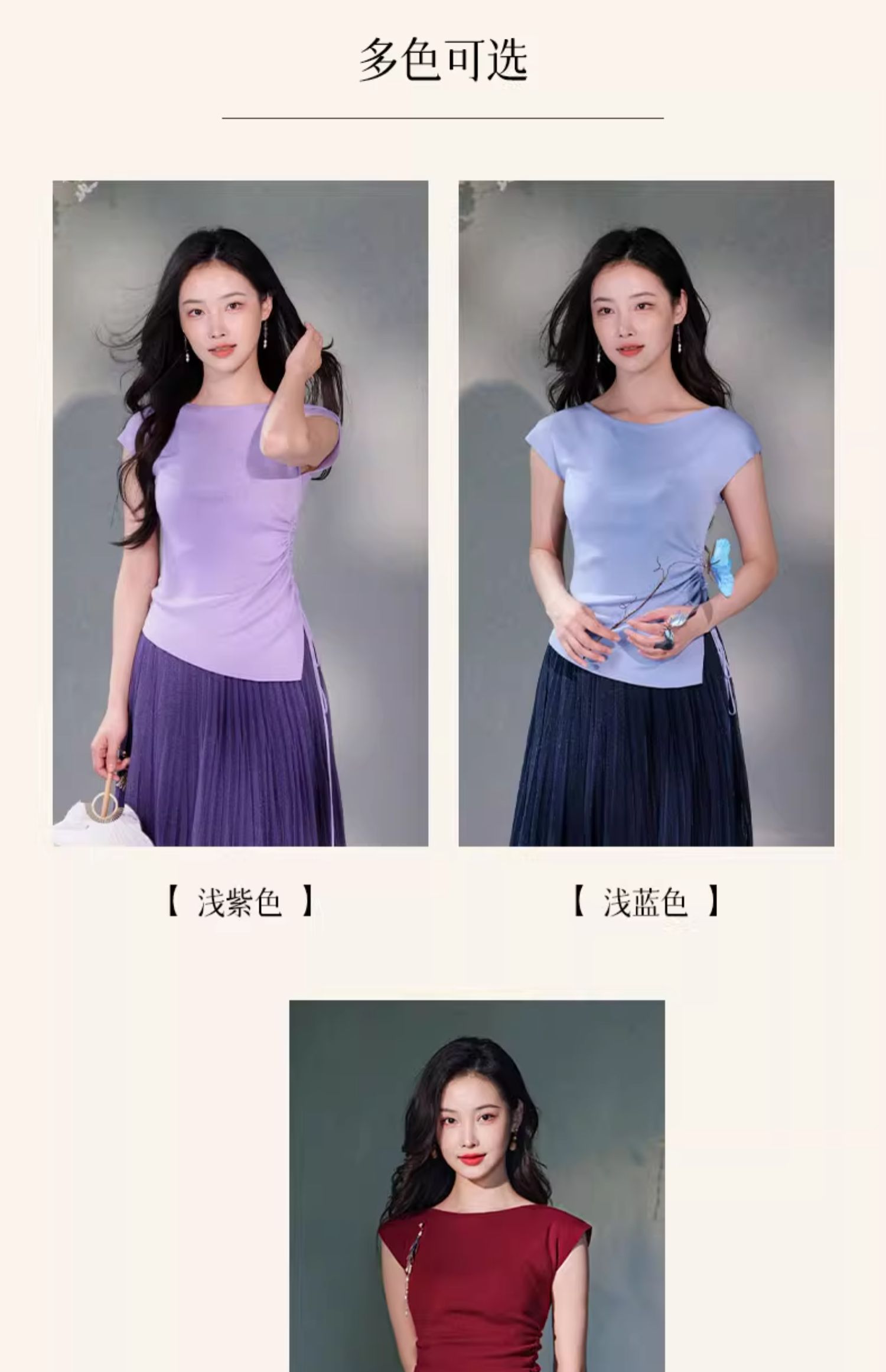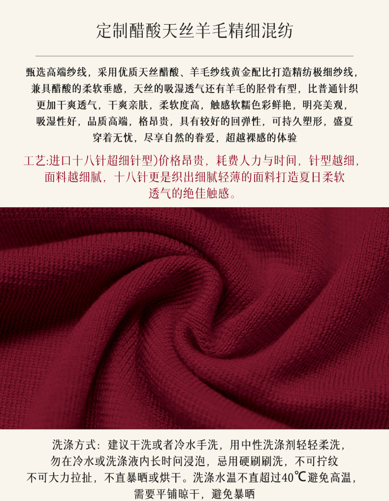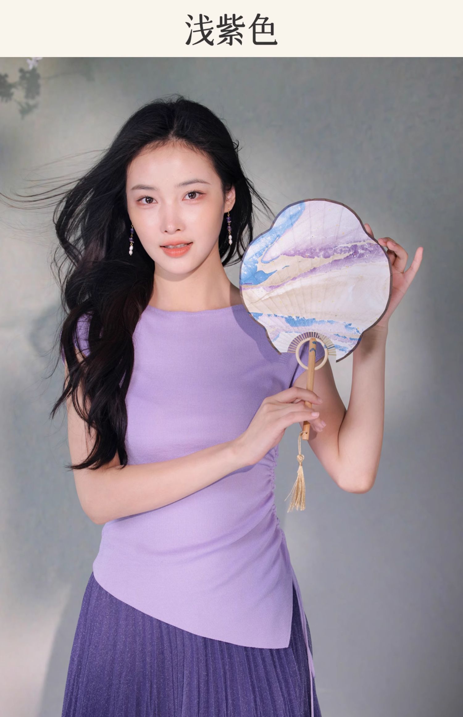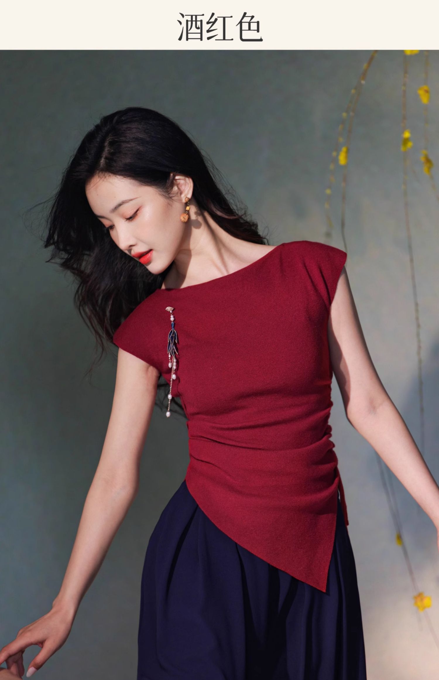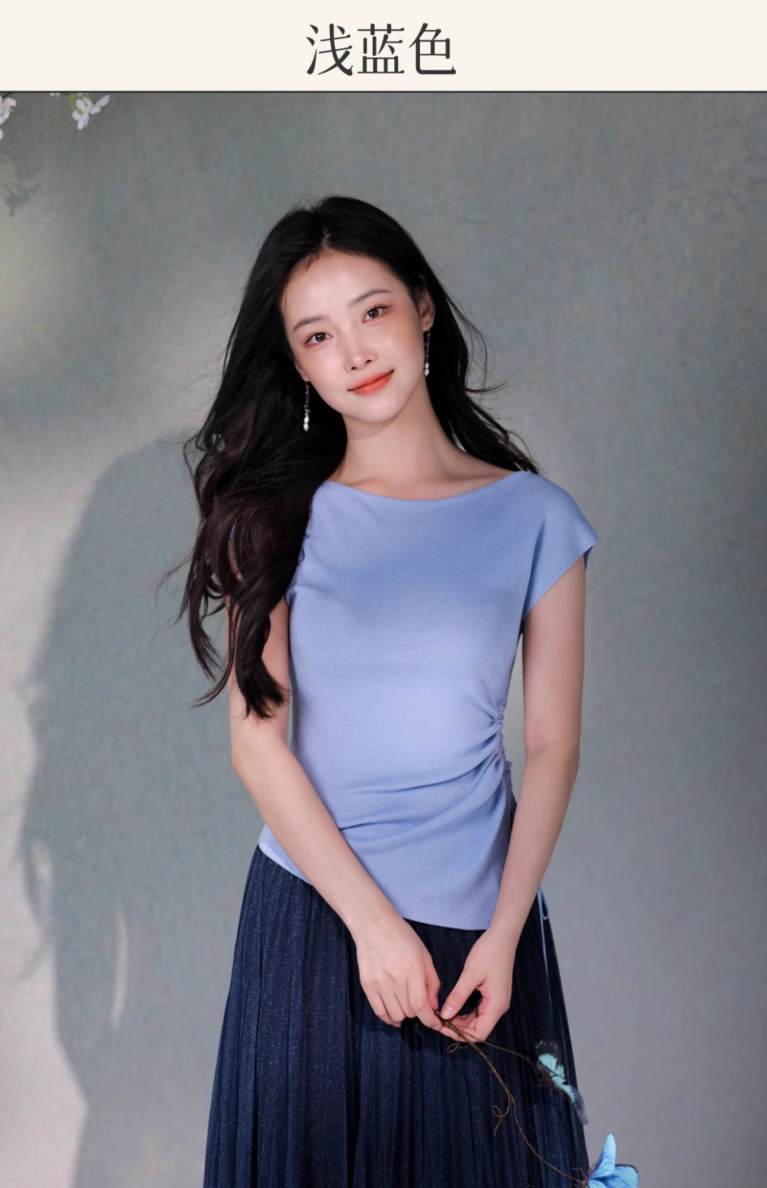 逸红颜博初2025夏新款冰感醋酸羊毛抽褶一字领针织衫新中式上衣女