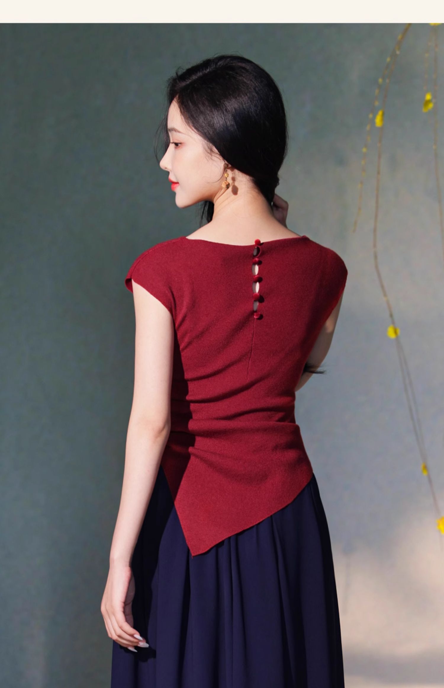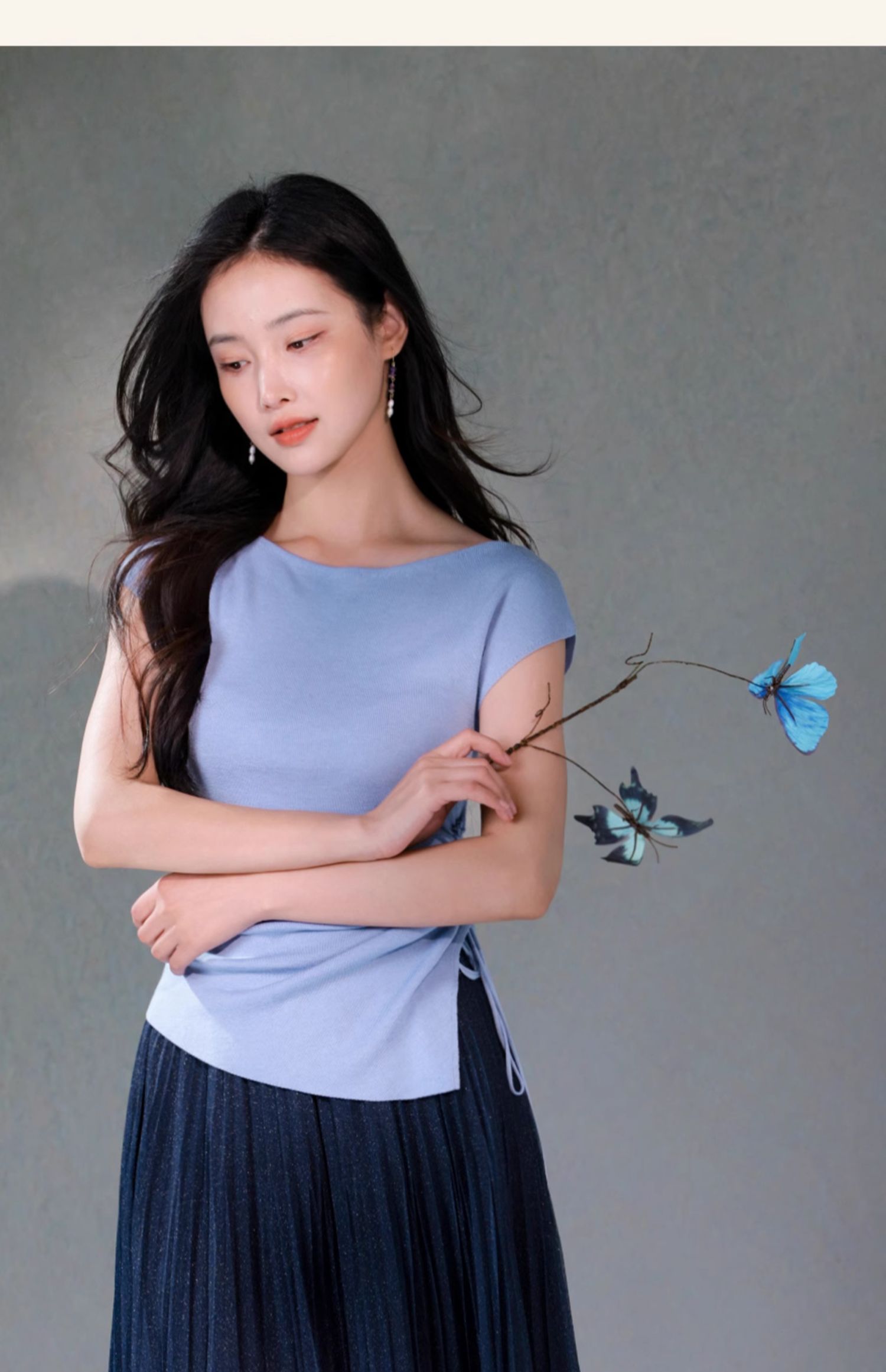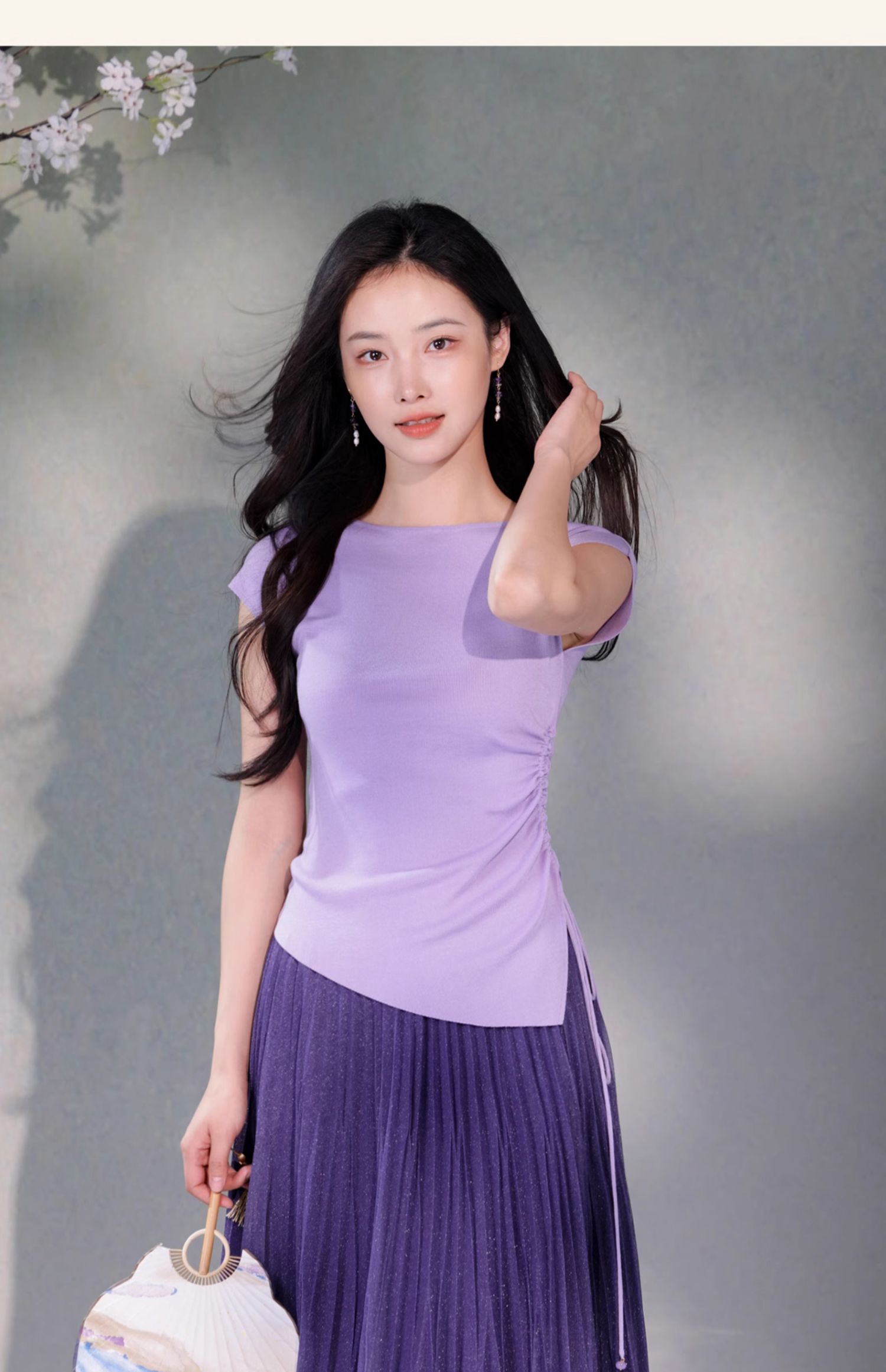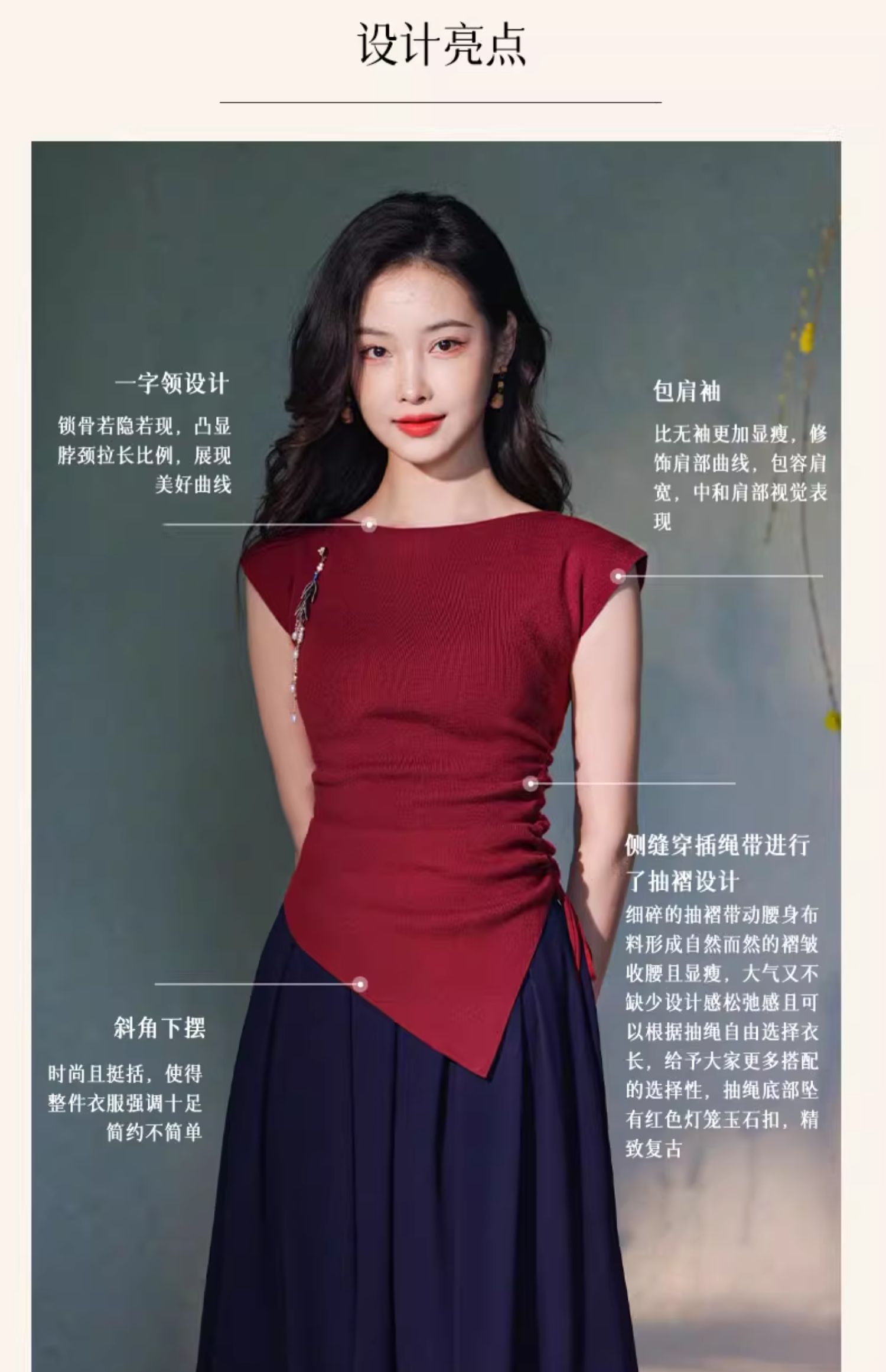 逸红颜博初2025夏新款冰感醋酸羊毛抽褶一字领针织衫新中式上衣女