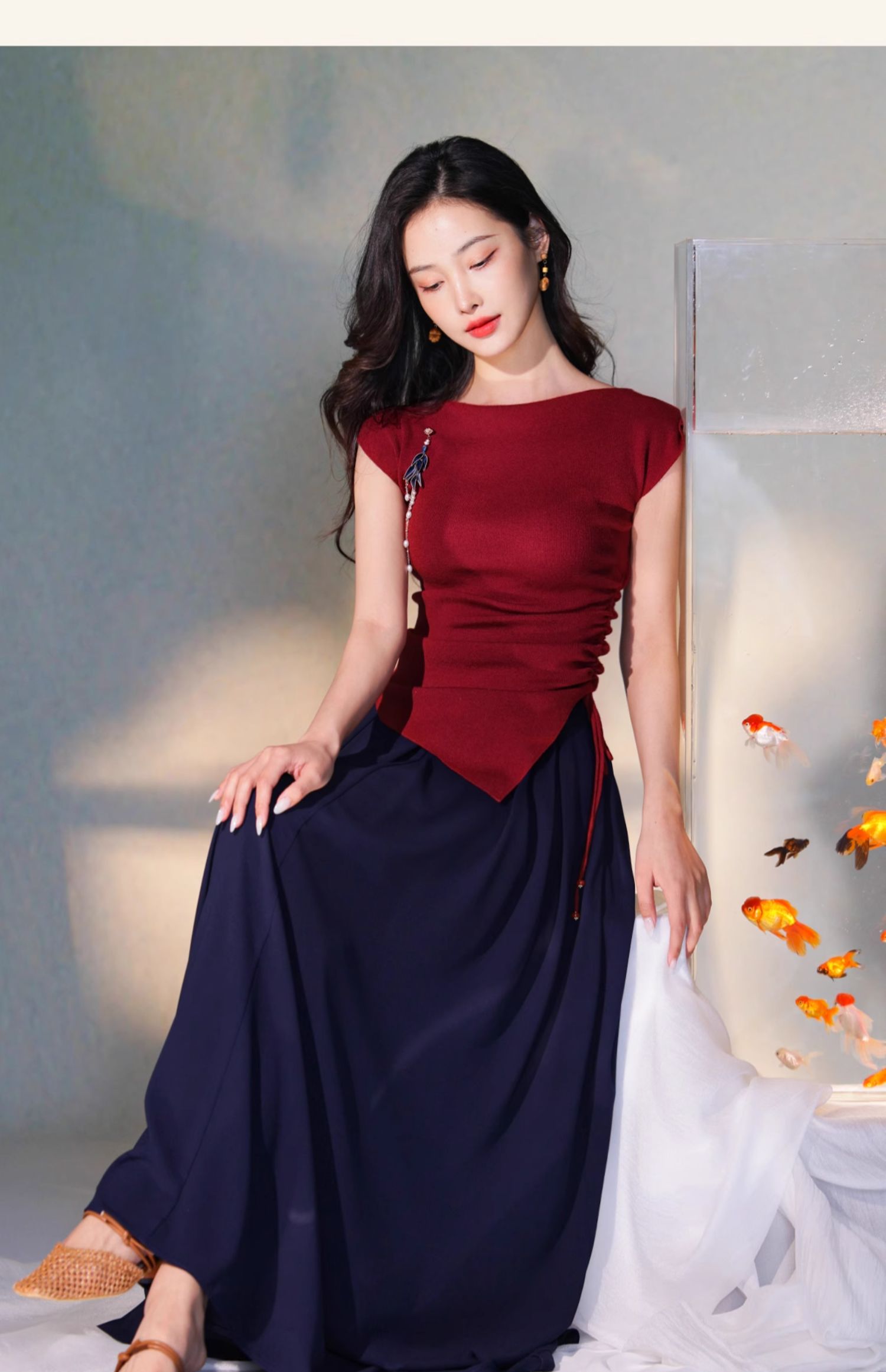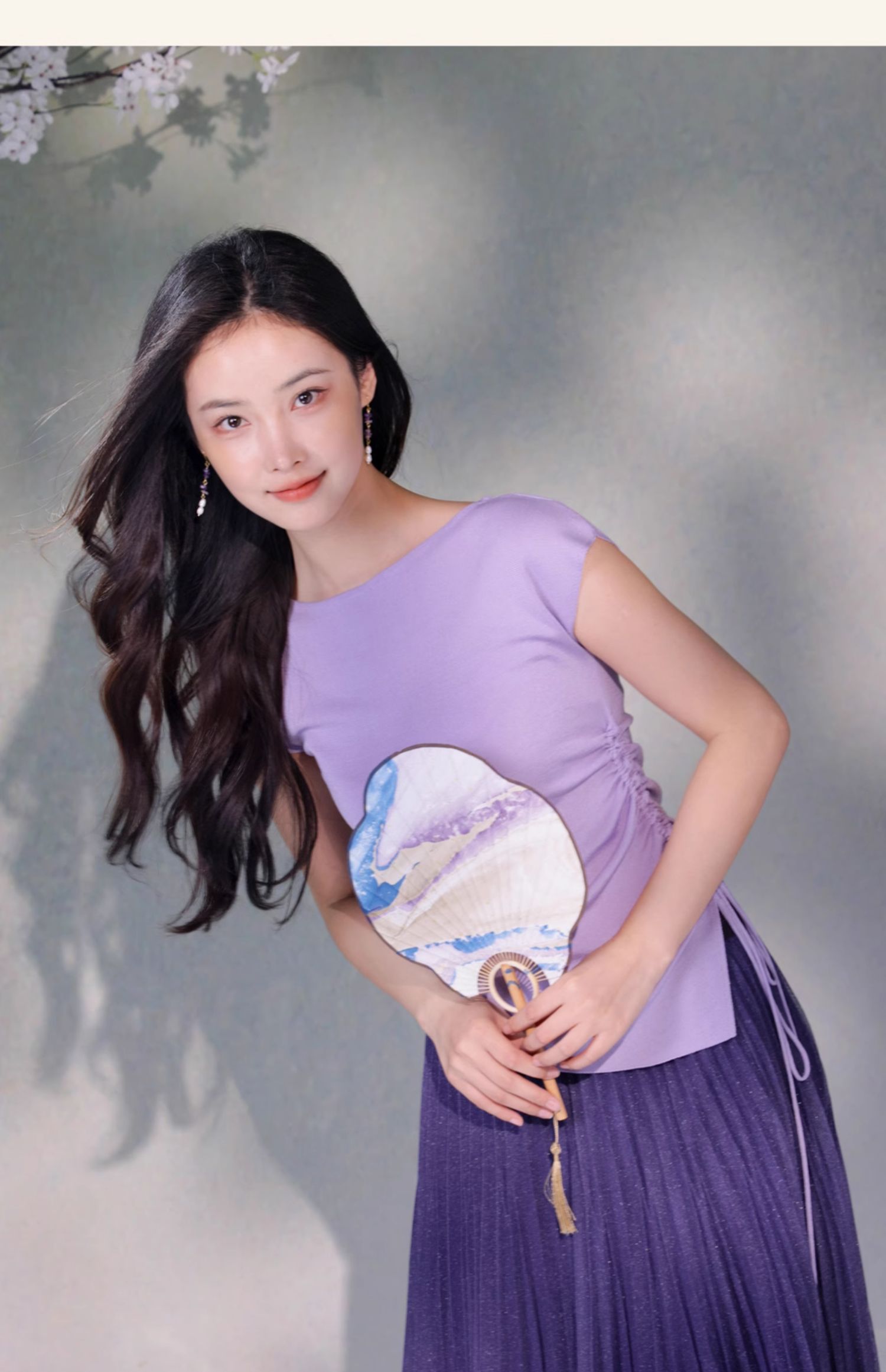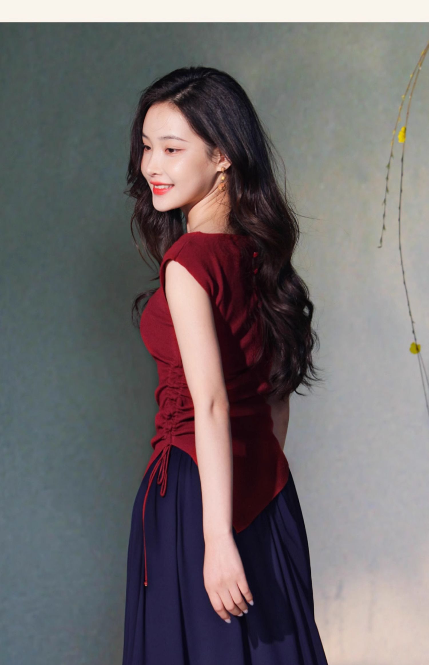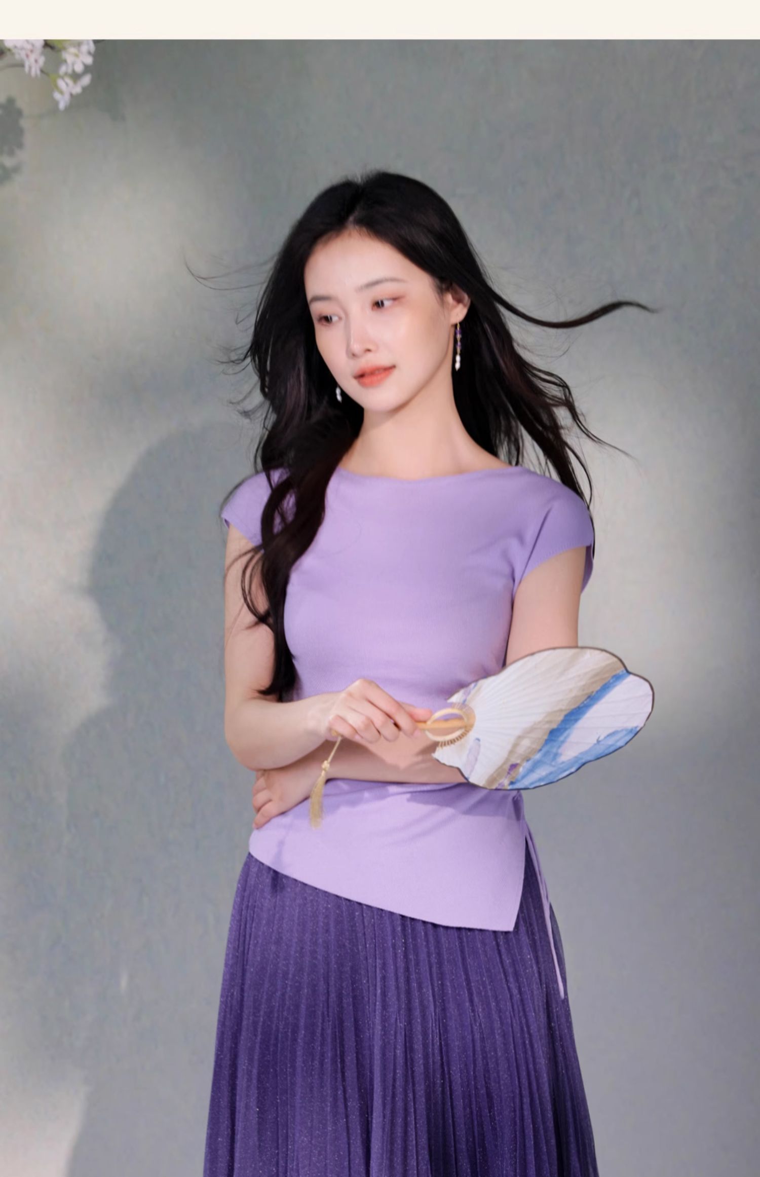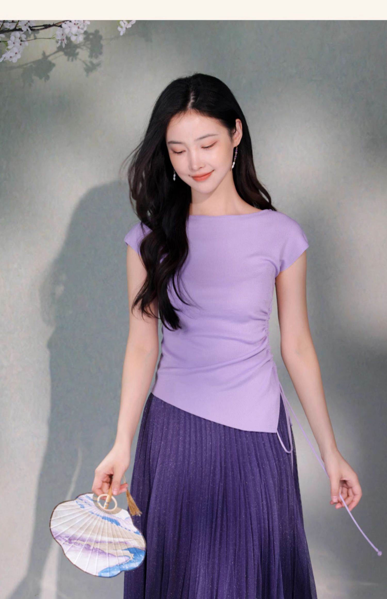 逸红颜博初2025夏新款冰感醋酸羊毛抽褶一字领针织衫新中式上衣女
