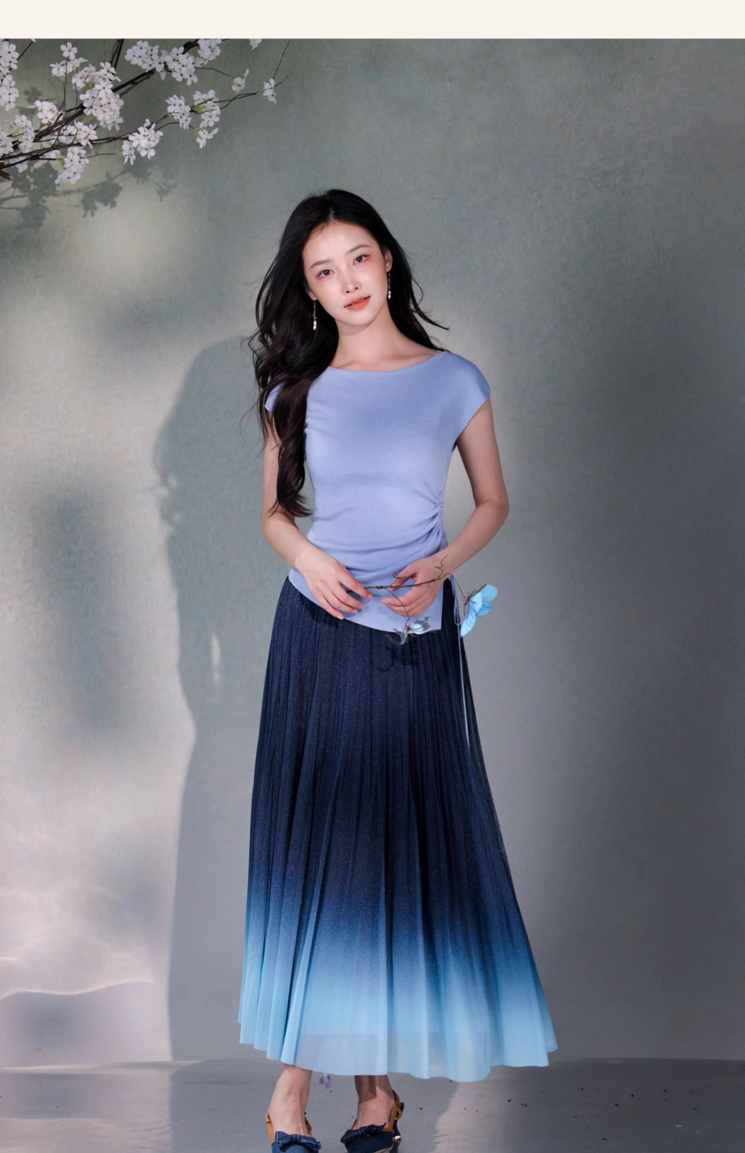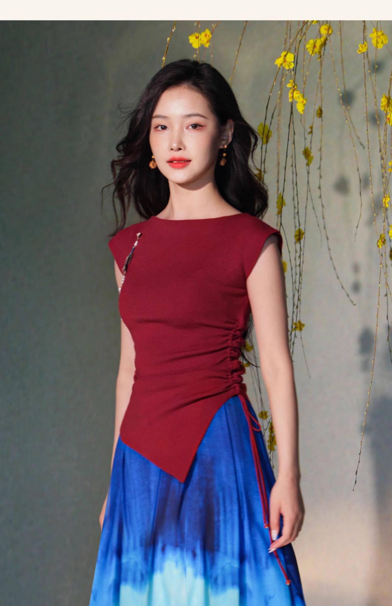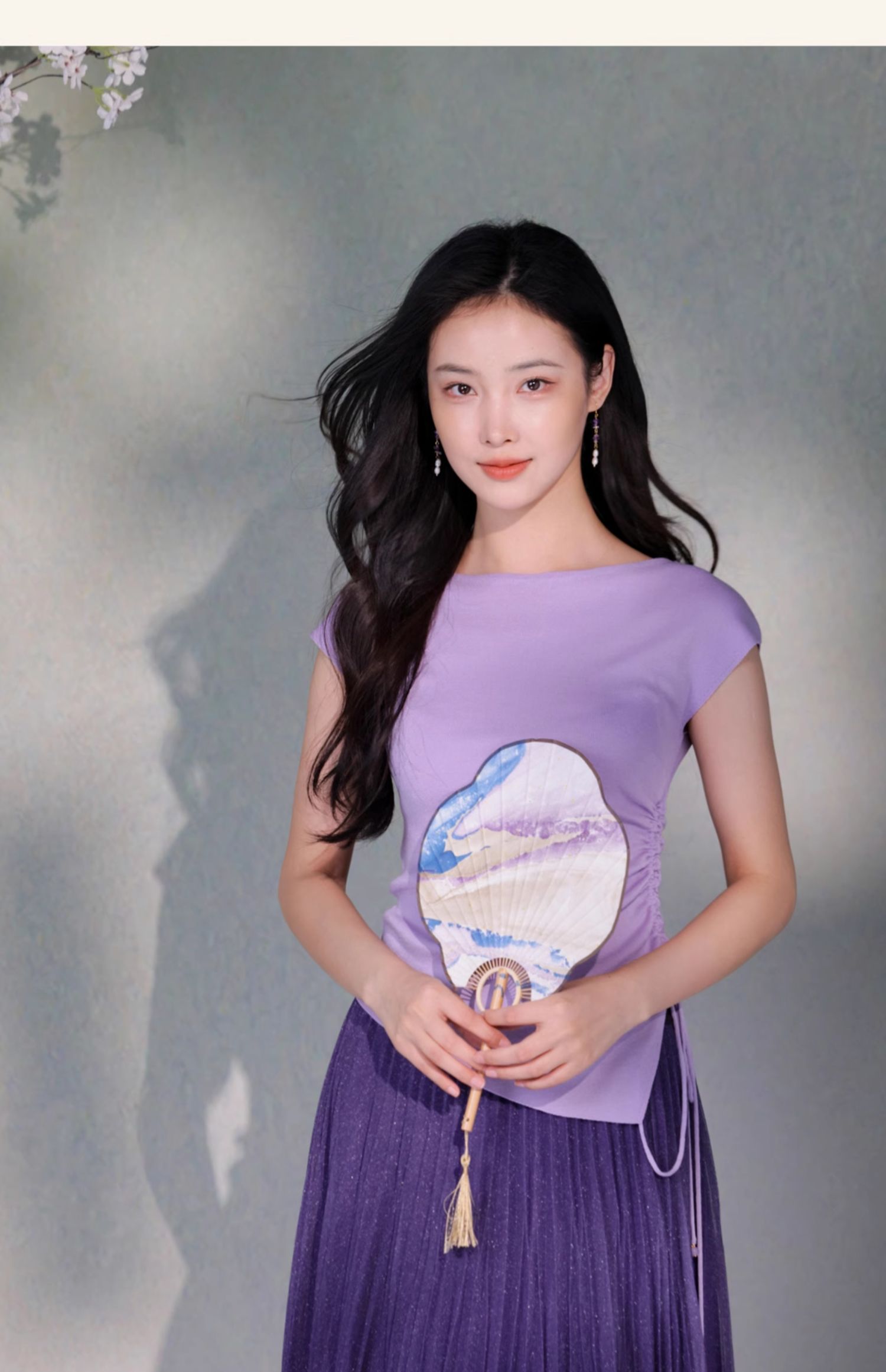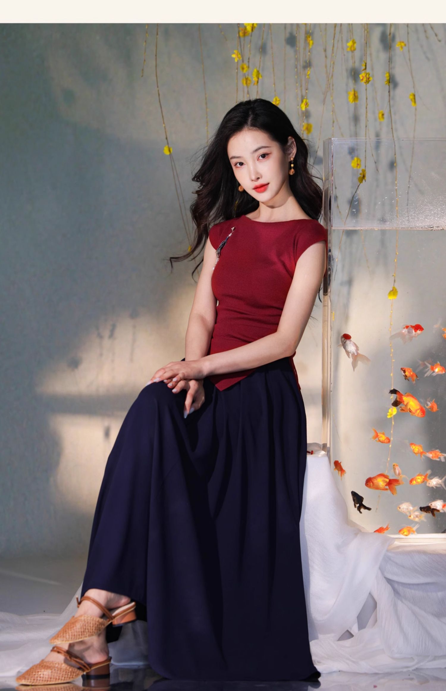 逸红颜博初2025夏新款冰感醋酸羊毛抽褶一字领针织衫新中式上衣女