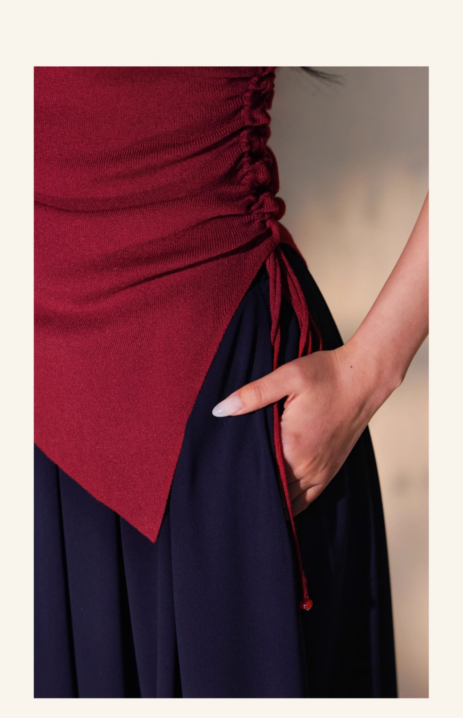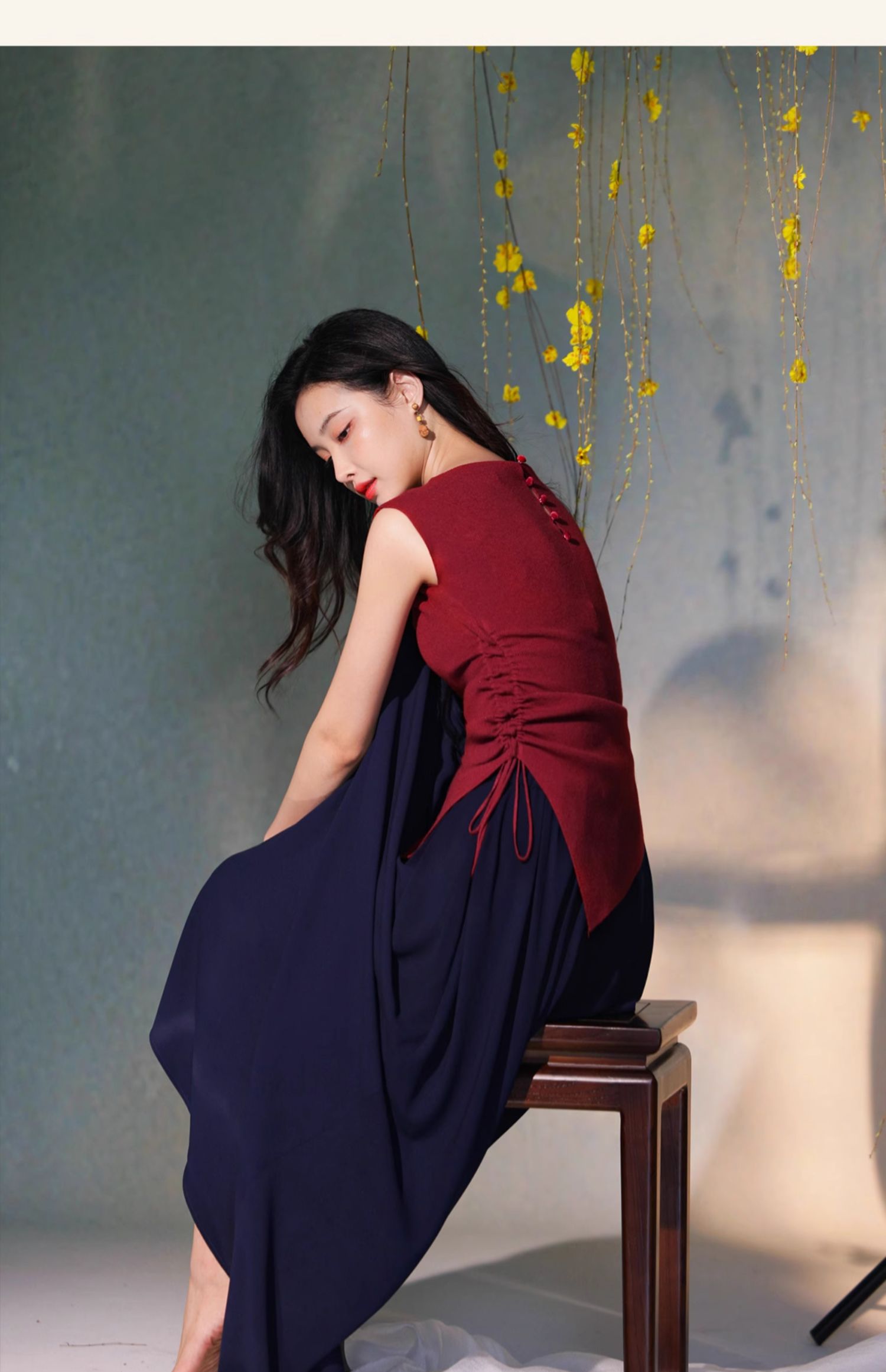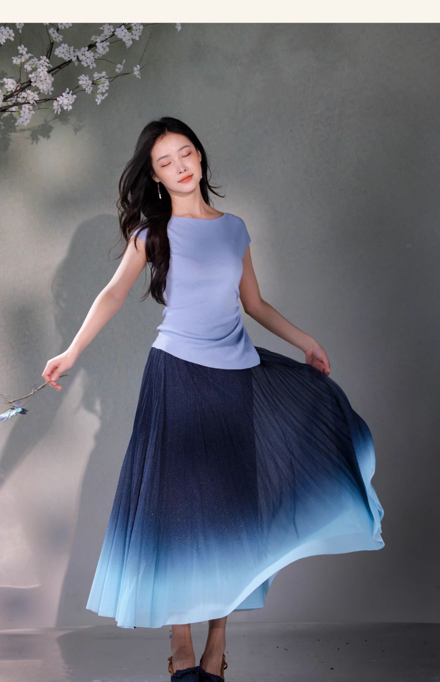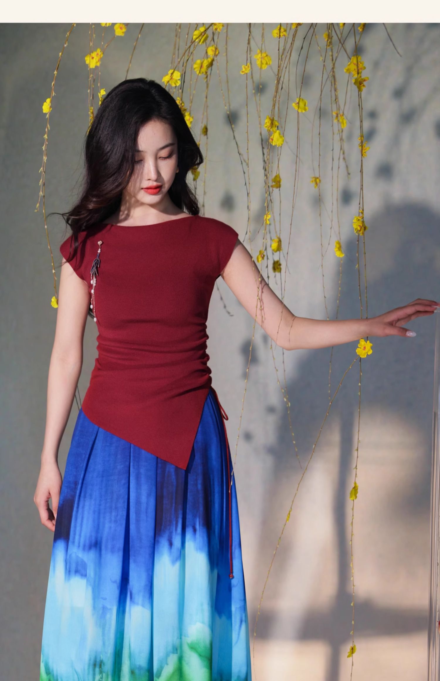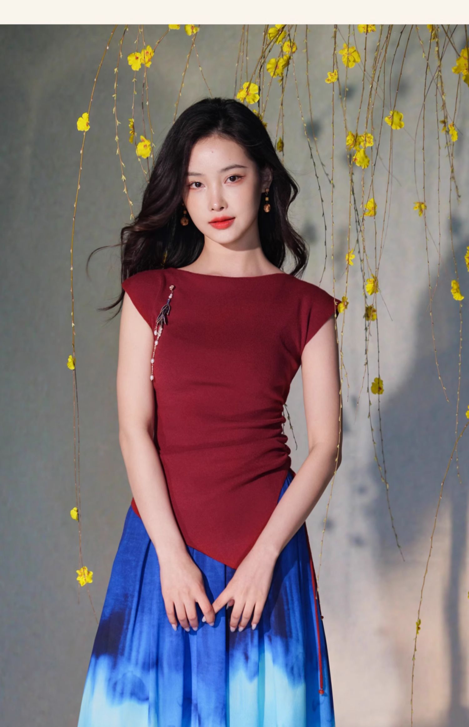 逸红颜博初2025夏新款冰感醋酸羊毛抽褶一字领针织衫新中式上衣女