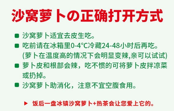 3. 关于萝卜断裂:沙窝萝卜脆嫩多汁,一拍即裂,冬天气温较低,长途运输过程包裹可能存在挤压摔碰,个别萝卜会有破碎并不影响食用,所以不予售后赔款。