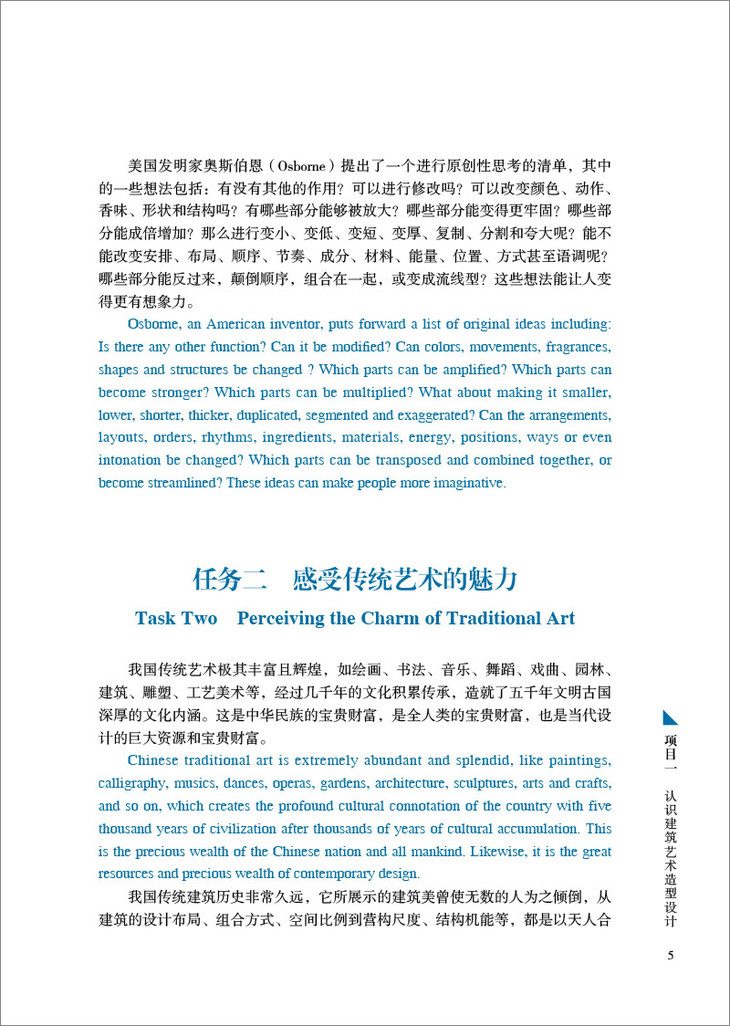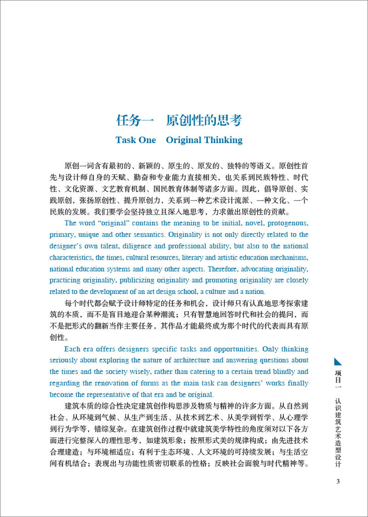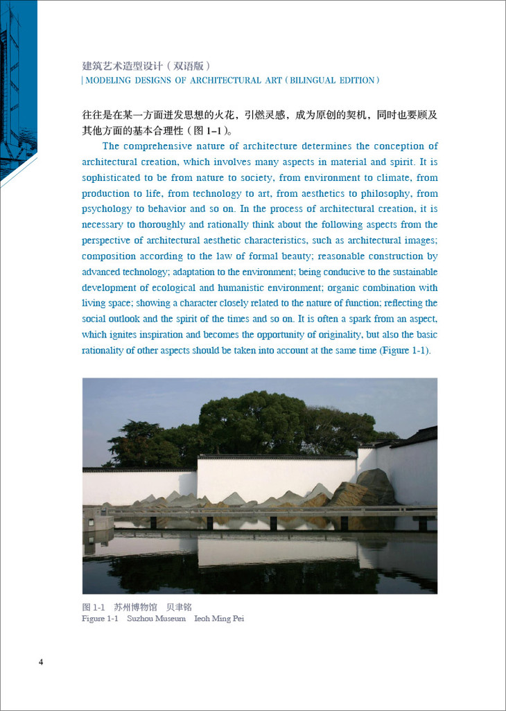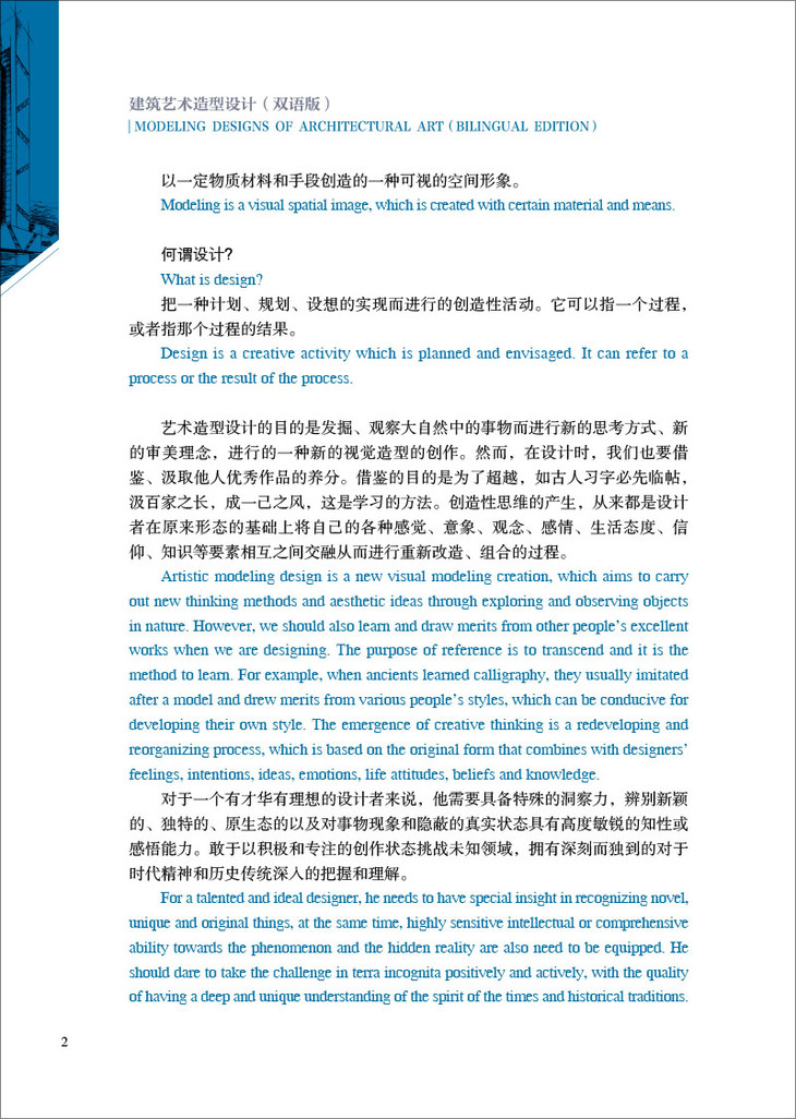 为进一步培养国际视野的复合型高素质专业人才,编者结合自己多年课堂教学经验和中外设计师的精彩设计案例,编制符合学生学习的双语教材。本书可作为建筑设计、建筑装饰、城镇规划、园林设计、中国古建筑、室内设计、环境艺术设计等专业的教材和设计参考书,亦可作为普通读者赏鉴、品味建筑设计美学,提升审美水平的上佳读本。
