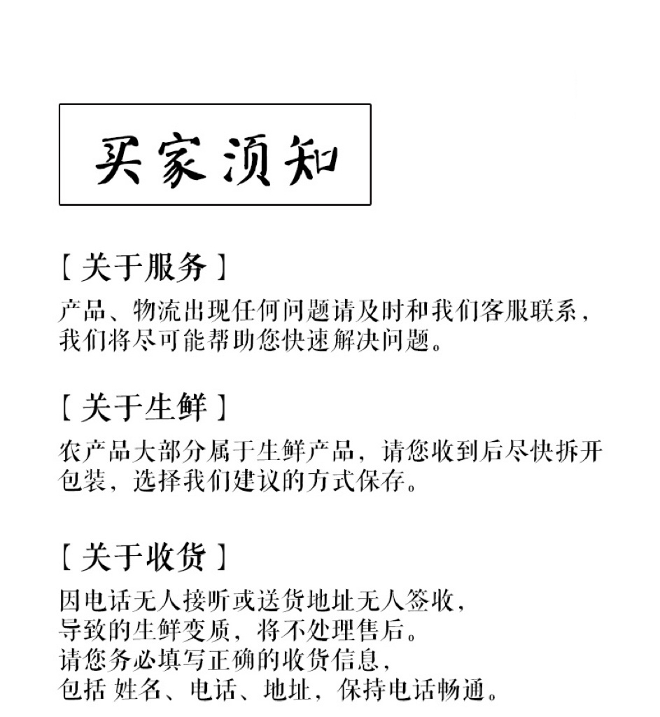 2.到货后,先签收,在6小时内把快递单和产品放一起拍照,证明其问题所在,再进行售后赔付。轻微磕碰不影响食用的不理赔!