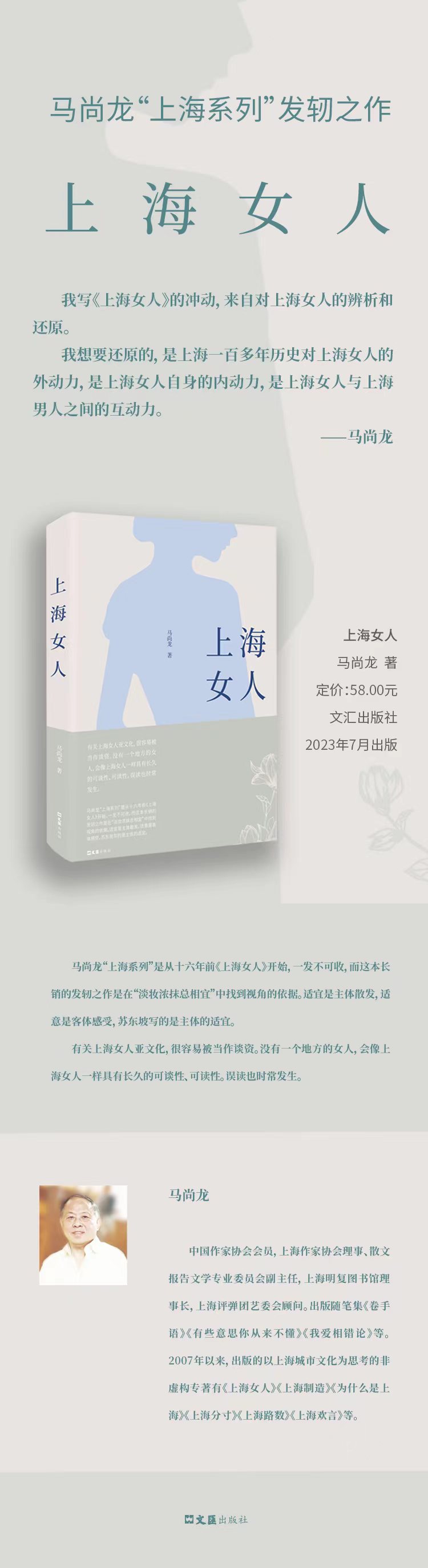 马尚龙;上海系列是从十六年前《上海女人》开始,一发不可收,而这本长销的发轫之作是在;淡妆浓抹总相宜中找到视角的依据。适宜是主体散发,适意是客体感受,苏东坡写的是主体的适宜。