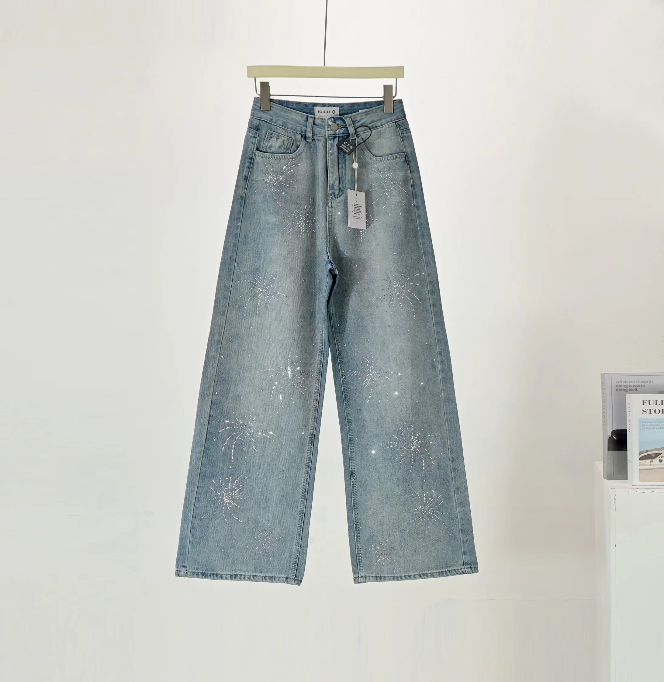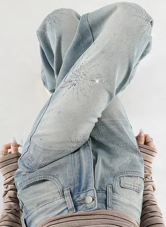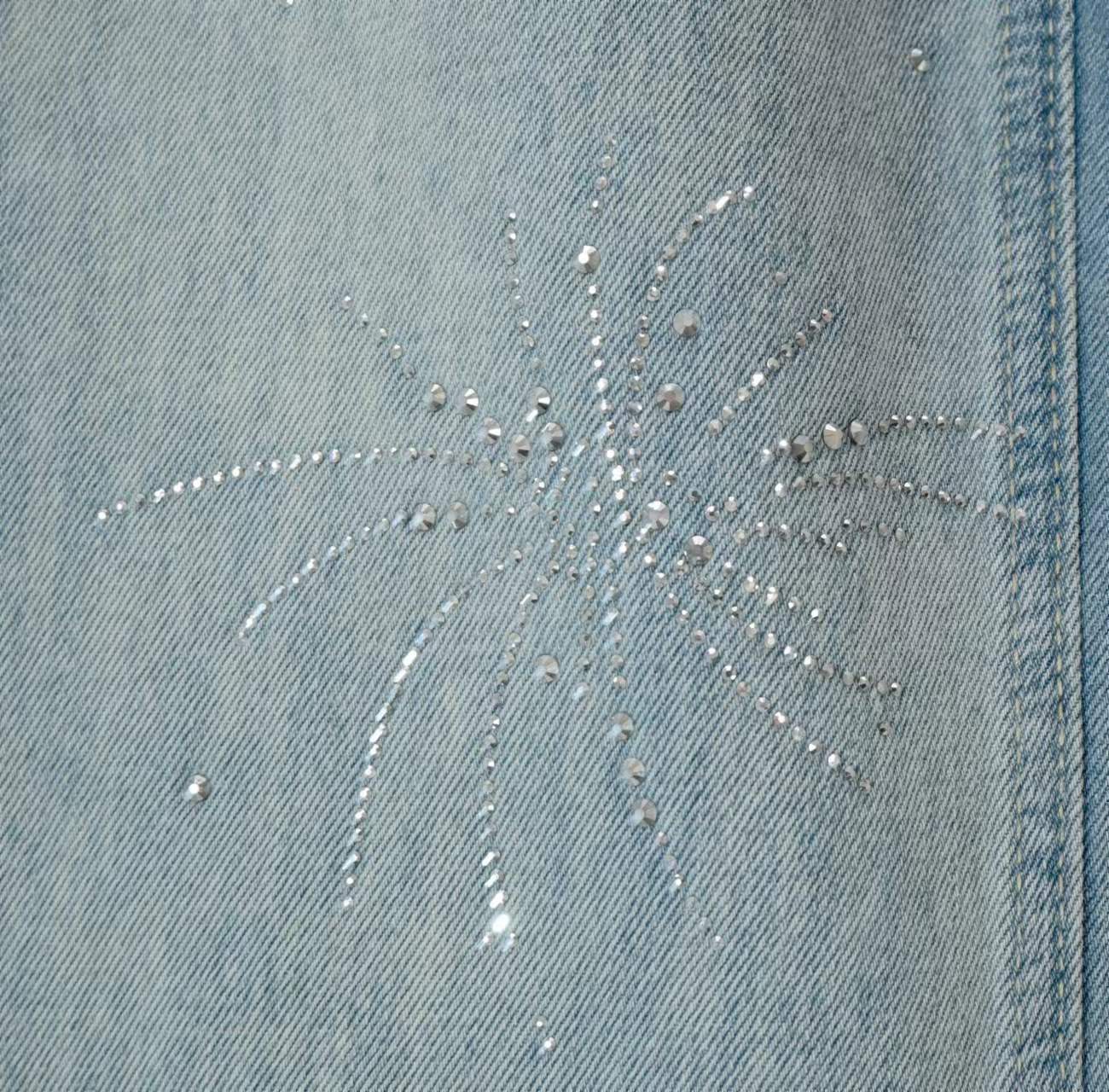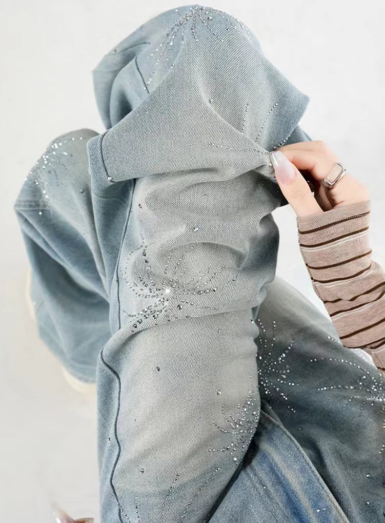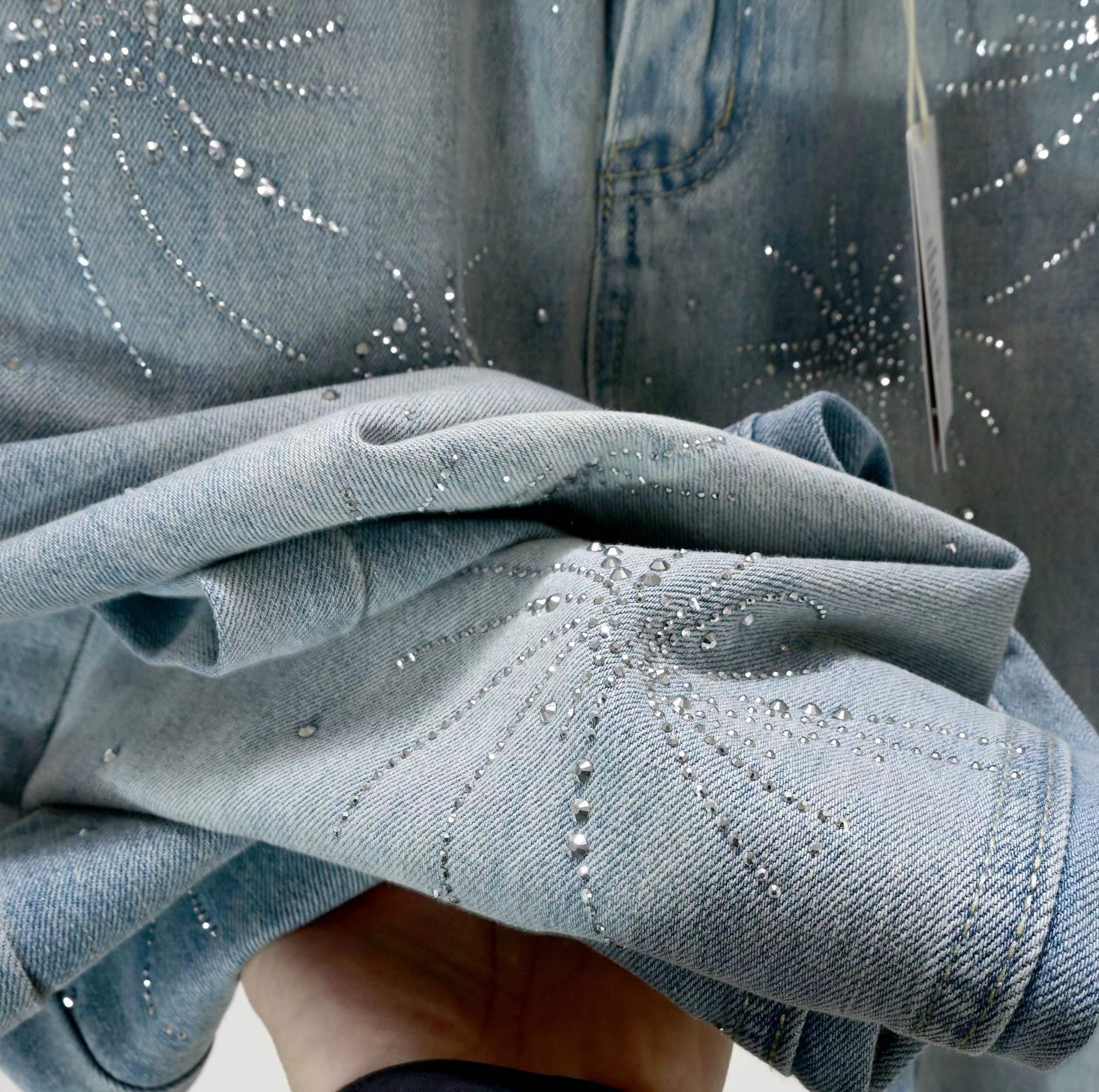 这条阔腿裤选用环保种植棉牛仔,经创新靛蓝染工艺,呈现出如天空般澄澈的浅蓝调,手工烫钻如夜空绽放的烟花,在步履间流转细碎星光,将自然的灵动与都市的jing致巧妙融合,宽松的阔腿剪裁,包容身形,让每一步都自在如风它不仅是一件衣物更是一种与自然共生的生活态度让你在都市丛林中也能寻得内心的松弛与诗意