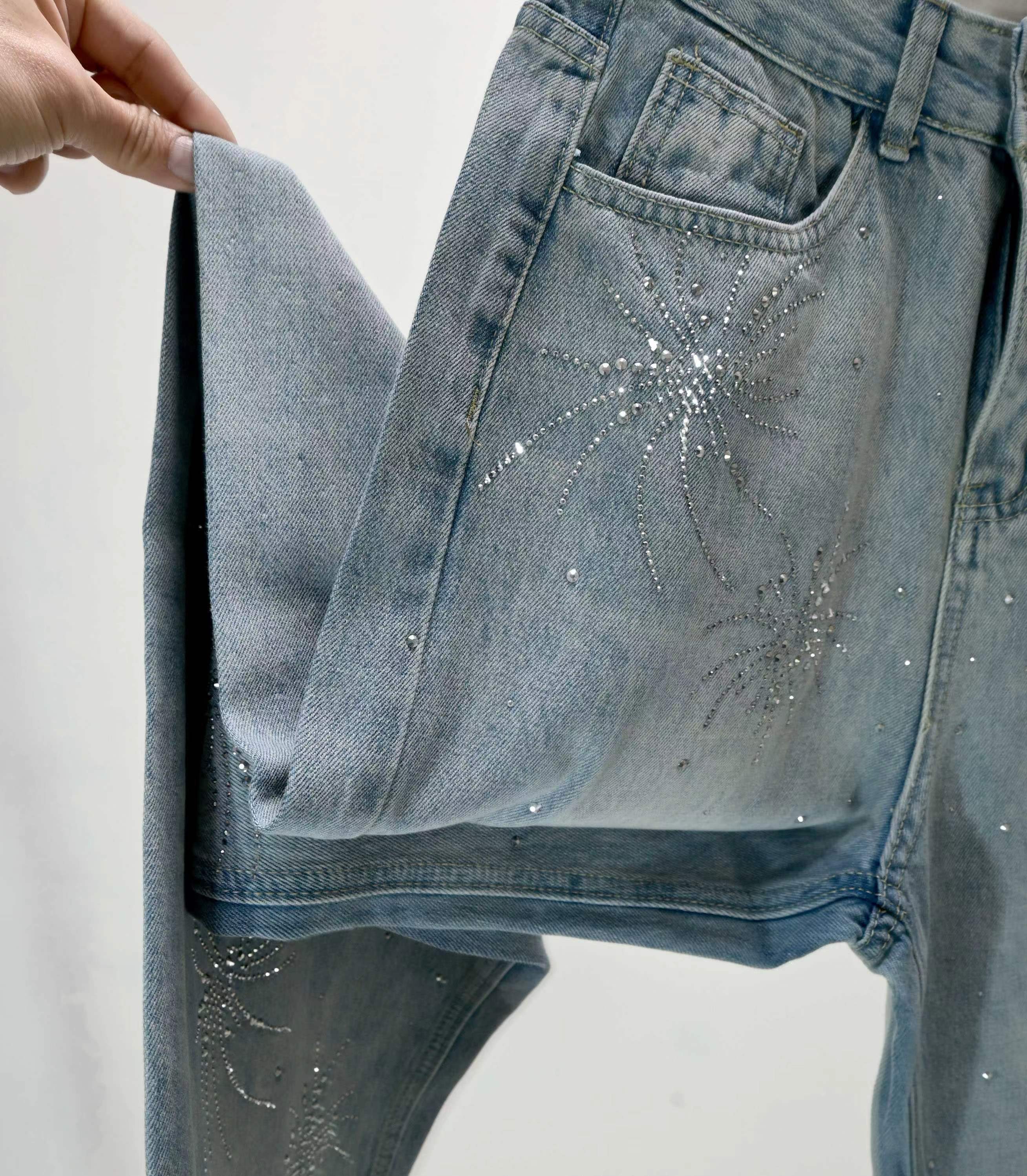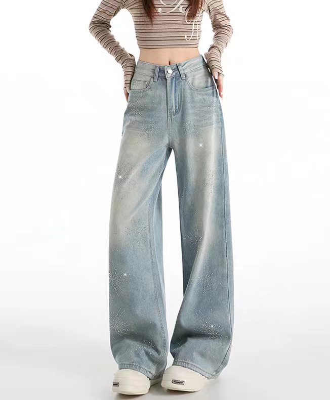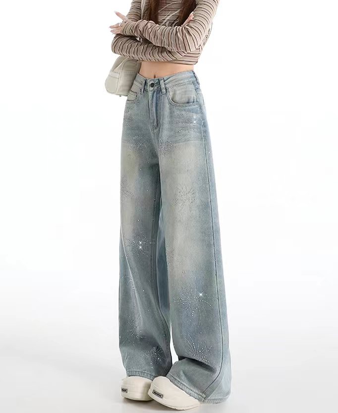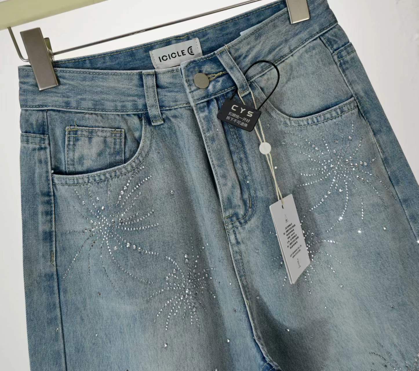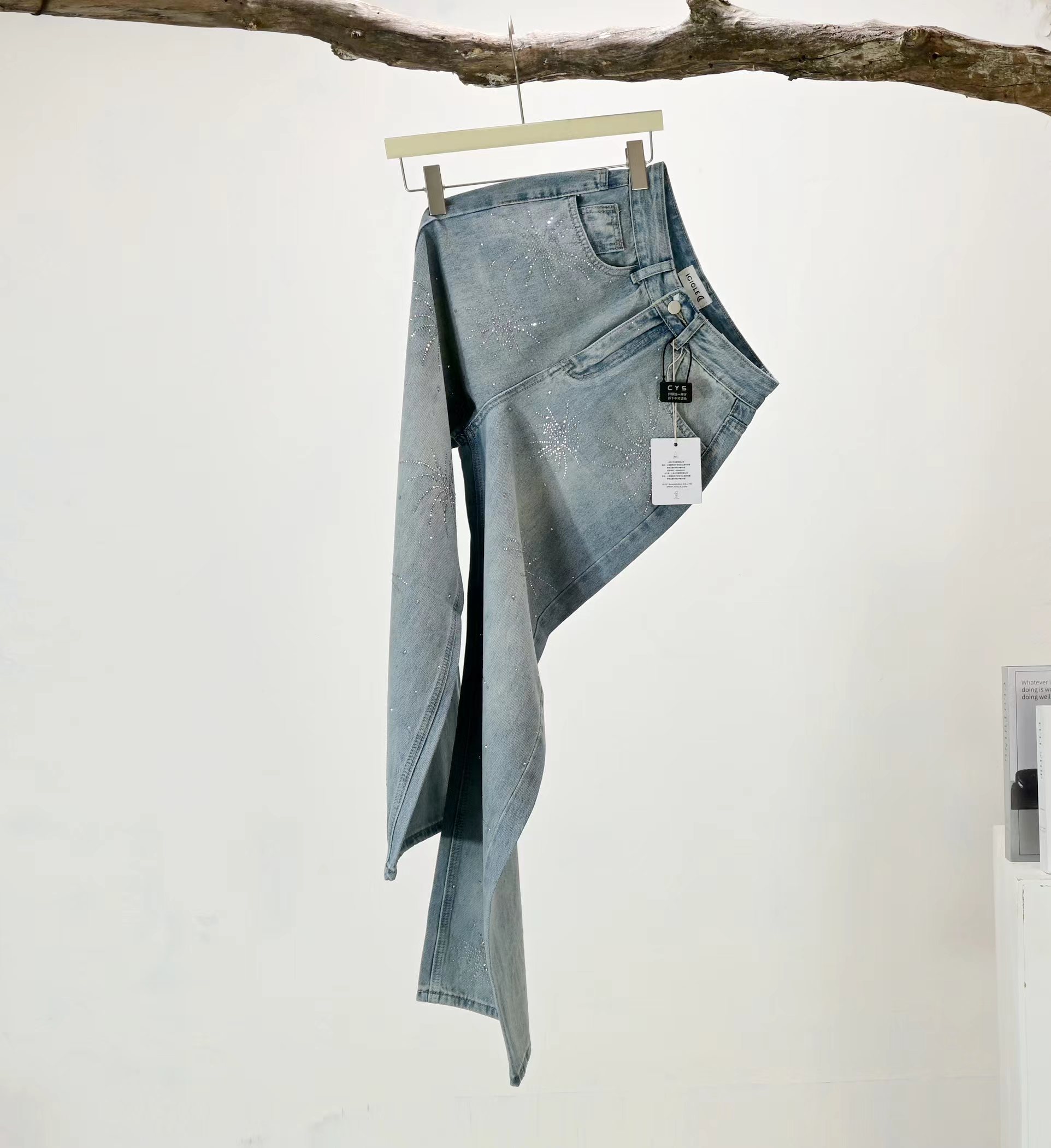 这条阔腿裤选用环保种植棉牛仔,经创新靛蓝染工艺,呈现出如天空般澄澈的浅蓝调,手工烫钻如夜空绽放的烟花,在步履间流转细碎星光,将自然的灵动与都市的jing致巧妙融合,宽松的阔腿剪裁,包容身形,让每一步都自在如风它不仅是一件衣物更是一种与自然共生的生活态度让你在都市丛林中也能寻得内心的松弛与诗意