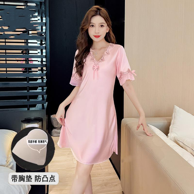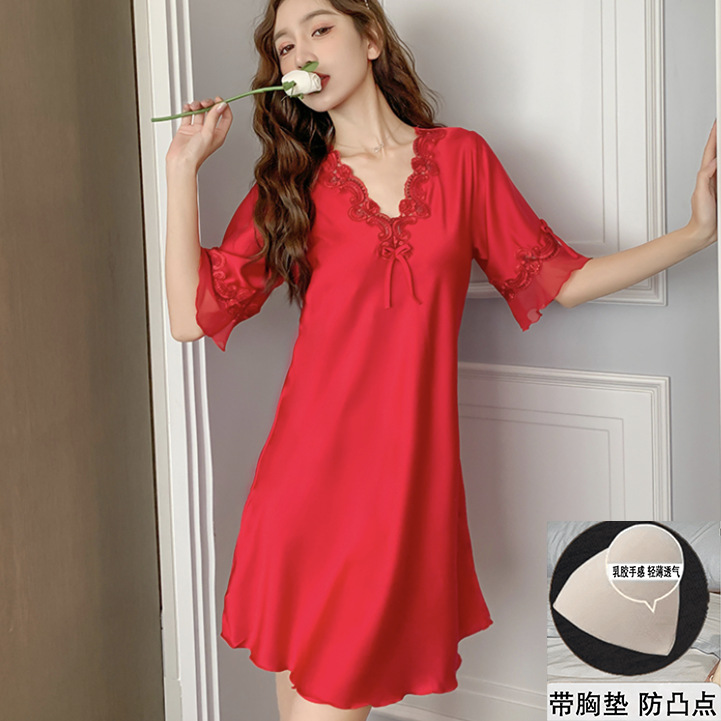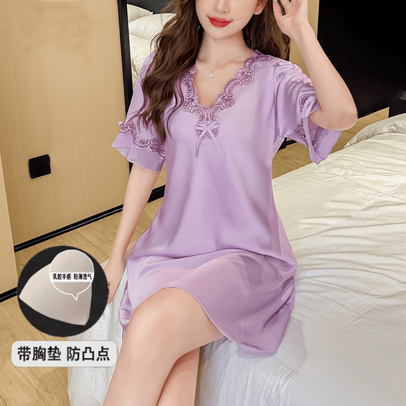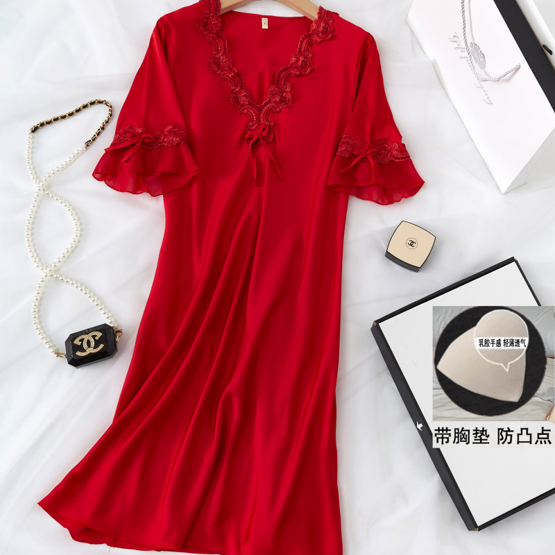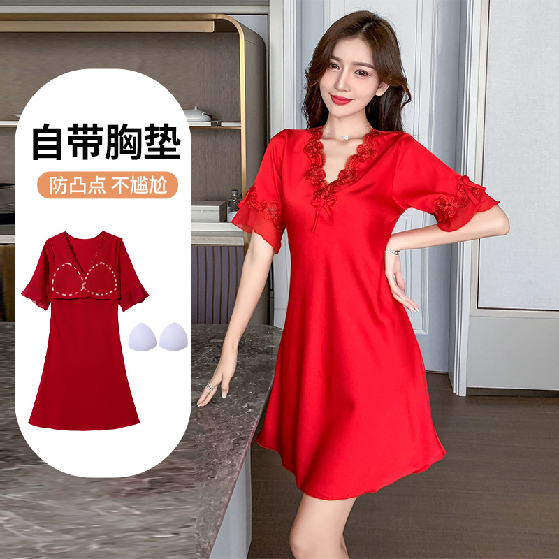 【法式蕾丝❗️带Bra冰丝性感睡裙】质感光泽,气质花边,轻盈舒适,优雅大气!自带胸垫,免穿内衣文胸!女夏一体乳垫丝绸般睡衣可外穿家居