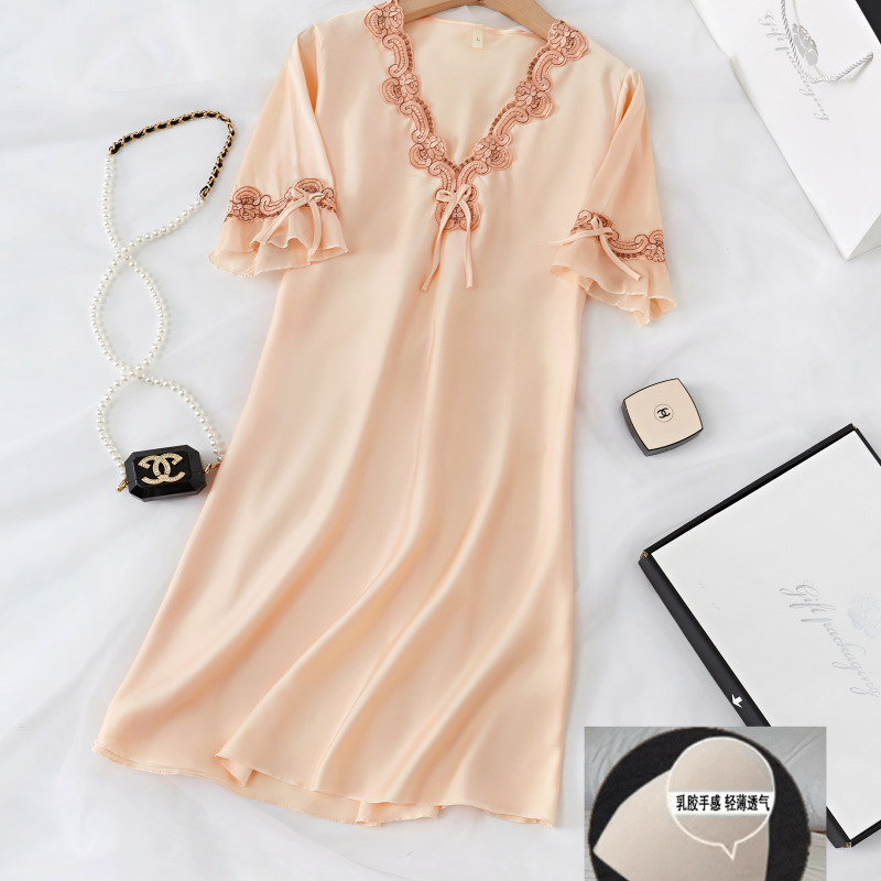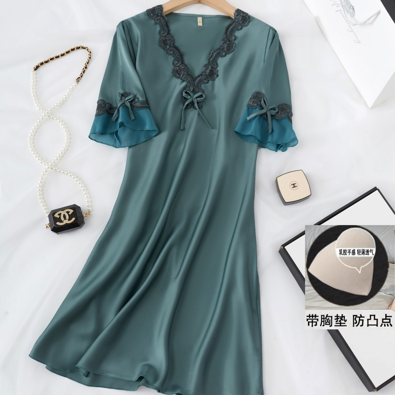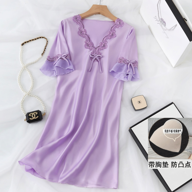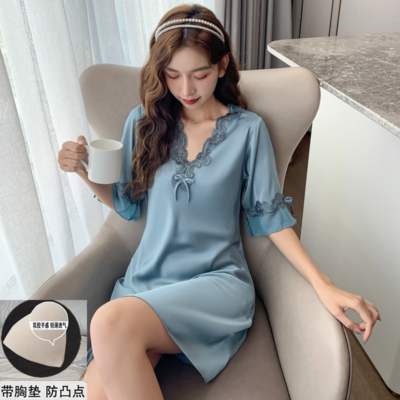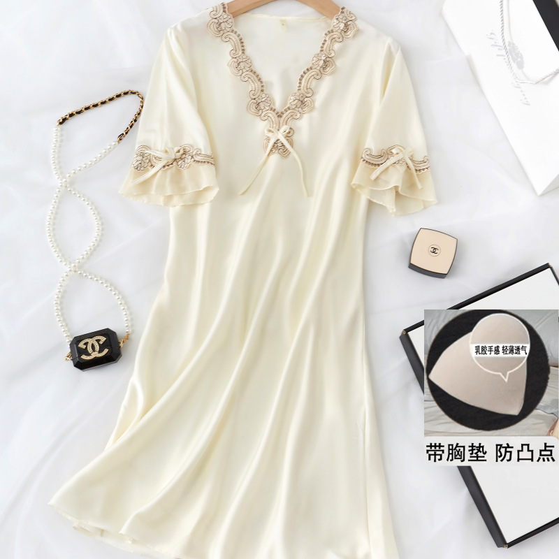 【法式蕾丝❗️带Bra冰丝性感睡裙】质感光泽,气质花边,轻盈舒适,优雅大气!自带胸垫,免穿内衣文胸!女夏一体乳垫丝绸般睡衣可外穿家居