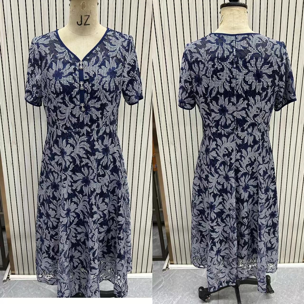 HJ1S69_帝释青色_短袖连衣裙_夏季_简约大方 V 领千鸟格蕾丝提花短袖收腰显瘦_高级女装_BERNIEELEN 伯妮斯茵