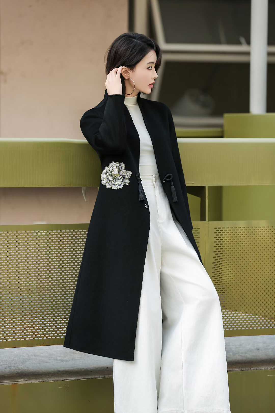 SZ6C10_漆黑色_大衣_秋冬_新中式立领盘扣流苏牡丹刺绣中长款_高级女装_BERNIEELEN 伯妮斯茵